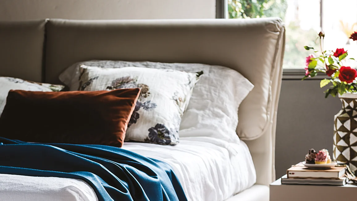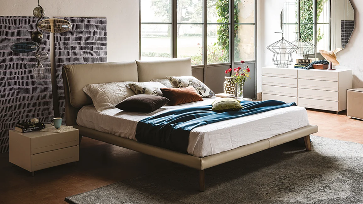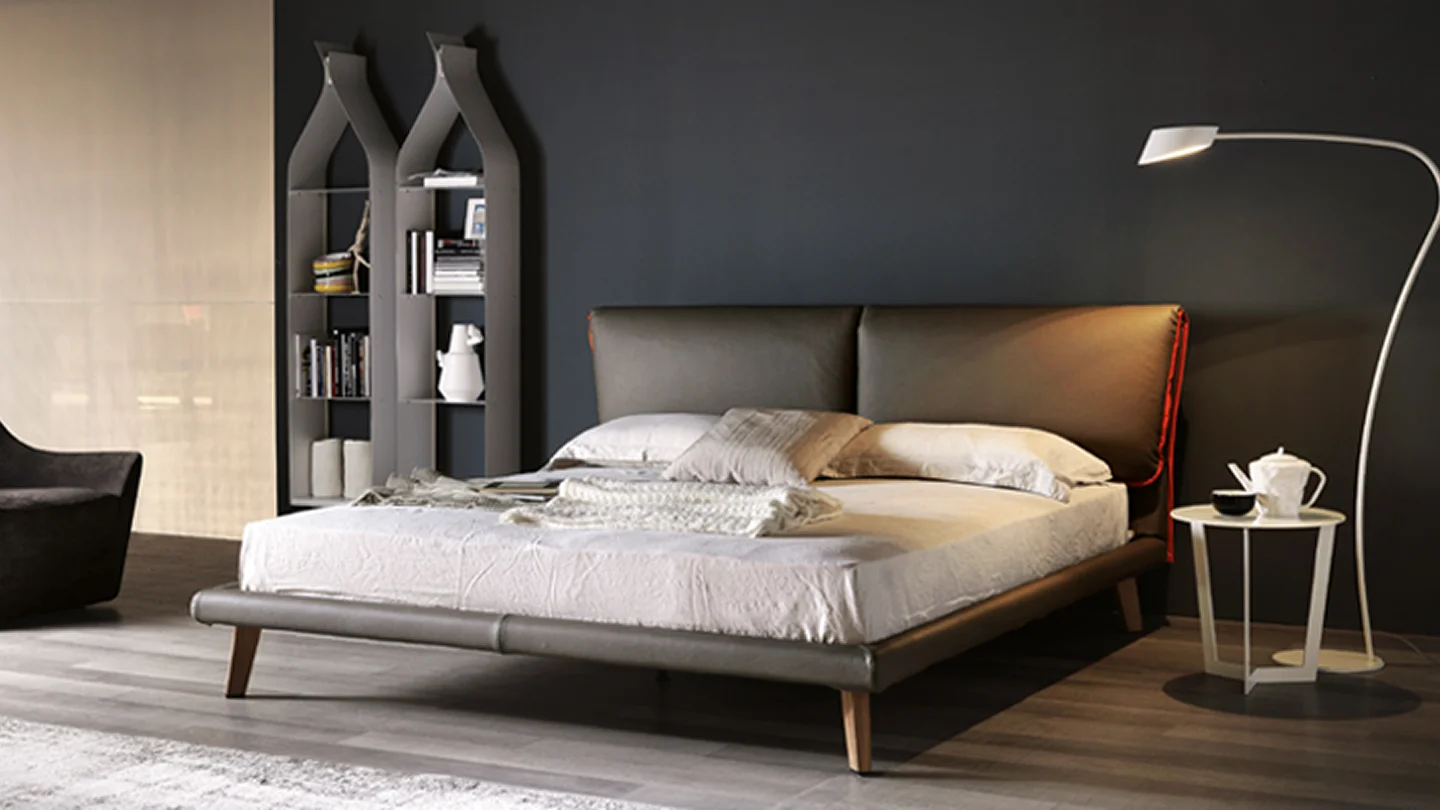 The Adam upholstered bed is a refined and comfortable model, fully covered in a wide and elegant colour palette. The profile outlining the soft headboard can either match the covering or create a contrasting colourful effect, enhancing the silhouette of this modern double bed. It stands out for its spacious and comfortable headboard, consisting of two large curved cushions, and for the design of its wooden feet.The Cattelan Italia collection of designer double beds has been created to furnish a modern bedroom with charming contemporary pieces.