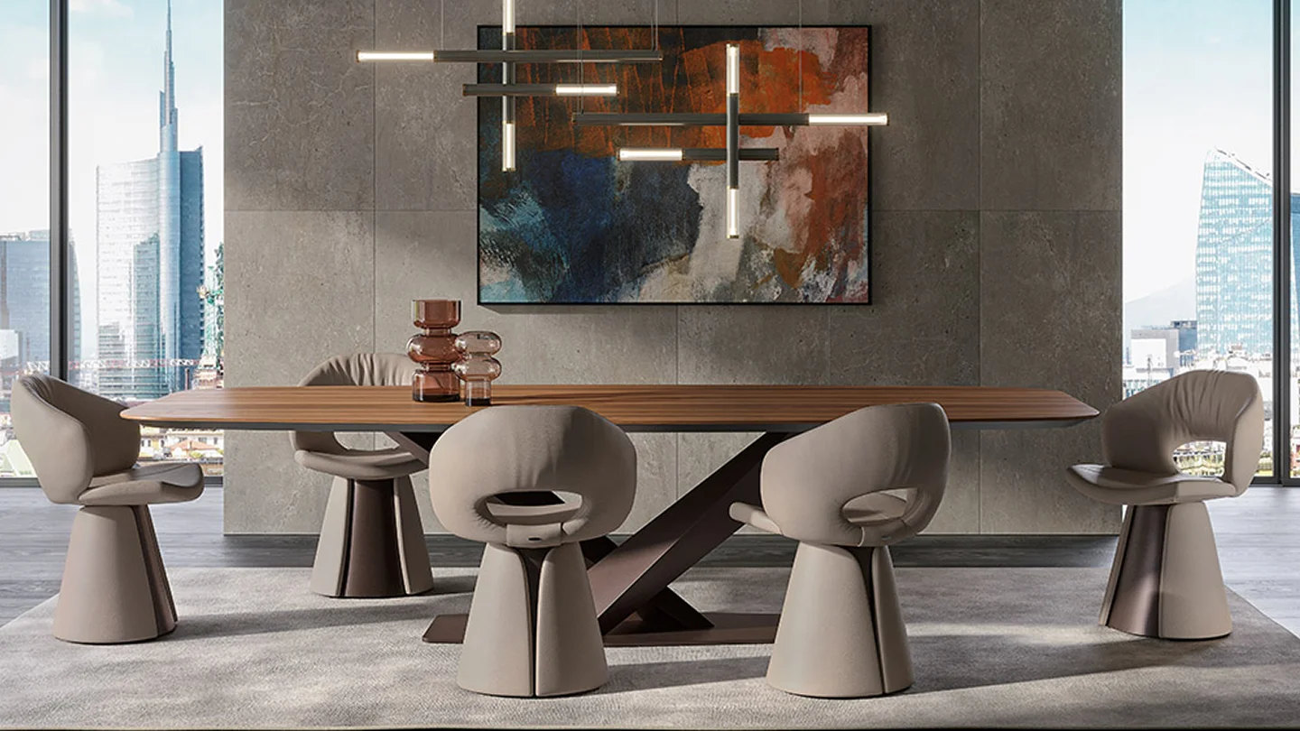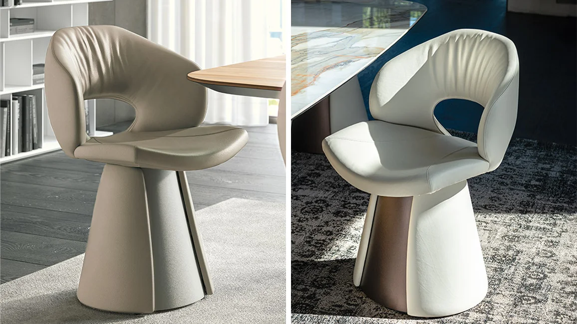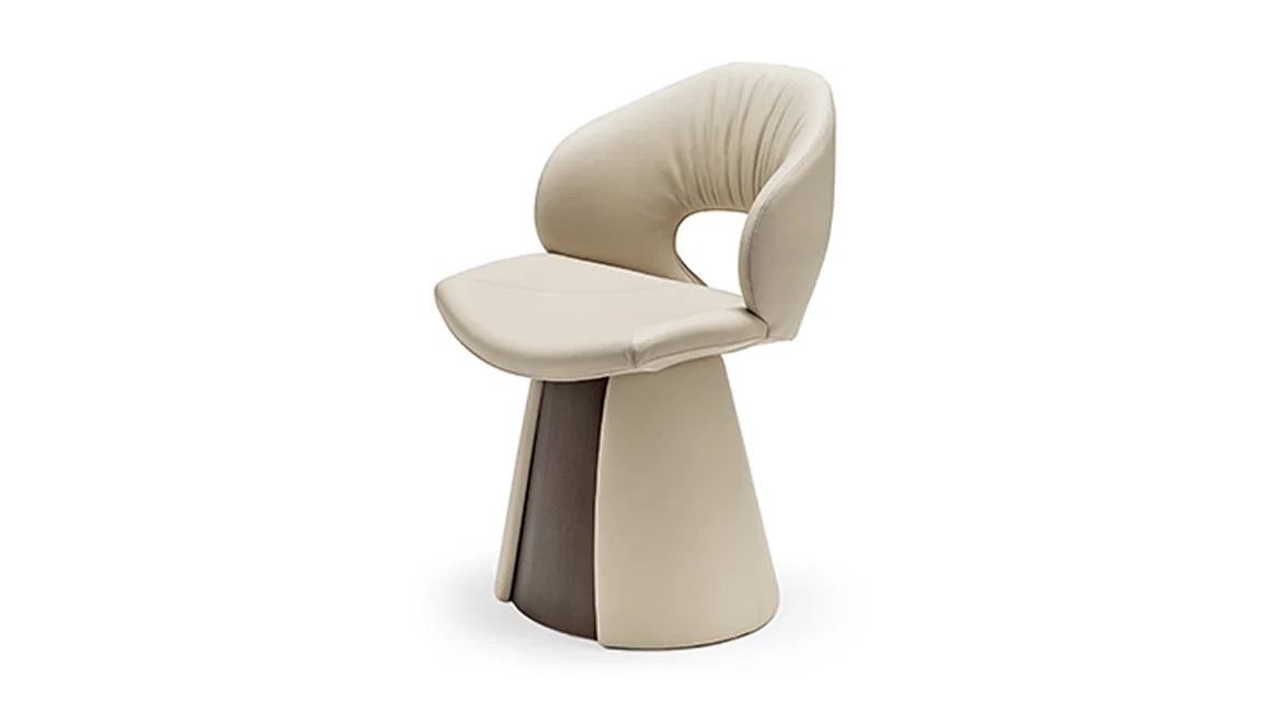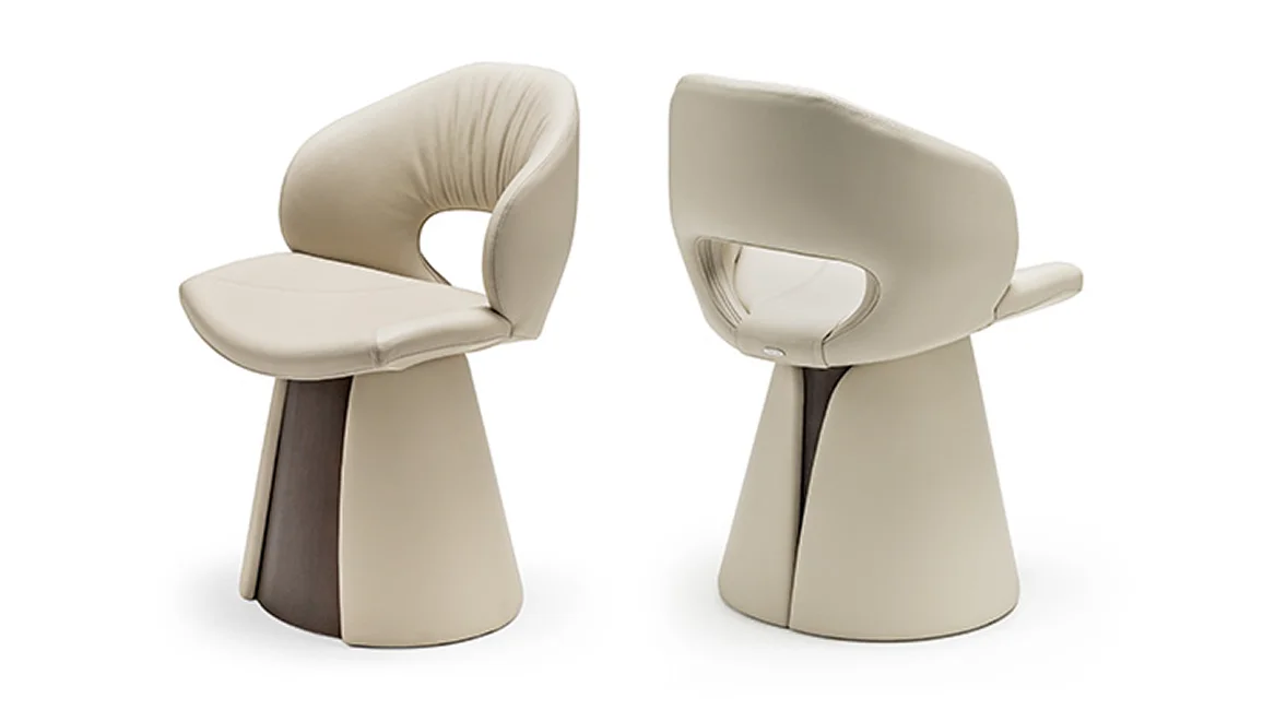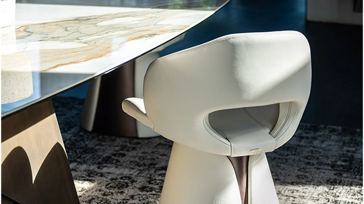 Dafne is a unique and distinctive chair with a perforated backrest that is the result of the creativity and stylistic research carried out by CS LAB. The structures of the cone-shaped base and body are rich in bespoke details, crafted with the utmost care and precision. The upholstery, which can be chosen from a wide range of fabrics and leathers, wraps around the base like a cloak, revealing a brilliantly finished metal breastplate on the front.