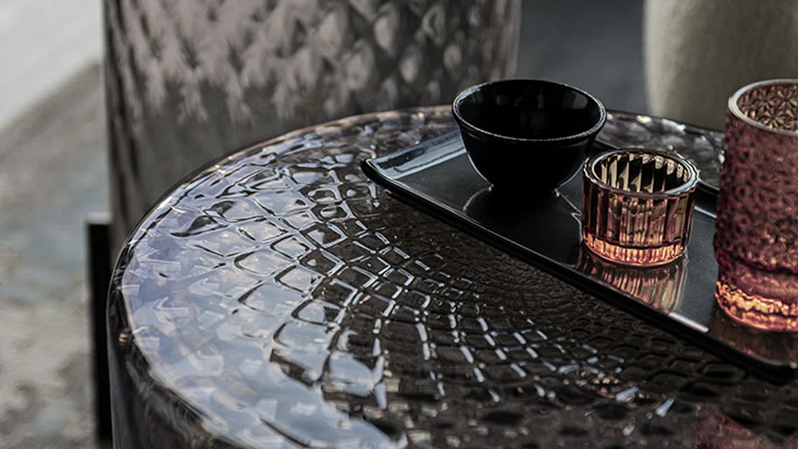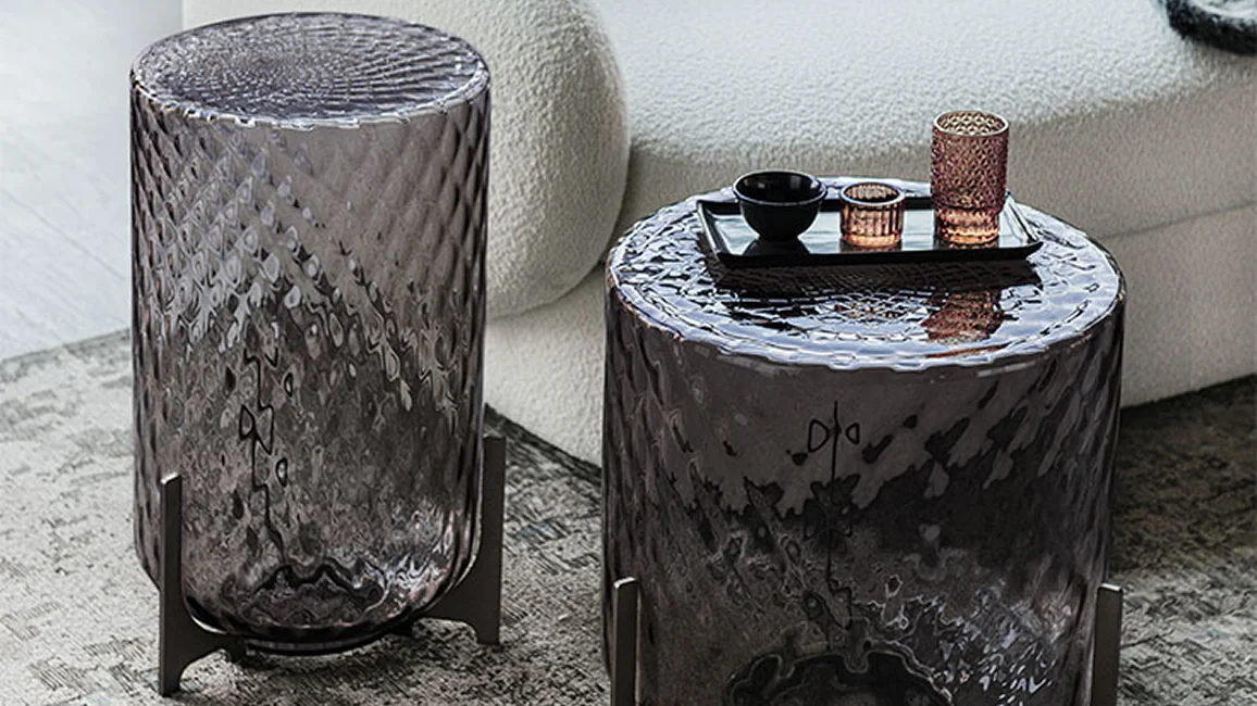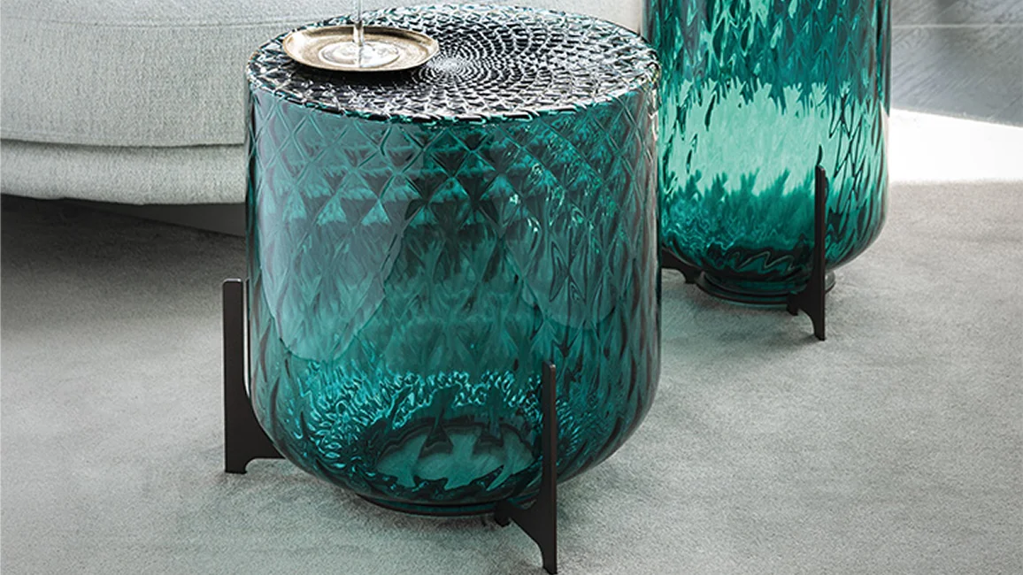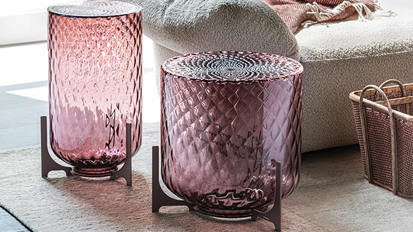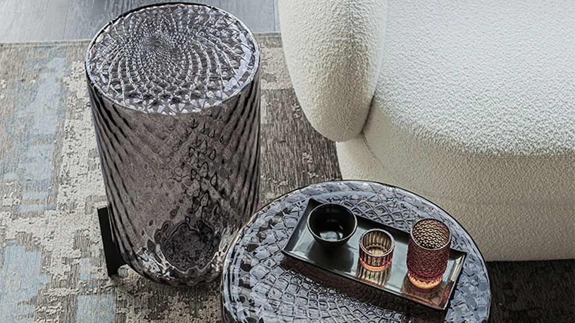 The optical effect is spectacular, further accentuated by the shades in the coloured crystal coffee table. The light reverberates across the even patterns, producing a soft, delicate effect.