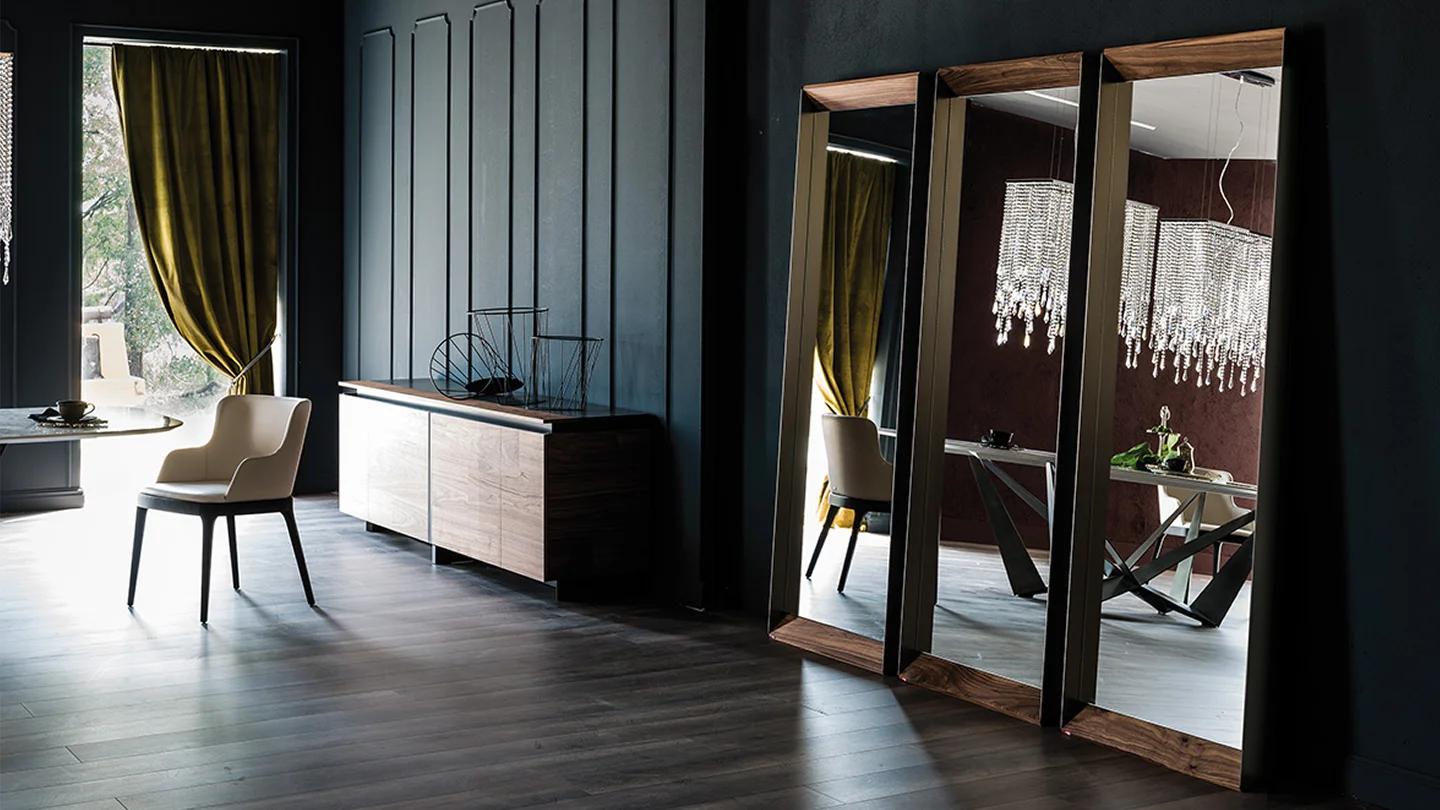 Cattelan Italia design mirrors are a combination of avant-garde techniques and traditional high quality manufacturing. Paolo Cattelan designed the Exaclibur mirror, with a simple and linear shape and fine finishes, thus creating a perfect design mirror to accessorise a contemporary room in a refined style. Excalibur can be hung as a vertical or horizontal modern mirror, or placed on the ground, depending on the needs.