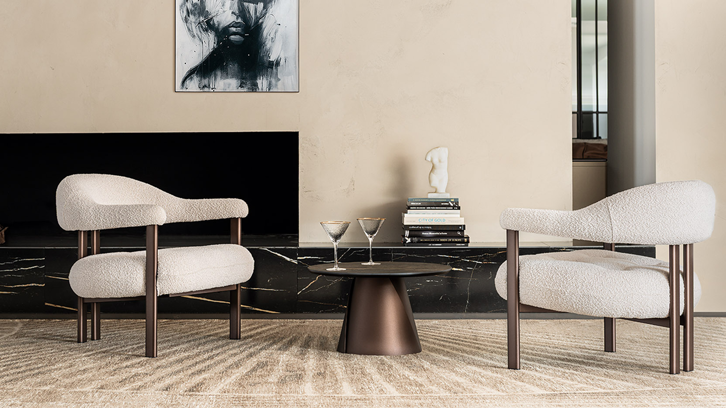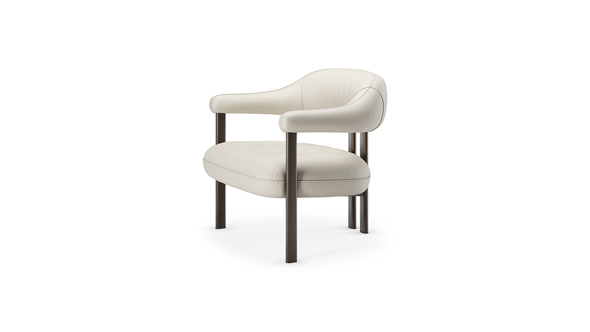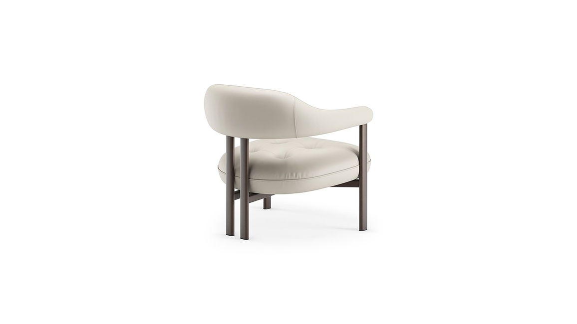 An intriguing interplay of contrasts is created between the seat and the base, superimposing soft and metallic materials, solid and empty volumes, cosy and sharp contours.