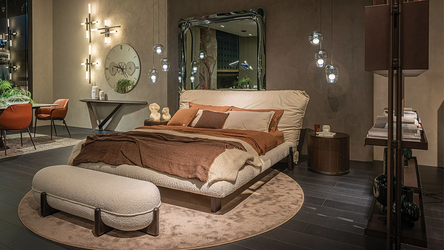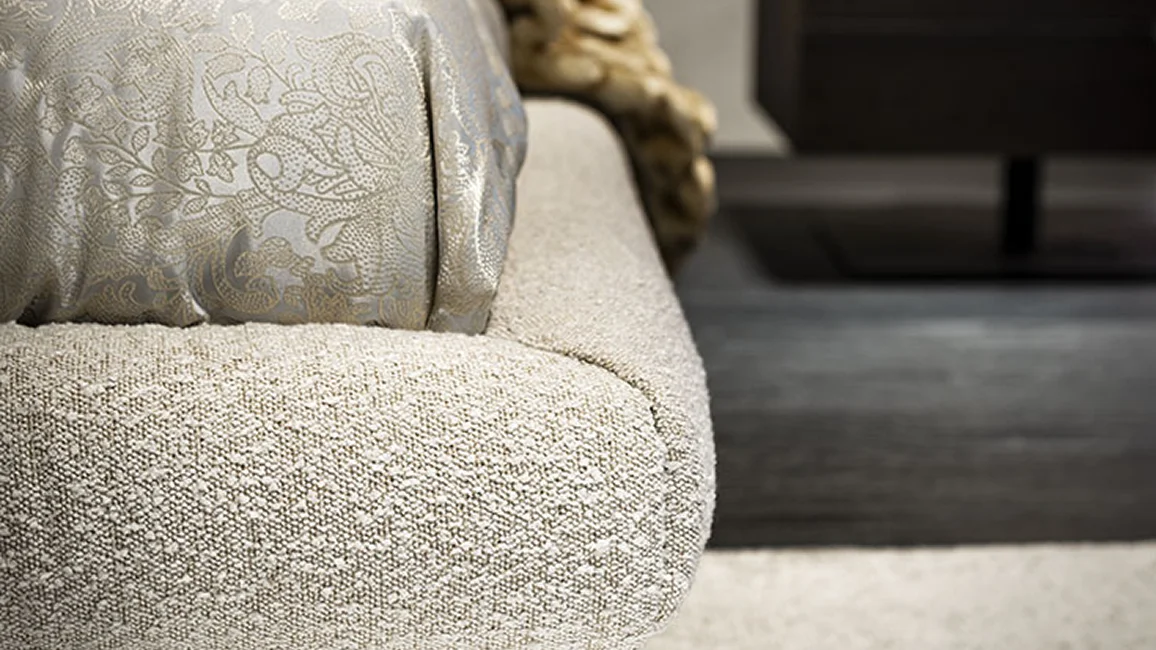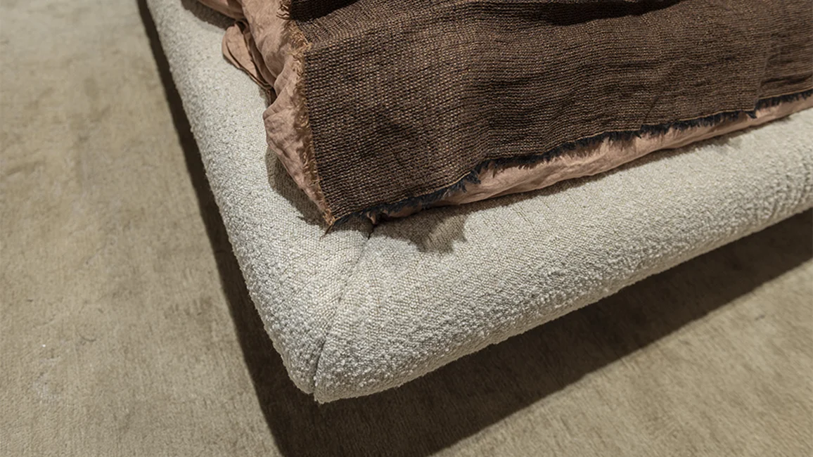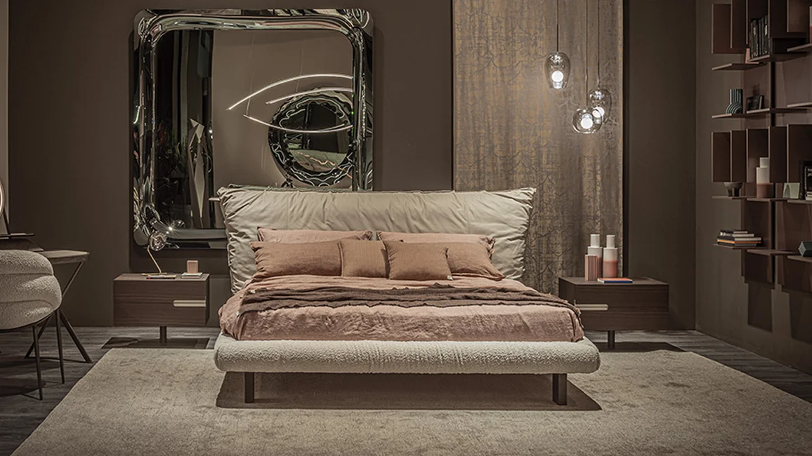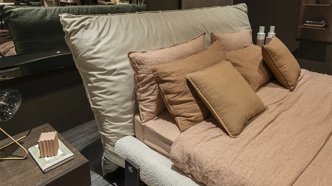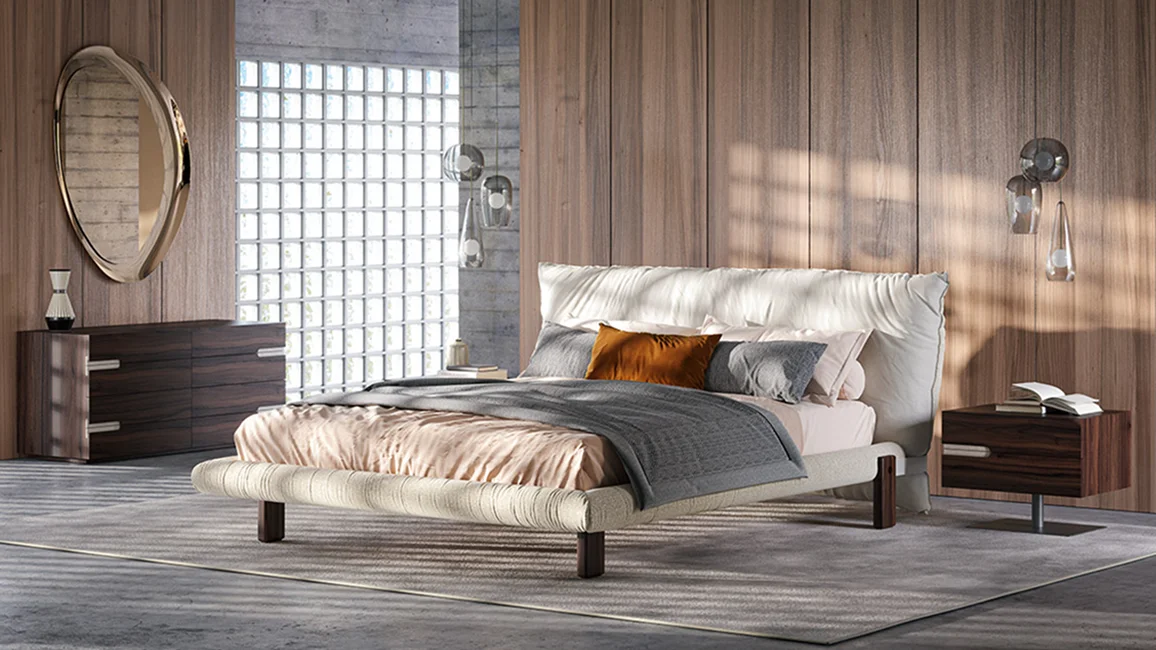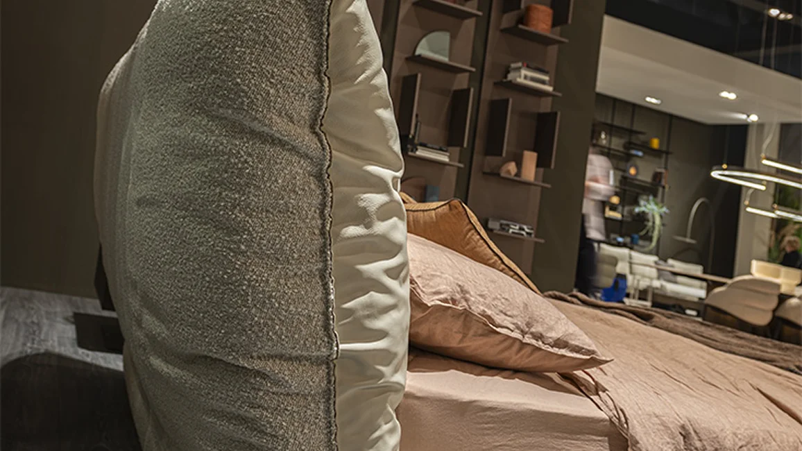 The Pascal designer double bed owes its imposing stage presence to its large headboard, made up of a single large bolster, designed for relaxing moments before falling asleep, with your back gently resting on its soft upholstery. The headboard can be finished in a wide choice of leathers and fabrics, either all in one or combining different materials on the front and back, to play with different colour tones.