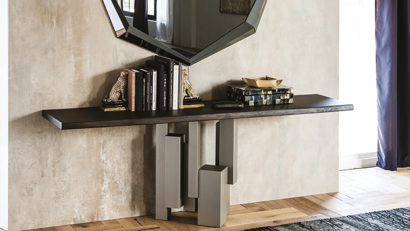 The Skyline family includes numerous design tables models and fascinating modern consoles. Its design draws inspiration from metropolitan buildings, which decorate the horizon with slender lines and three-dimensional volumes. The laquered steel base reflects the light from different angles, creating a contrasting effect which varies according to the ambient lighting.