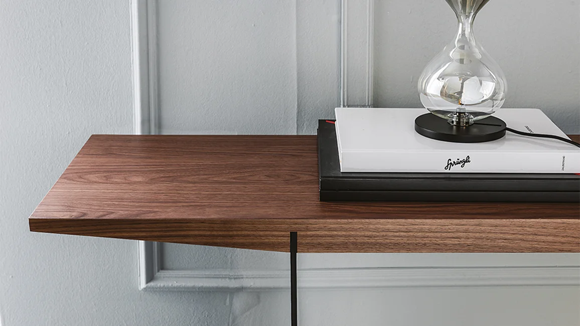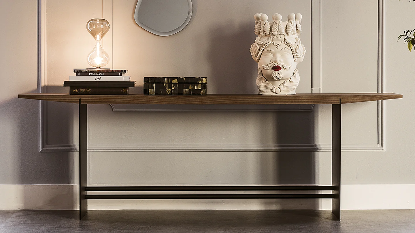 Also perfect for furnishing an entrance hall, the design console Trevi is a functional piece of furniture that adapts in a versatile way to different rooms and household needs. From a stylistic point of view, Trevi stands out for the care taken in its design and the quality and selection of its raw materials. This modern wooden console features a refined shaped top with different thicknesses, supported by the painted steel base, the smooth industrial surface of which creates a pleasant contrast with the natural grain of the wood.
