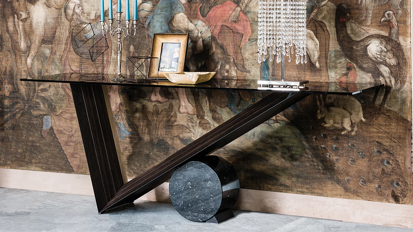 Emanuele Zenere designed the first model of the Valentino table in 1991. The product family expansion started at first with the Valentinox table and kept growing with two other omonimous console tables. The sculptural base combines volumes that seem to balance and support each other, while the glass top enlightens the different materials combination. The original design of this modern dining table, later used to conceive the Valentino wooden console table, presents a V-shaped volume made of precious wood essences, which lays on a marble cylinder. While the Valentinox console table and glass table, have a polished stainless steel V-shaped base.