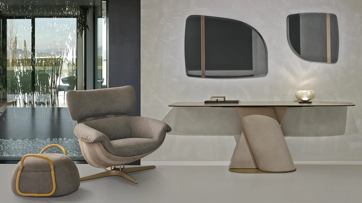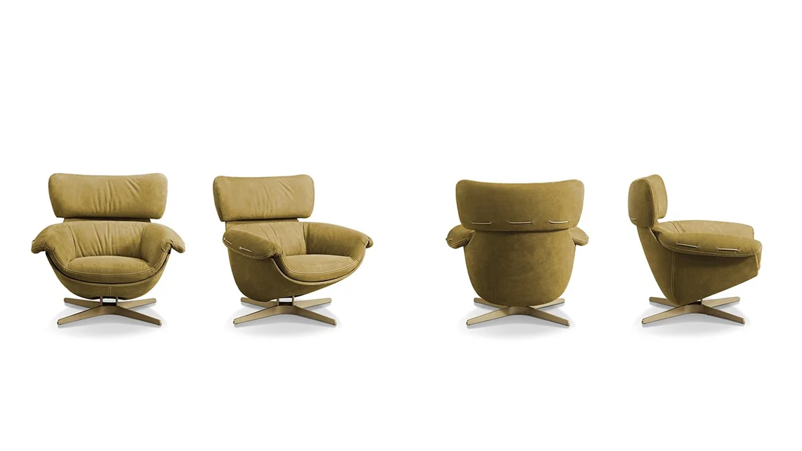 The Jackie swivel armchair has an outstanding combination of differing densities of polyurethane for supreme levels of comfort. The rotund cold-foam frame and large curved headrest not only ensure a sophisticated sleek silhouette, but also provide immense ergonomic support.