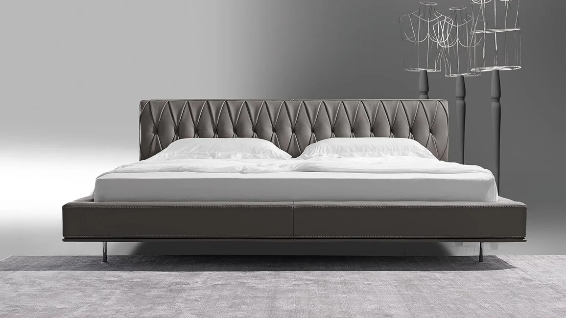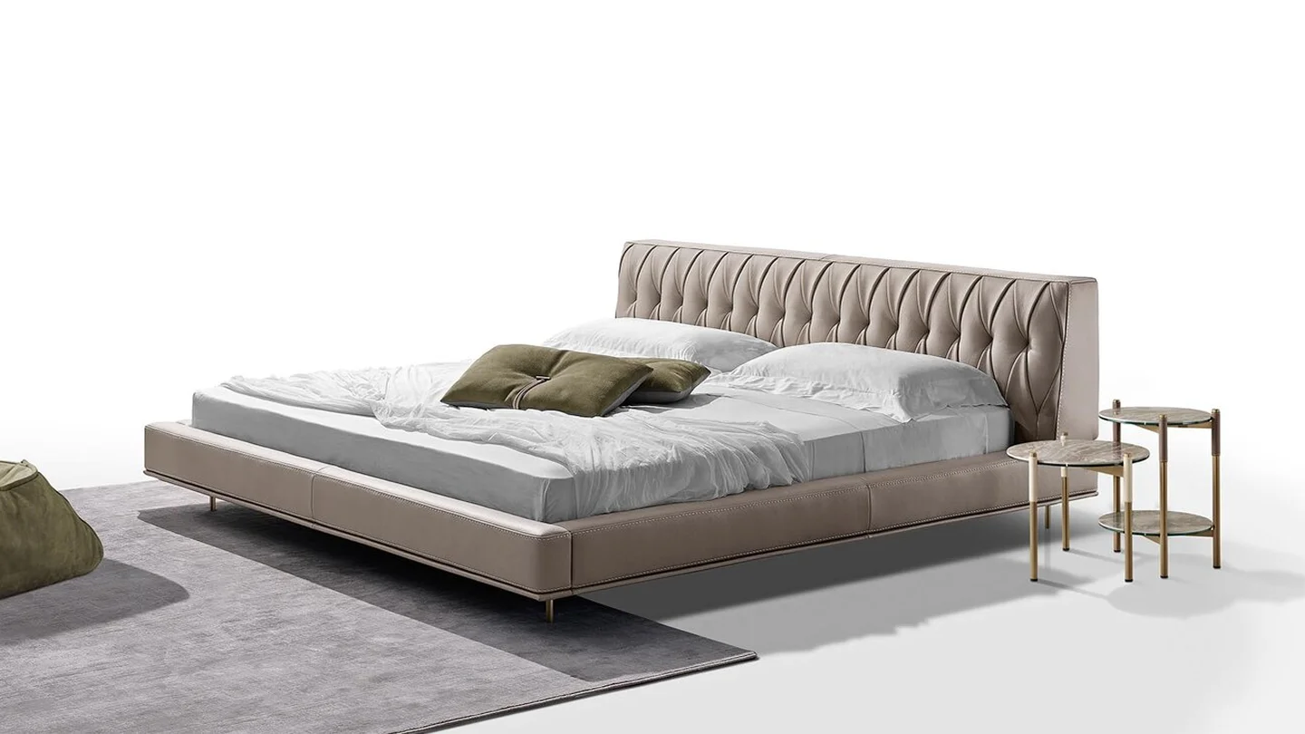 It has a subtle silhouette with harmonious proportions and an exquisitely hand-made padded headboard which reveals all the expertise of Italian artisans. The tufted detailing and classic upholstery have been reworked in a modern style, whilst the slender linear base around the bed is slightly raised off the ground by delicate metal feet: curated design features that counterpoint the austere spirit of this bed to great effect.