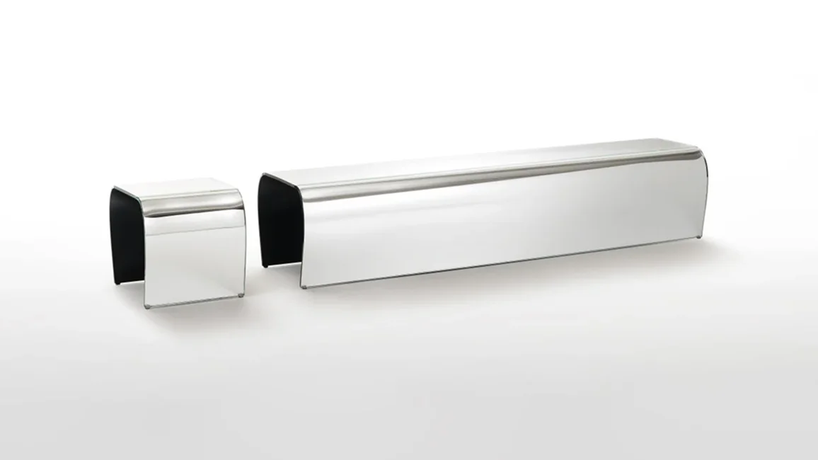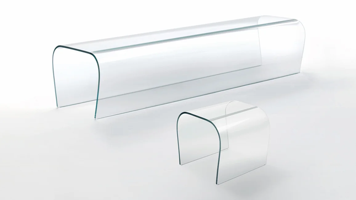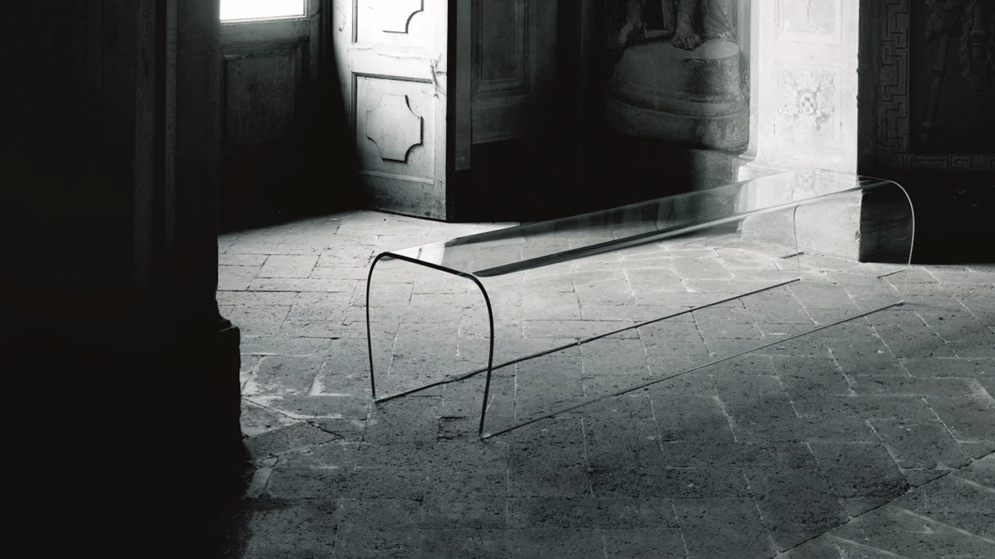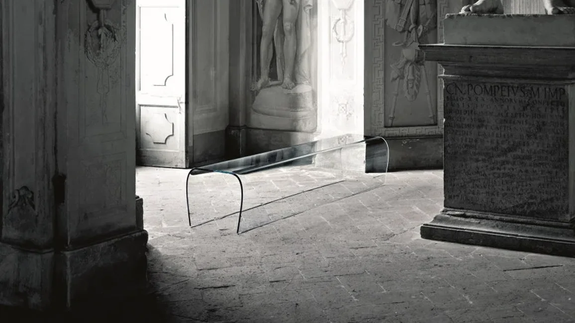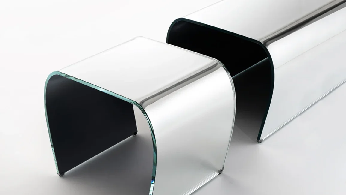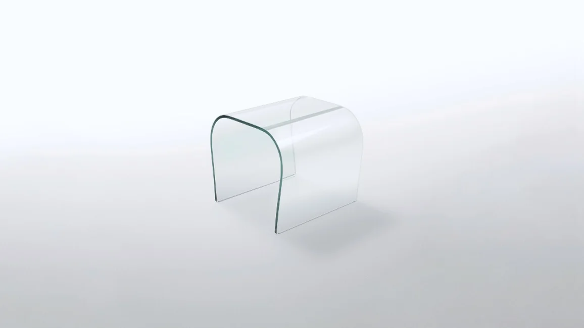 Bench and stool with an aspect of natural simplicity, made from shaped and curved 15 mm thick transparent extralight glass. The particular glass curvature endows the glass with an important load resistance. It is also available a version in silver glass with a precious appearance.