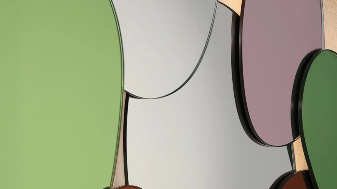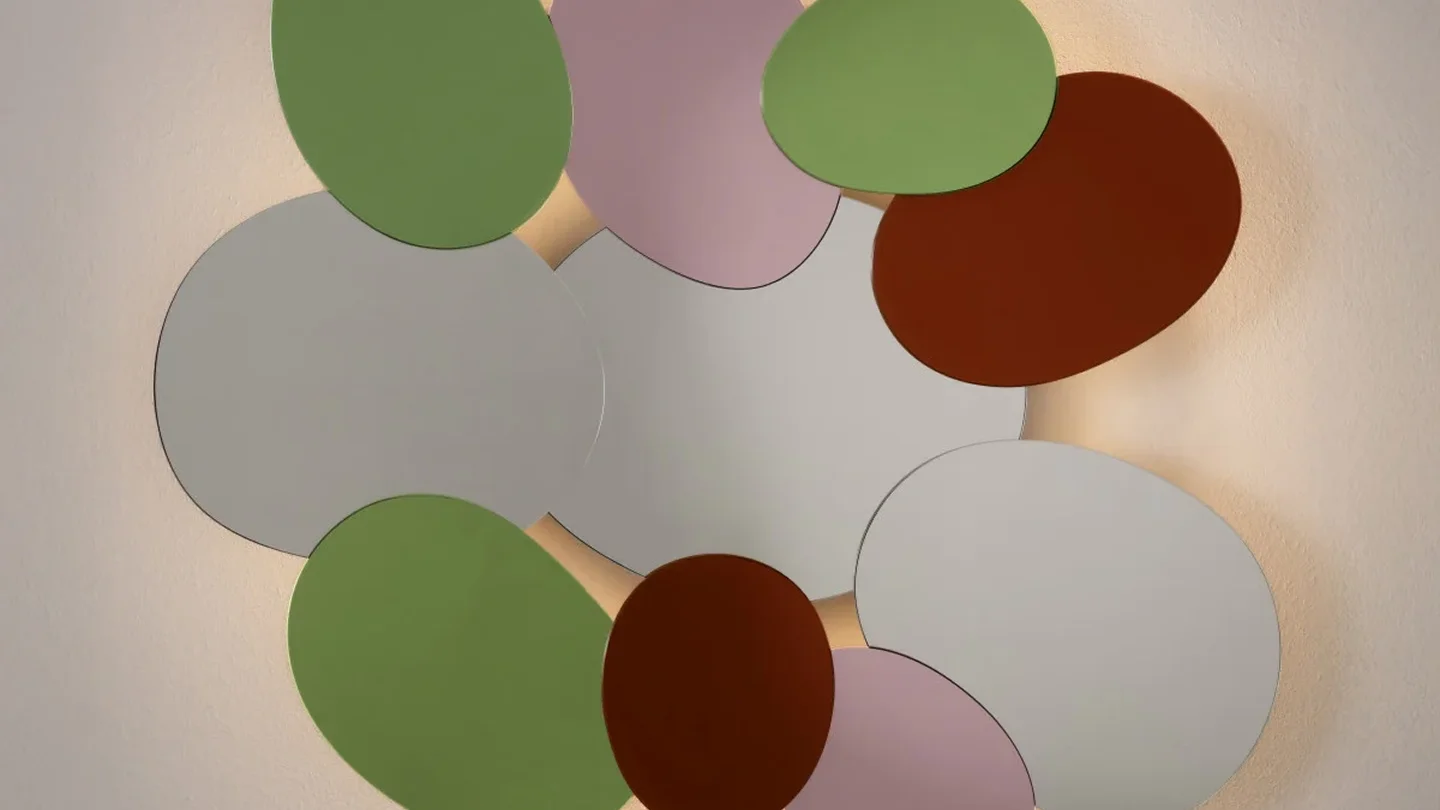 Wall composition consisting of 10 irregular ovoid mirrors, in different shapes, dimensions and colours, partially overlapped and fixed to each other. A panel with multiple hooks allows the mirror to be hung and oriented in any direction. It is available with or without dimming lighting system, which diffuses a soft luminous backlit corona.