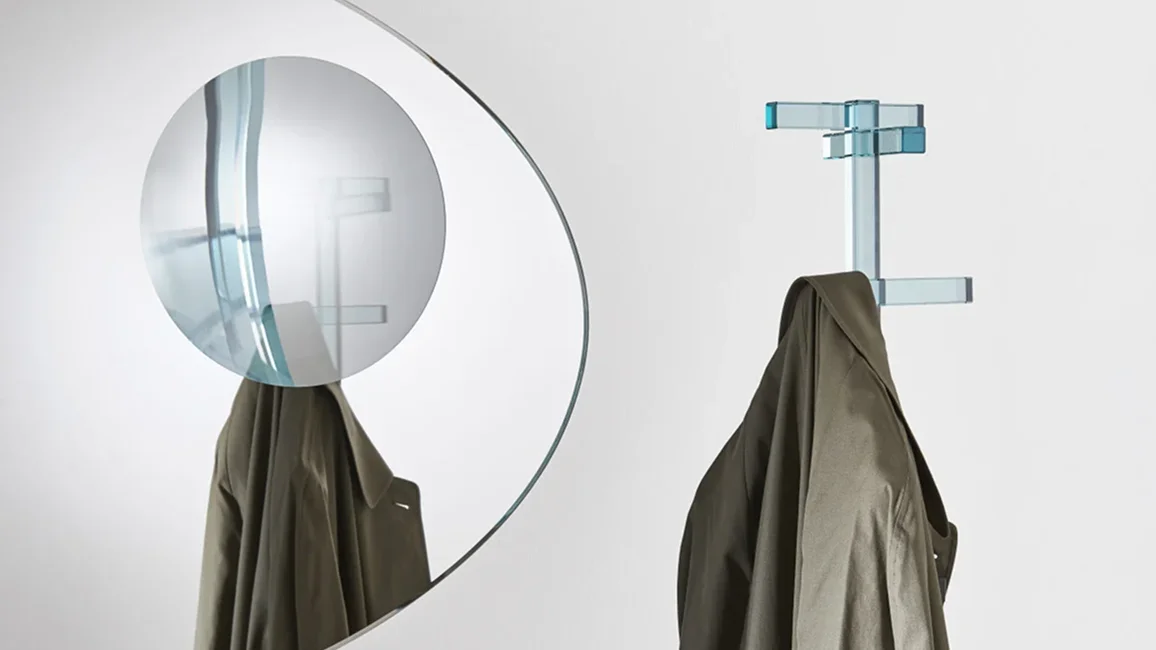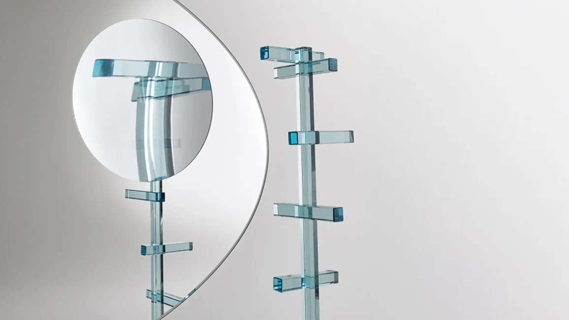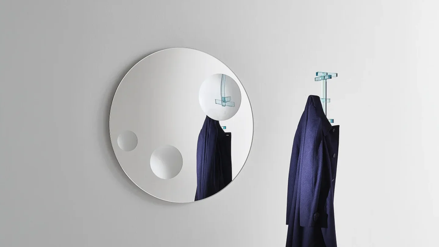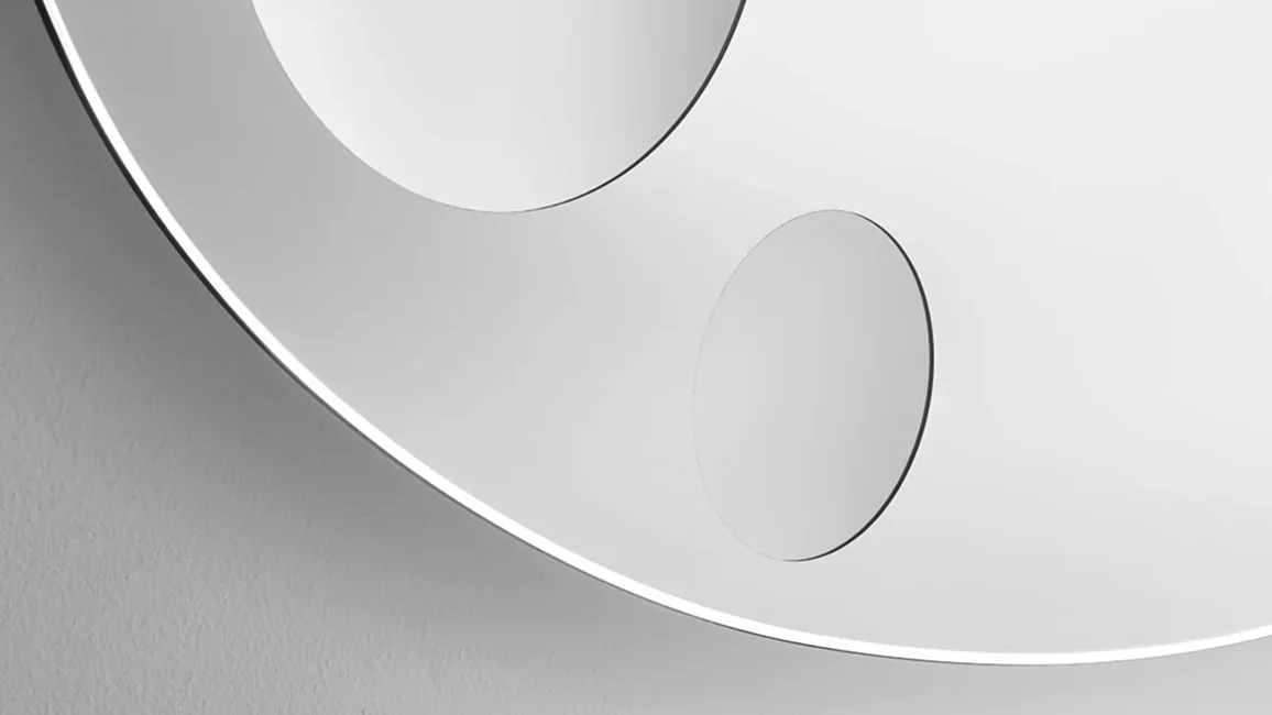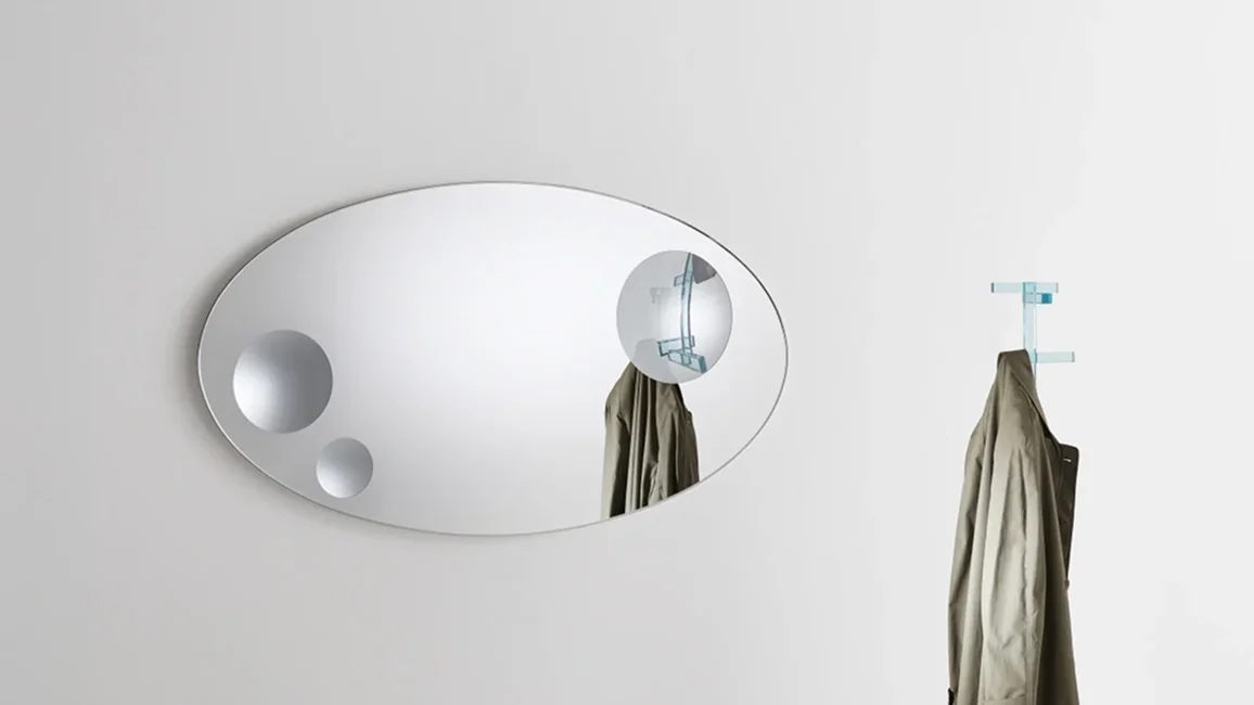 5 mm mirror available in round or oval shapes. The mirror assumes a magnetic aspect creating surreal effects thanks to three magnifying portholes with each porthole having a different diameter and different degree of magnification. The mirror has a delicate bevelled edge on its perimeter to refine and enhance the beauty of this object.