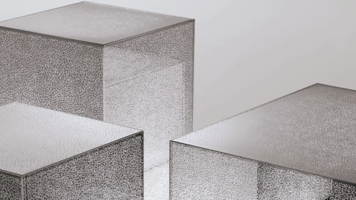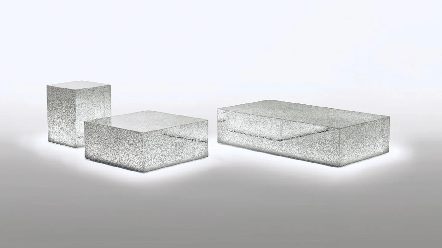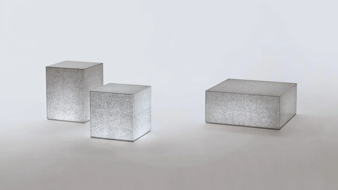 Collection of low tables with dimmer light with parallelepiped shape, in glass glued at 45°, with shattered mirror effect decoration separated by thin white luminous lines.