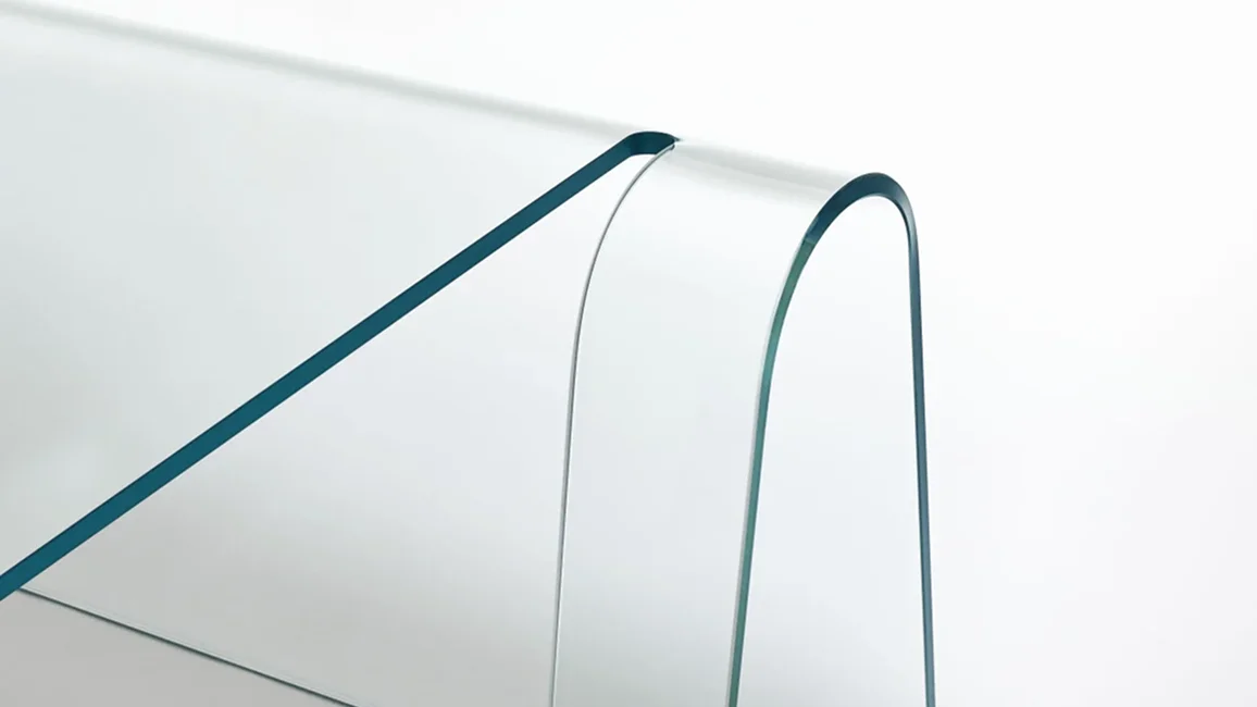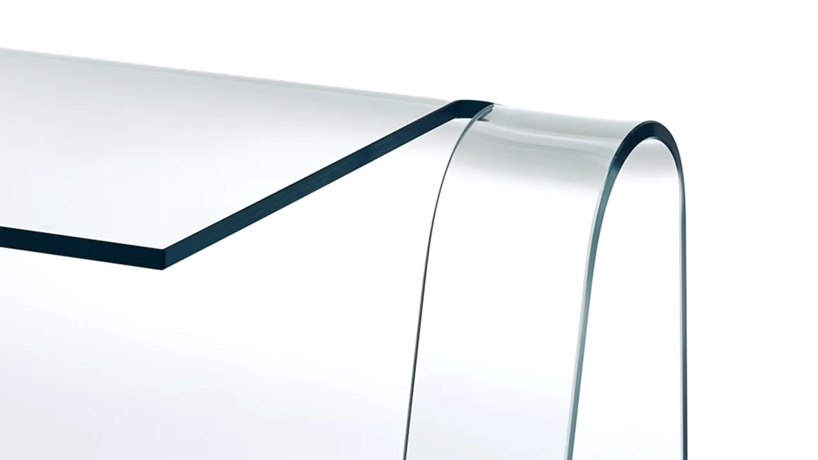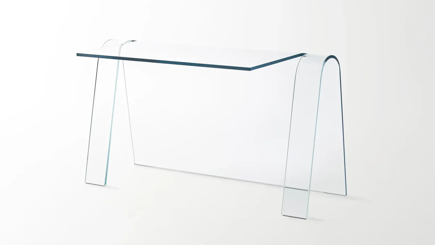 Elegant and simple desk made with a single sheet of transparent 15 mm thick extralight curved glass.The graceful curves and the attention to detail convey and emphasize the intrinsic qualities of the material.