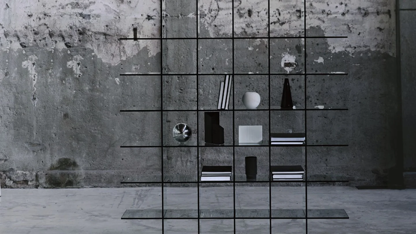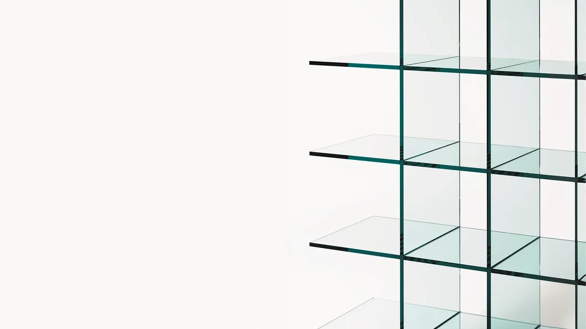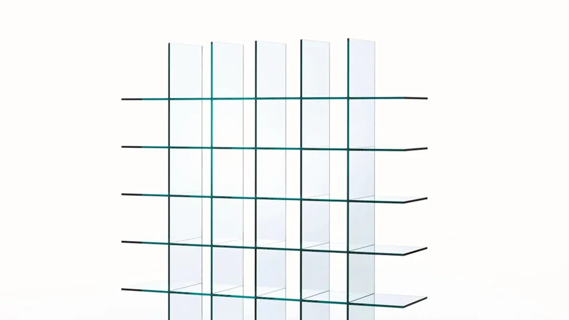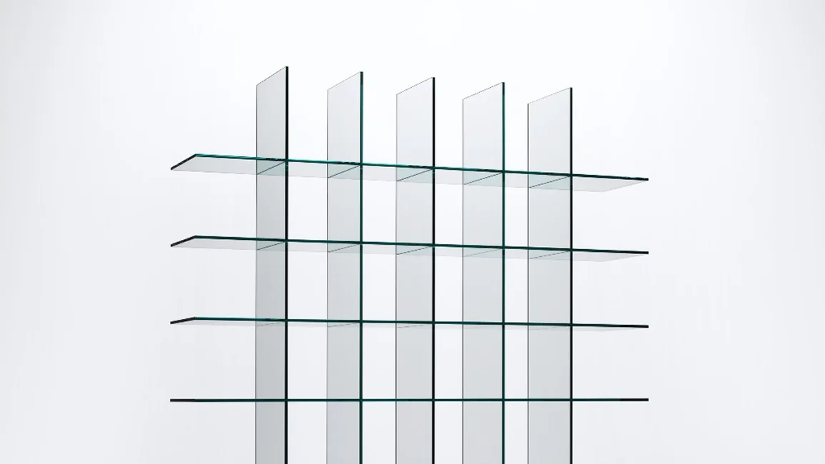 Bookcase characterised by the extraordinary formal cleanness and the golden proportions, entirely realized in thermowelded 12 mm thick transparent glass, without the aid of any foreign element. Historical and iconic product of the international design, designed in 1976 by the great master Shiro Kuramata.