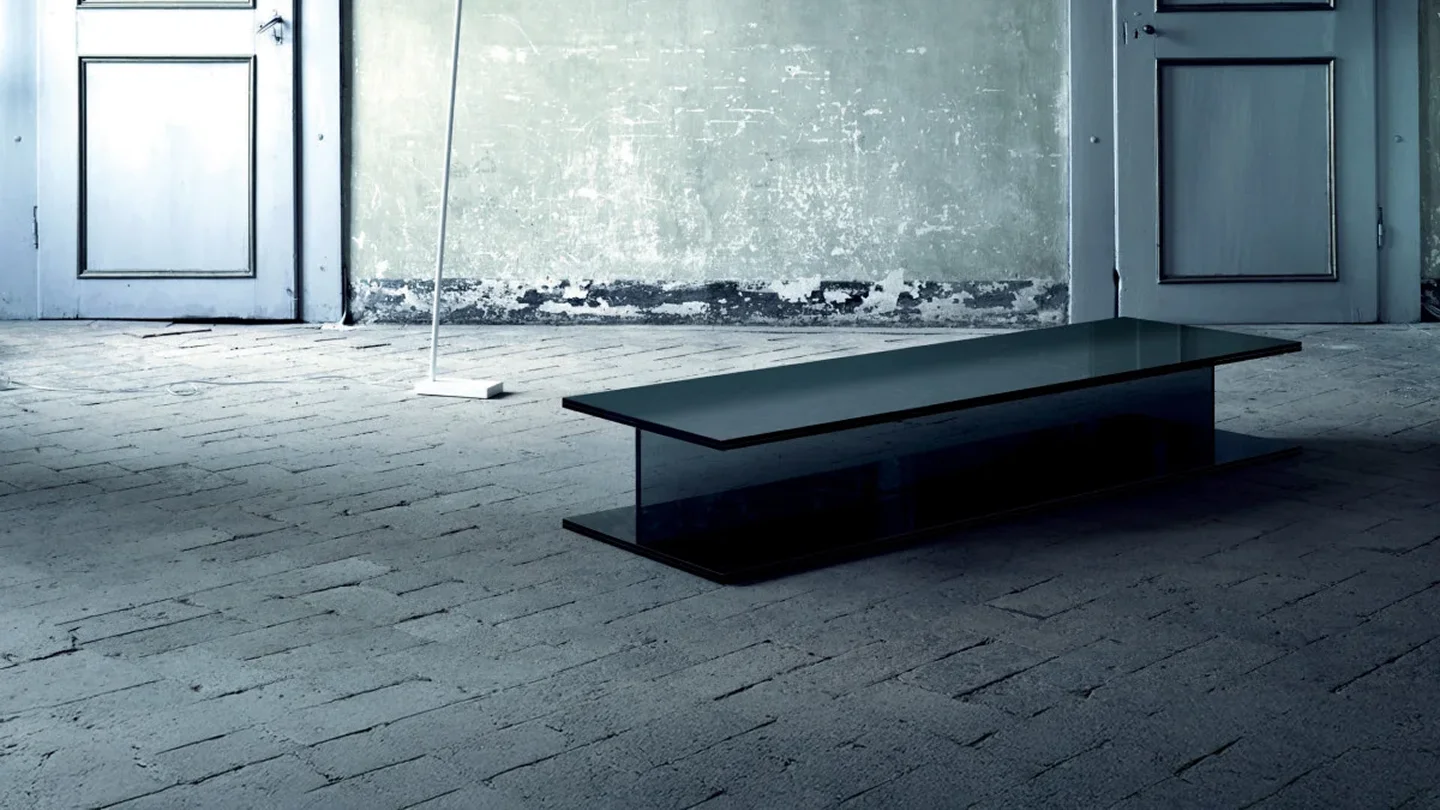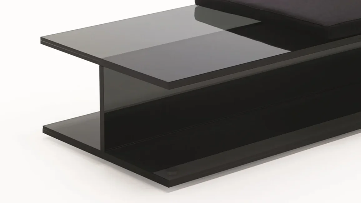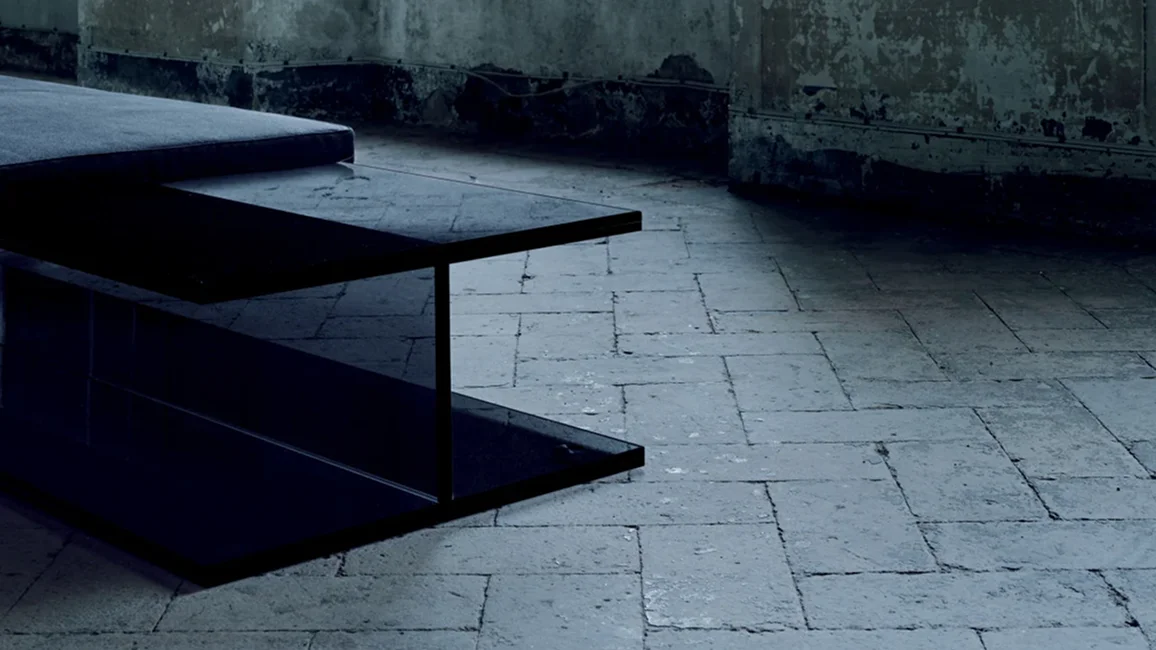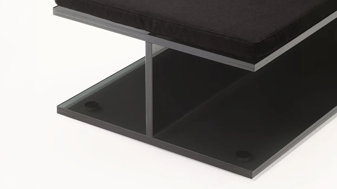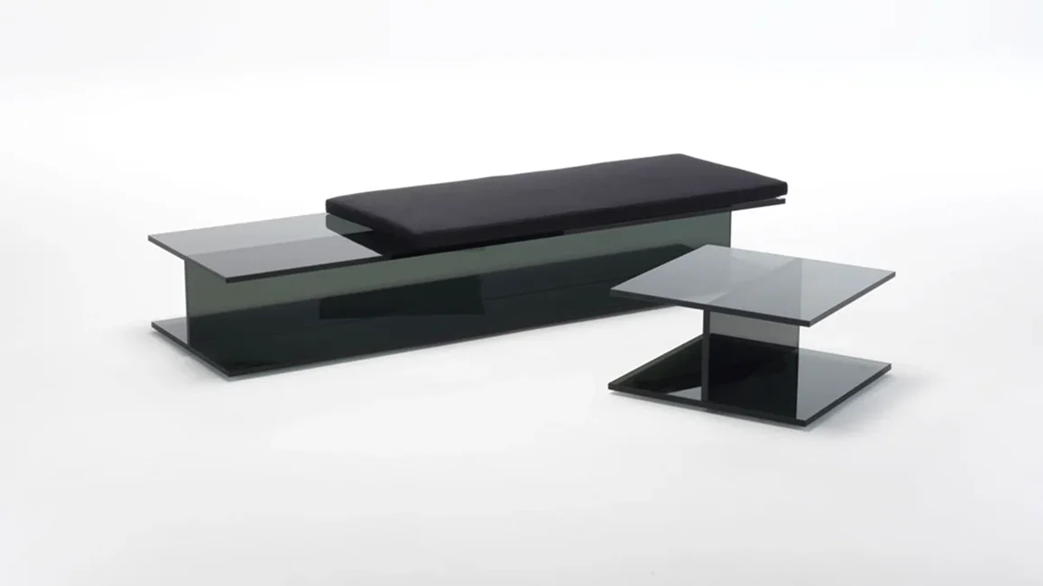 Collections composed of low tables and benches, obtained by gluing together three slabs of smoked laminated glass, so that they look like a joist. Although the glass junction is very little and linear, the adoption of high resistant structural gluing enables the use of these elements as seats. The collection is completed by removable cushions in a black colour fabric.