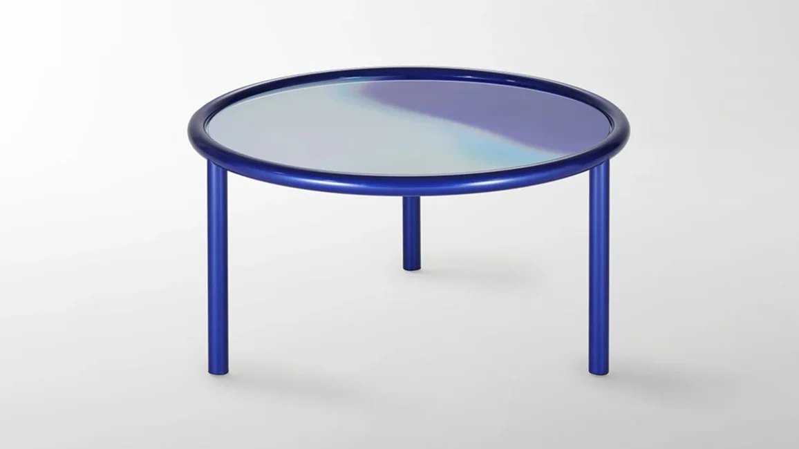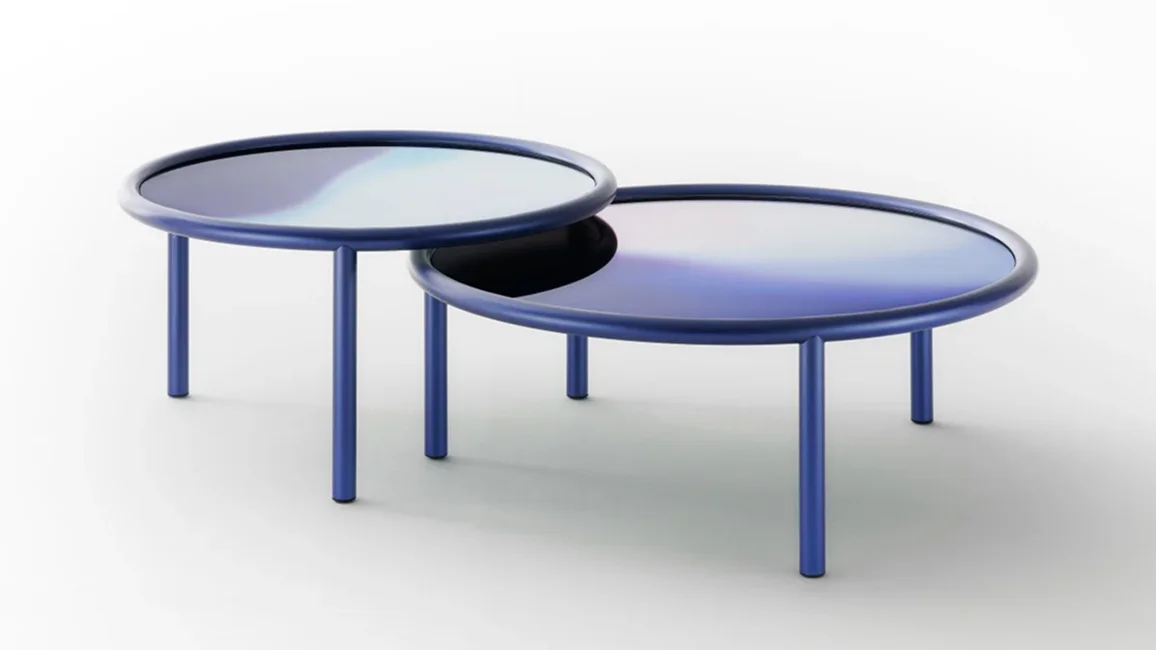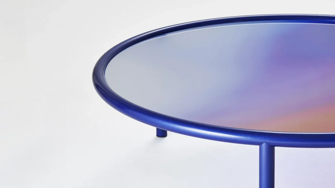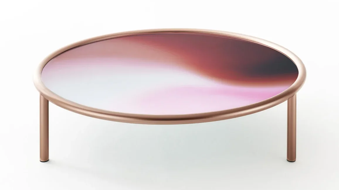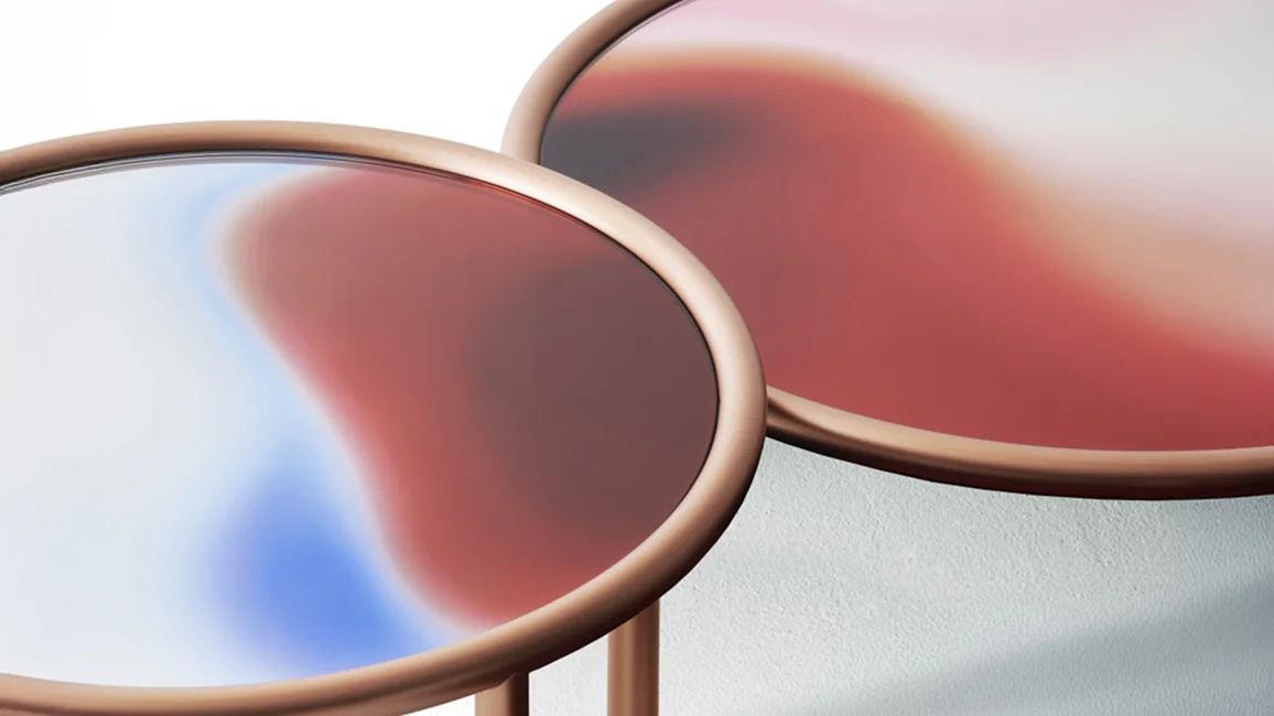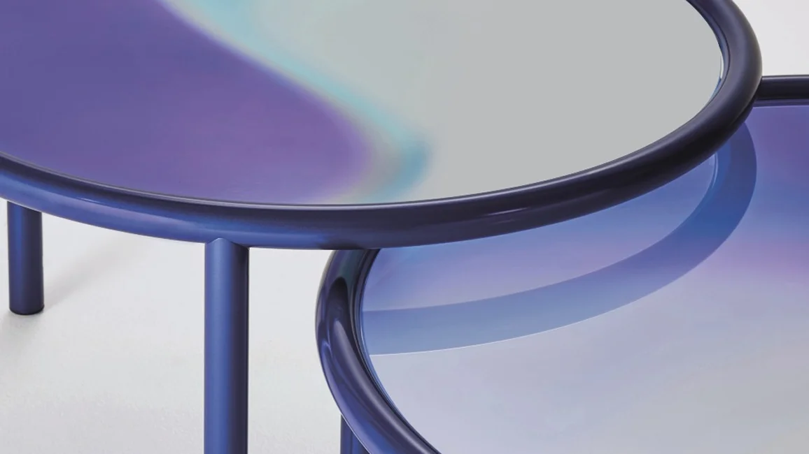 Low round tables with tubular metal structure painted midnight blue or copper colour in a special metallic opaque finish. The top, in laminated glass, is a palette of colours on a mirrored background, blending and mixing with one another like gas or fluids, disguising the solid state of the material. The mirrored background lends a particular energy and brightness to these colour tones.