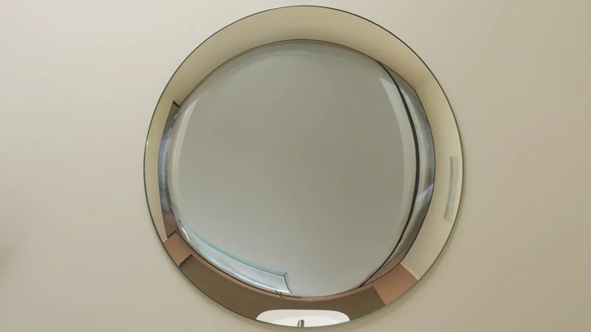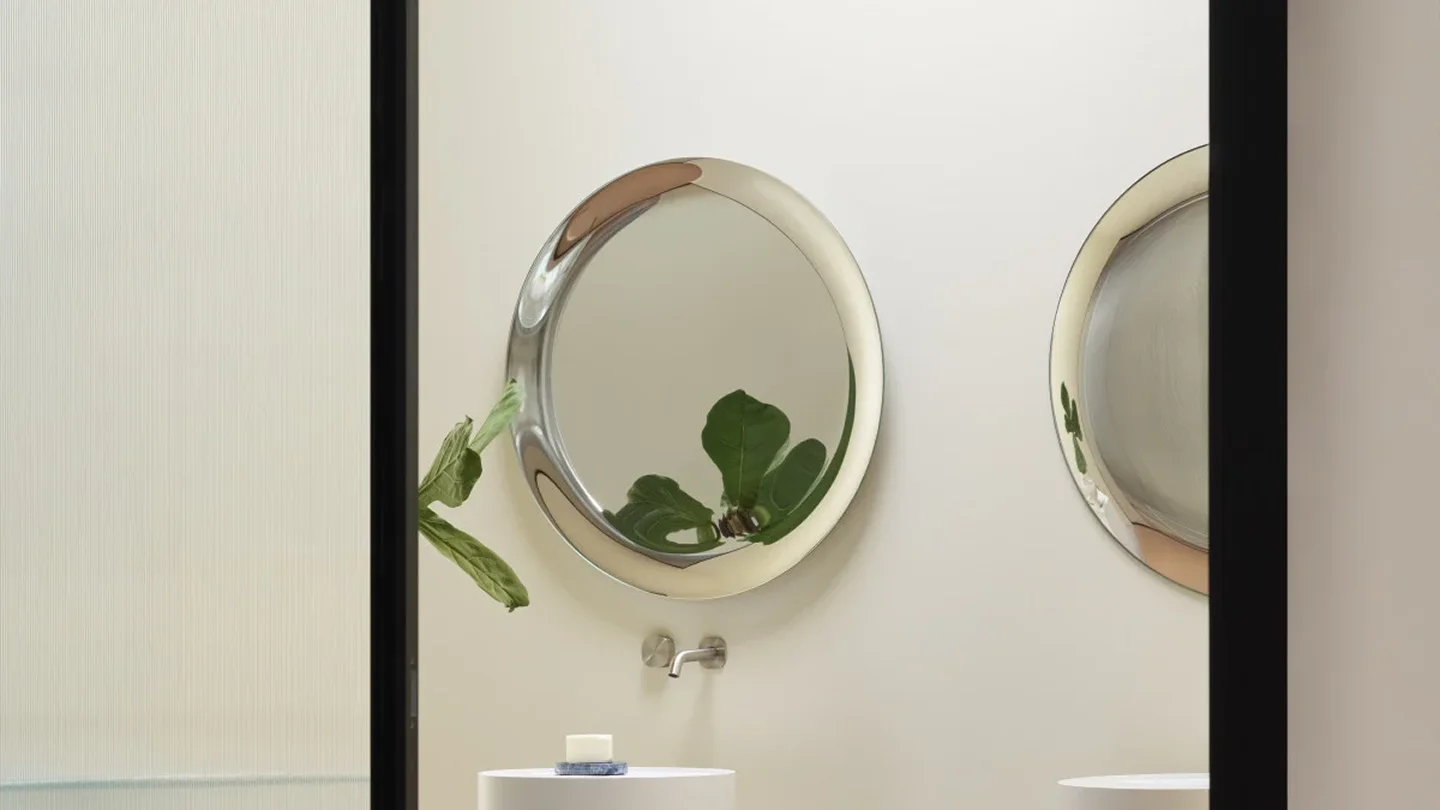 Mirrors made from a single sheet of bronze or extra-clear glass, which, thanks to innovative and complex processing techniques, is curved around its entire perimeter and manually silvered to perfection. Depending on the silver face, a mirror with a concave or convex surface is obtained, with a frame reflecting the images and distorting them at random, while the area in the center, perfectly flat, guarantees a true reflection and functional use. Available in two sizes, the rectangular shape can be hung in either direction. The back side of the concave version is available in the colours silver or orange Pantone 163C.