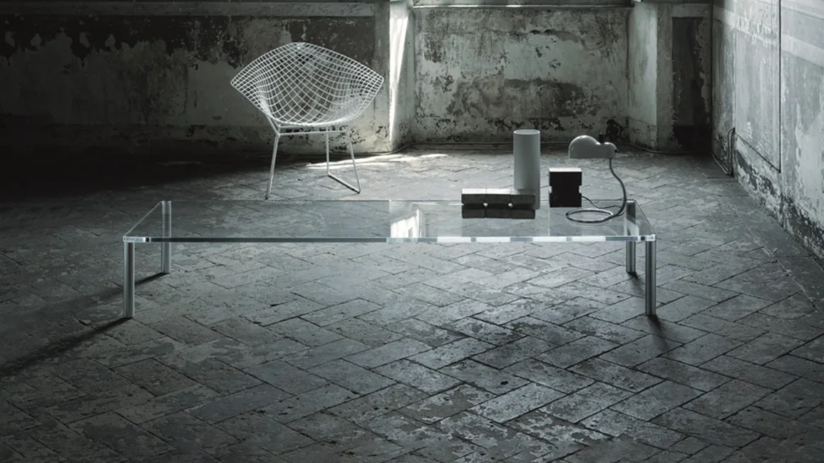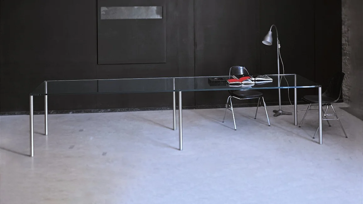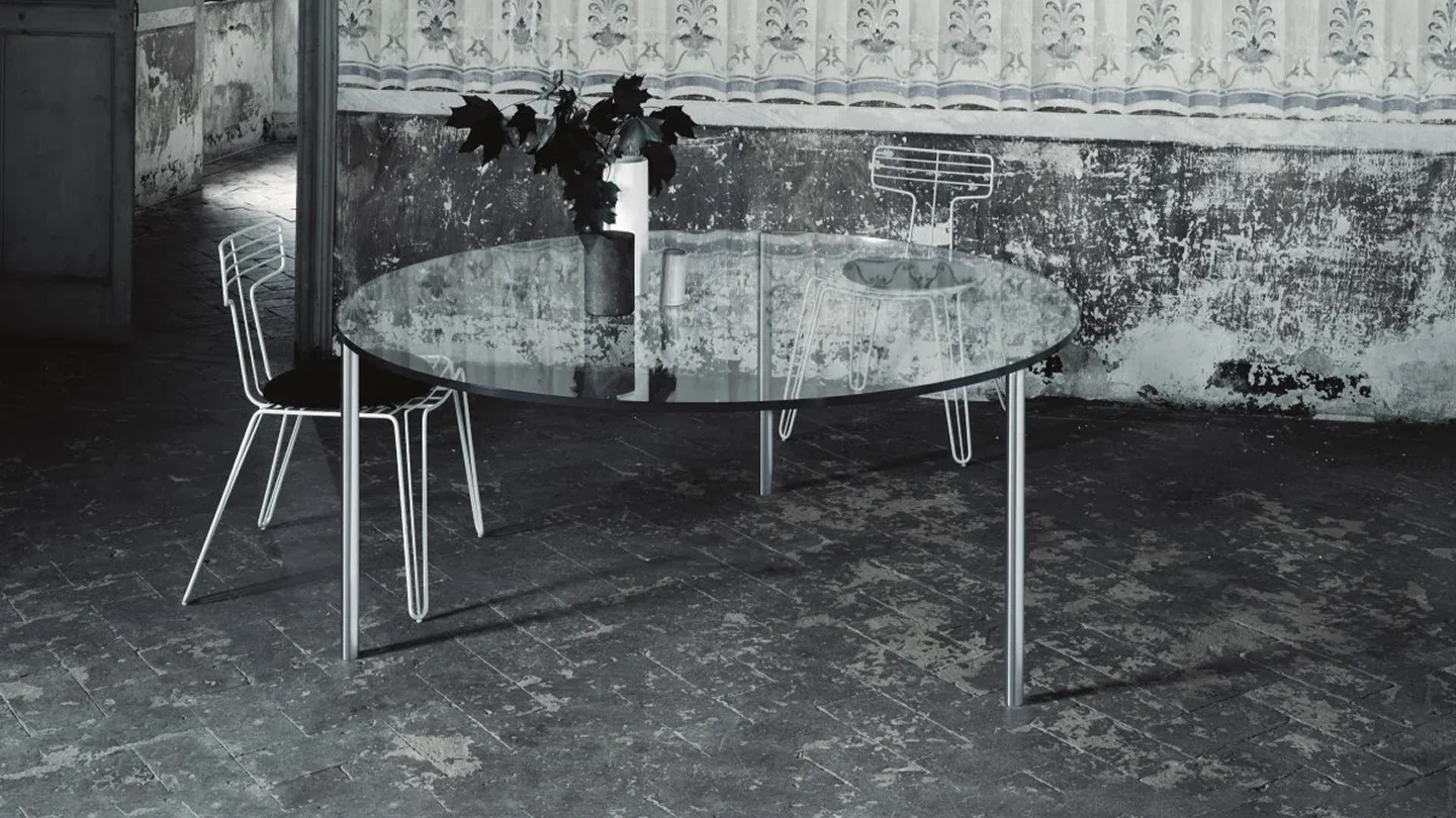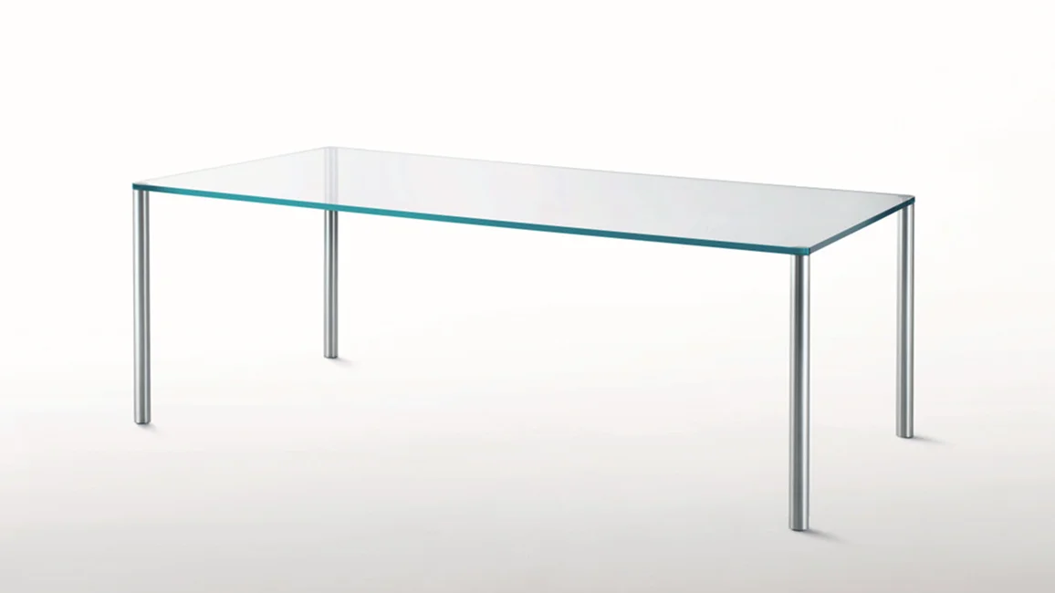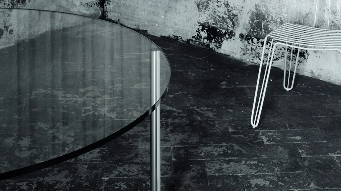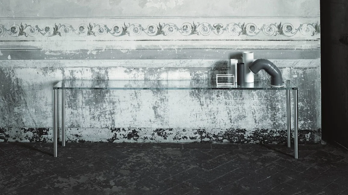 Series of high, low tables and consoles with top in 19 mm thick transparent extralight tempered glass. The cylindrical feet with diameter Ø50 mm are in brushed aluminum anodized inox or dark brown and are fixed to plates glued to the top.