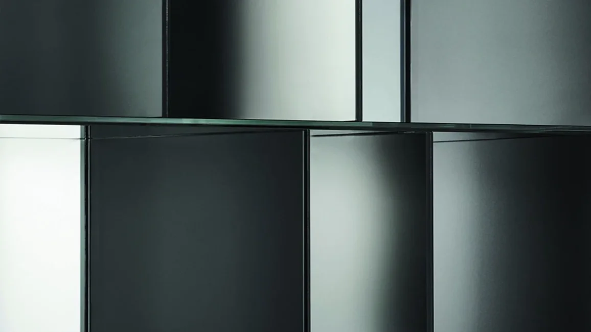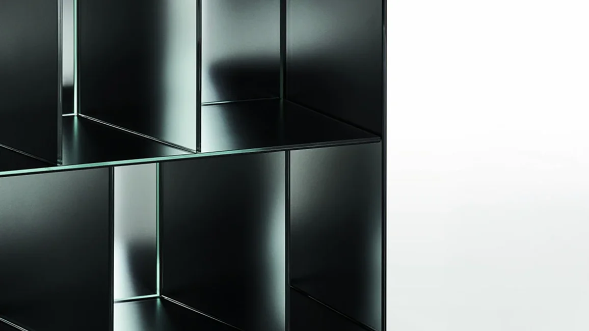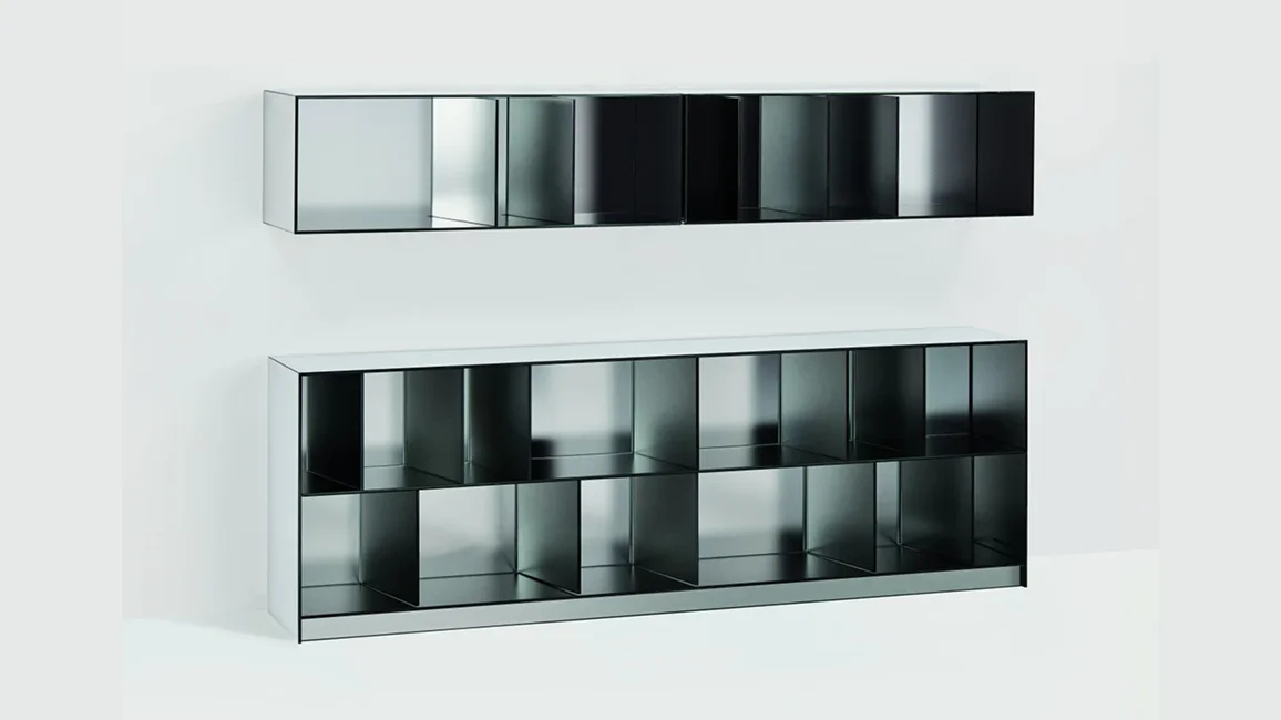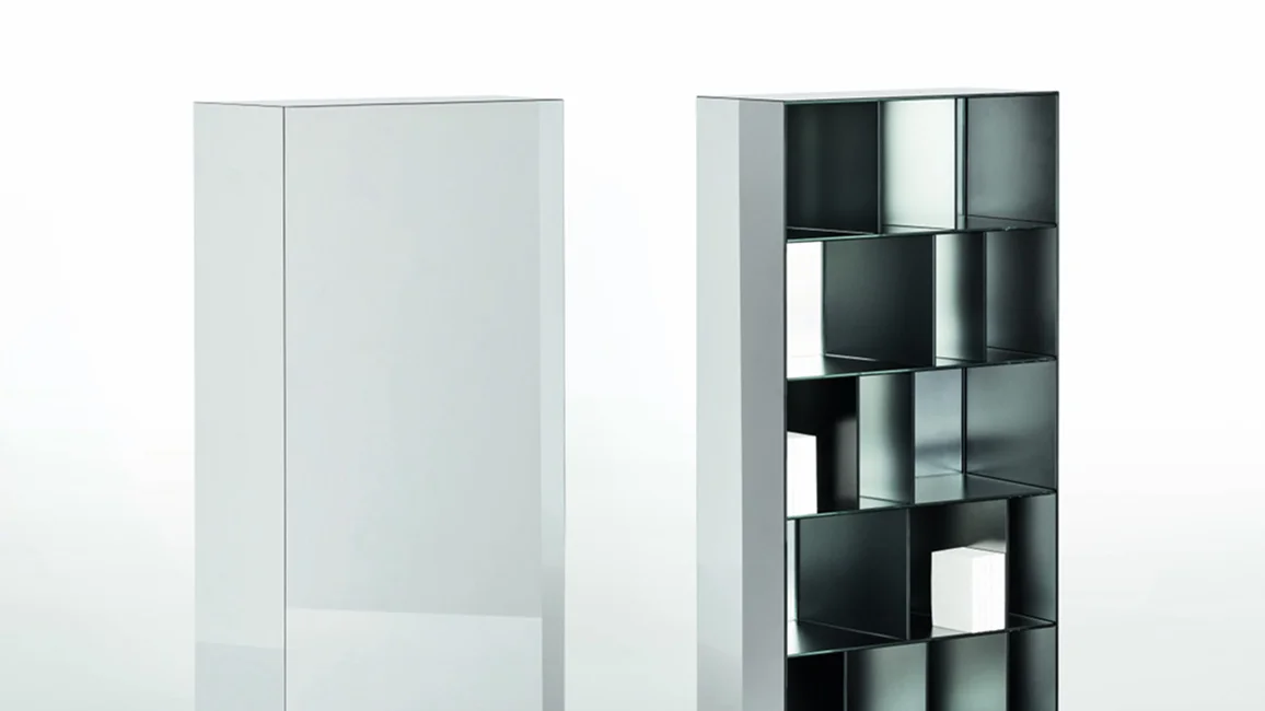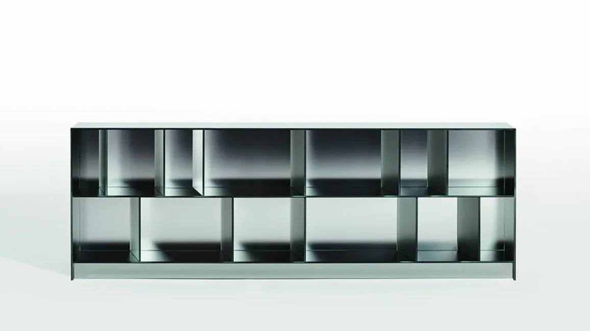 Series of open storage units in 5+5 mm laminated glass, with shiny polished ground edge and heat-sealed at 45°. The external surface has a special mirrored finish, while the internal surface is in opaque mirror, which reflects the images in a blurry and undefined way.
