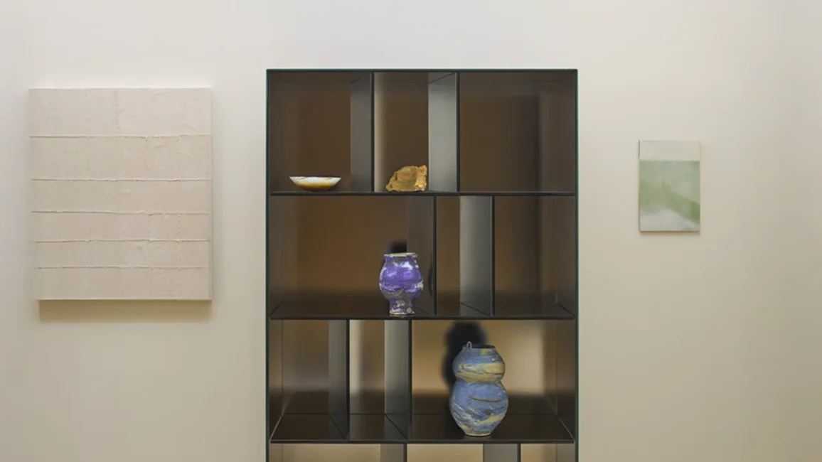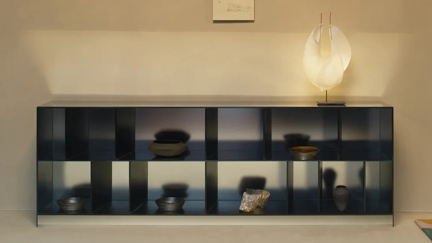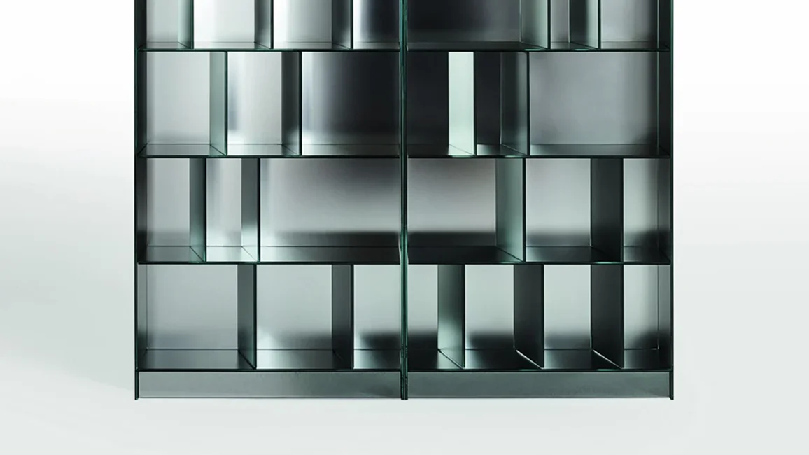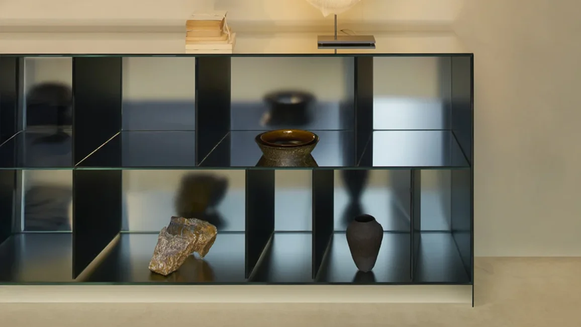 Series of open storage units in 5+5 mm laminated glass, with shiny polished ground edge and heat-sealed at 45°. The external surface has a special mirrored finish, while the internal surface is in opaque mirror, which reflects the images in a blurry and undefined way.