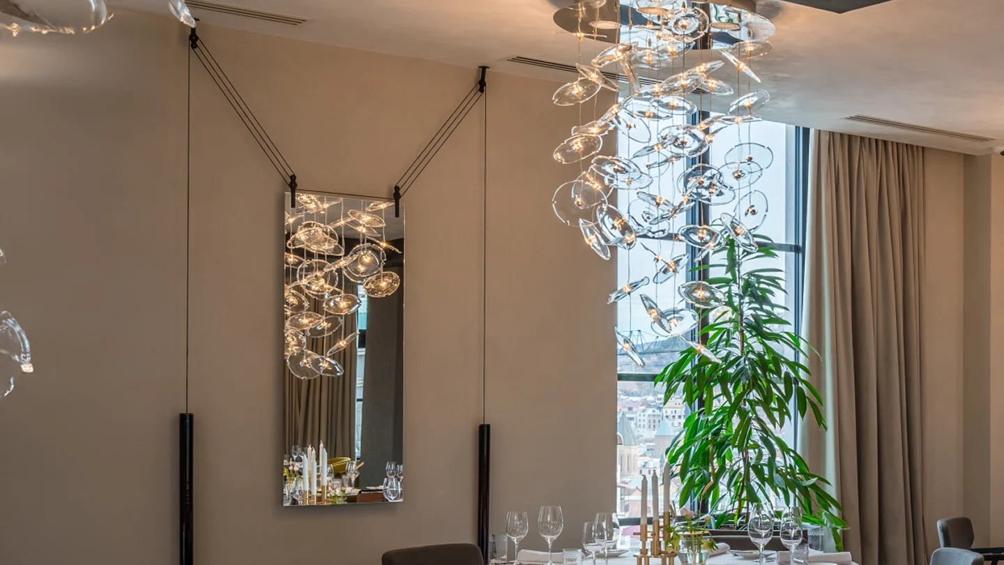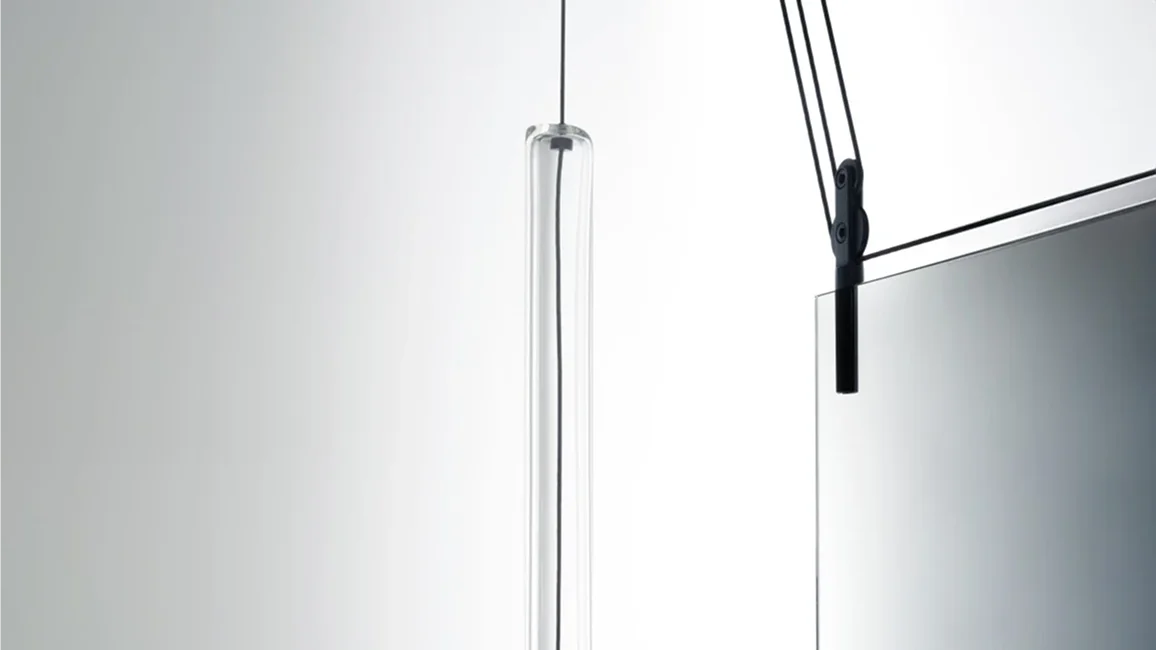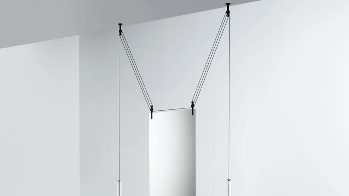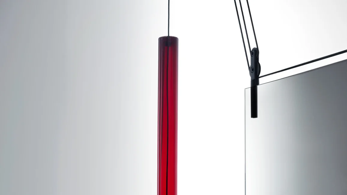 A double-faced mirror hanging from the ceiling available in three versions that, thanks to a system of counterweights, cables and pulleys, can be easily vertically positioned. The counterweights, that go up and down balancing the movement of the mirror, are cylinders in red or neutral blown glass. The cables and pulleys are in black aluminium. Because of the double-faced feature, this mirror is perfect to be hung near a wall, but also in the middle of a location as dividing and/or screening element.