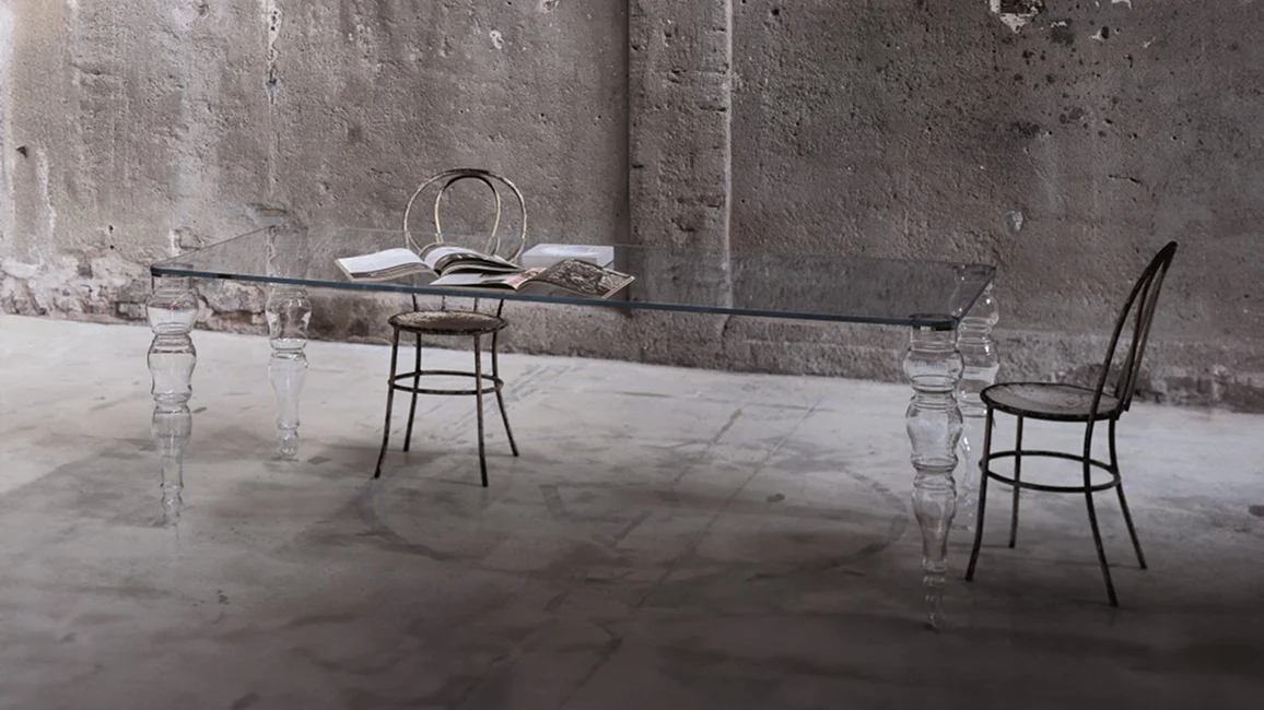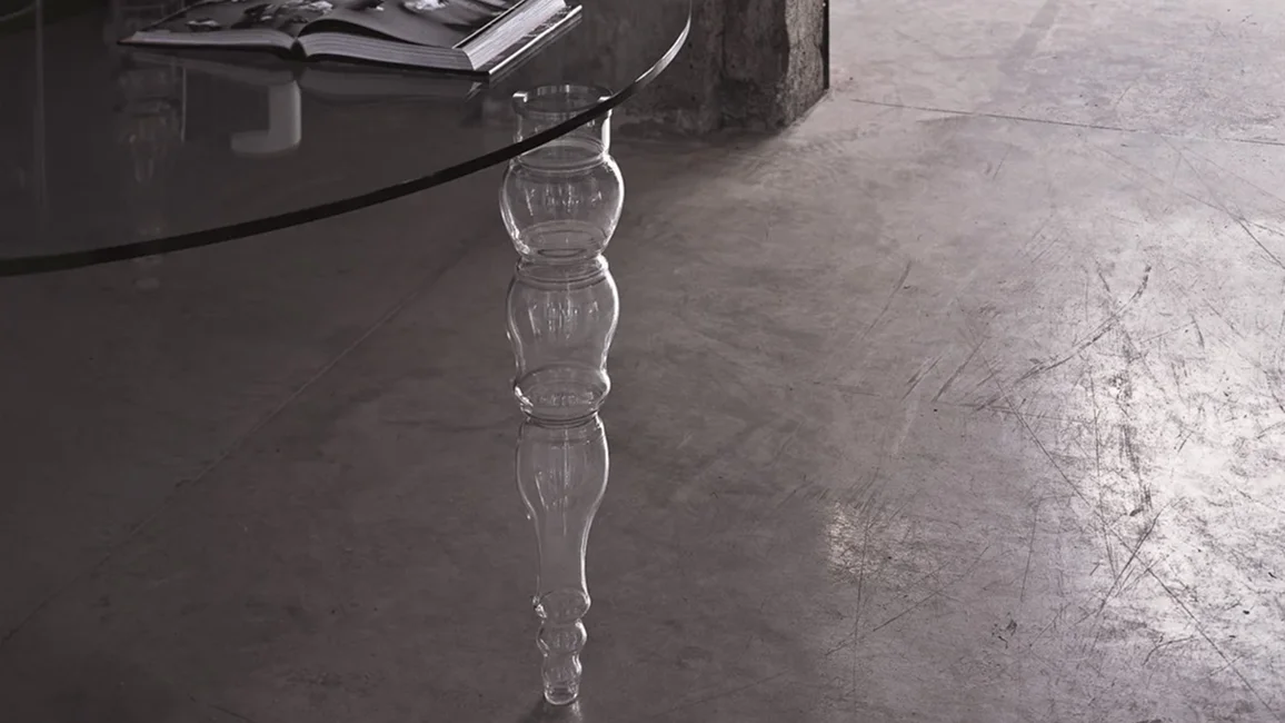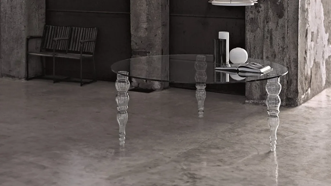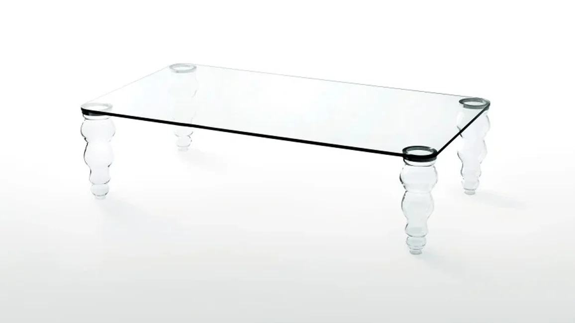 Series of high and low tables with squared, rectangular and rounded shape. The top is available in transparent, transparent extralight, glossy lacquered glass. The feet are in molded and shaped borosilicate glass.
