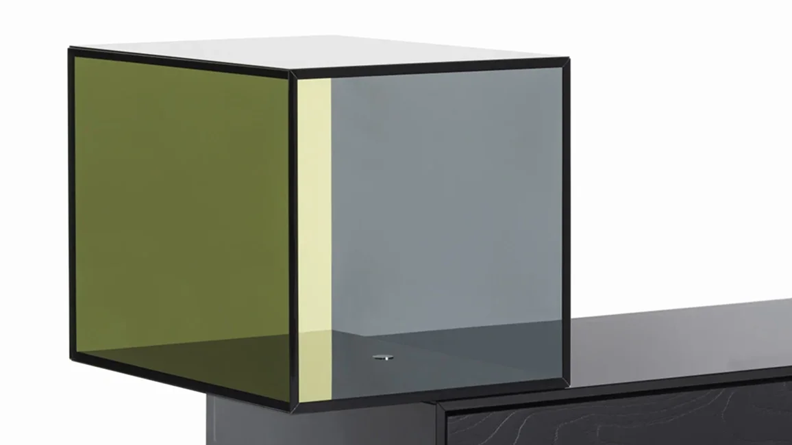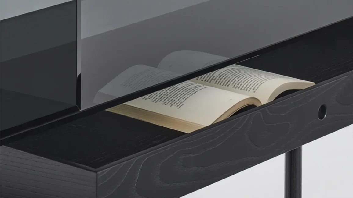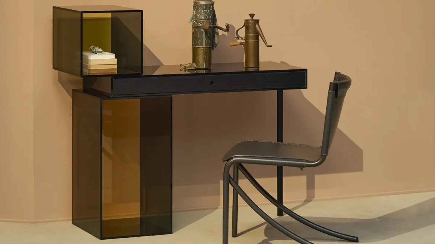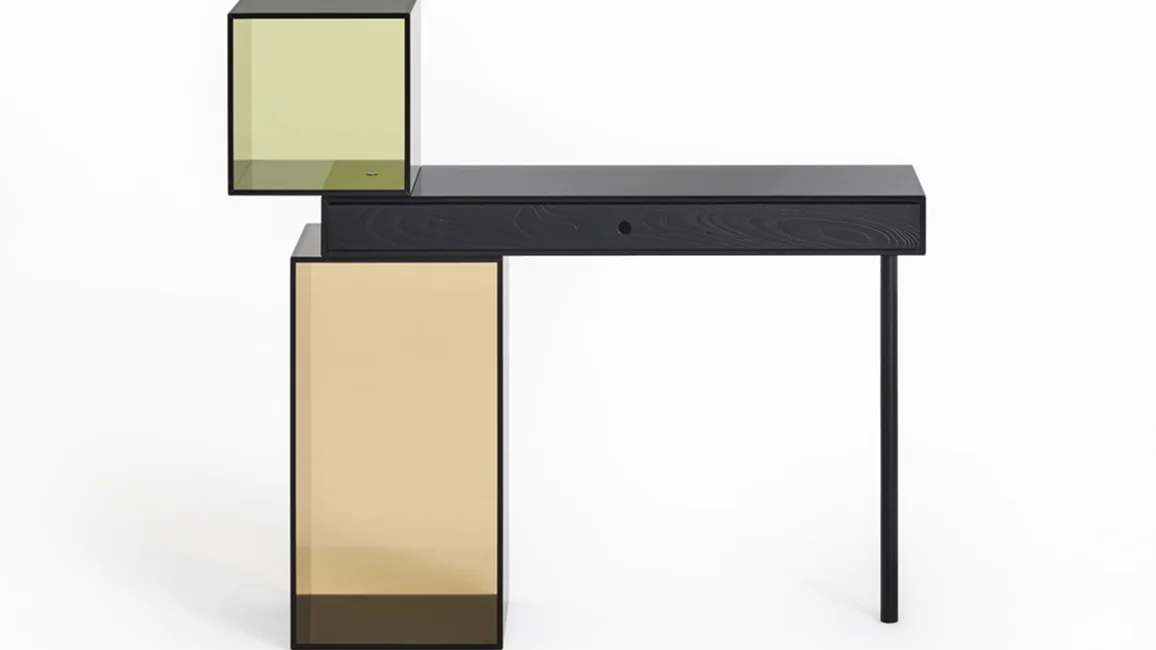 Small desk made up of 10 mm tempered smoked glass boxes, glued at 45°, cantilevered and overlapped, fixed to each other by means of minimal black anodized aluminum joints. The top box contains a drawer in solid black stained ash, which rests and slides on the glass thanks to velvet inserts. Invisible safety stops prevent the drawer from falling. The other boxes, which can be used as storage compartments, are available made entirely of smoked glass or with a back panel in the colored transparent glass finishes. A cylindrical leg in solid matt black ash supports the top laterally, preventing the desk from tipping over.