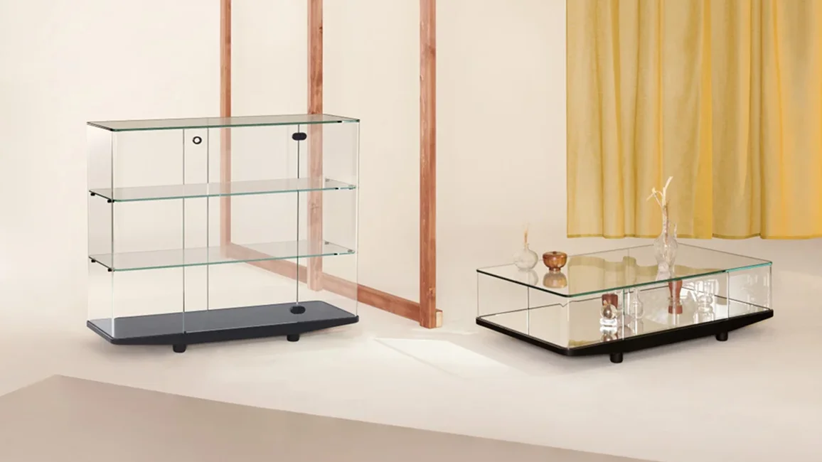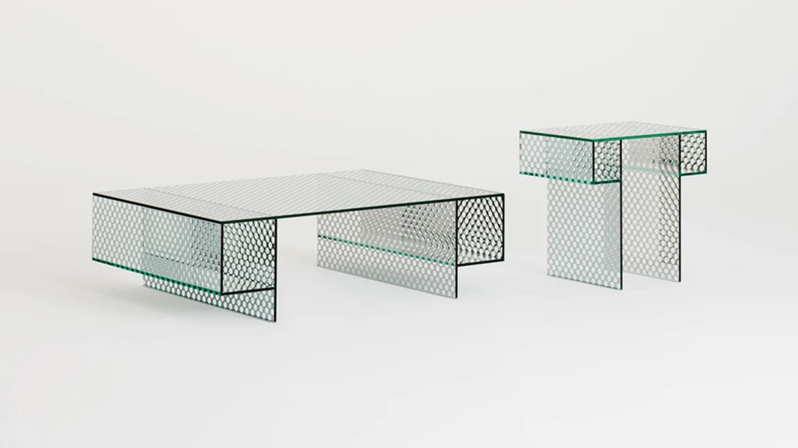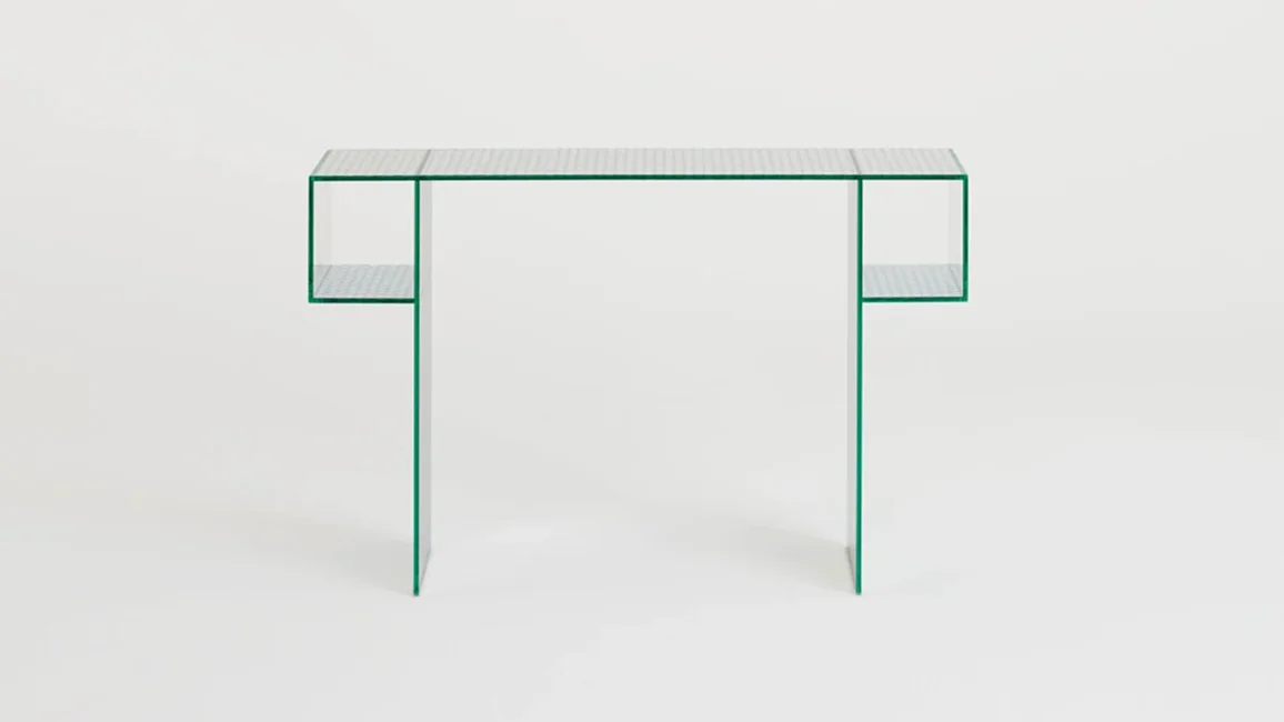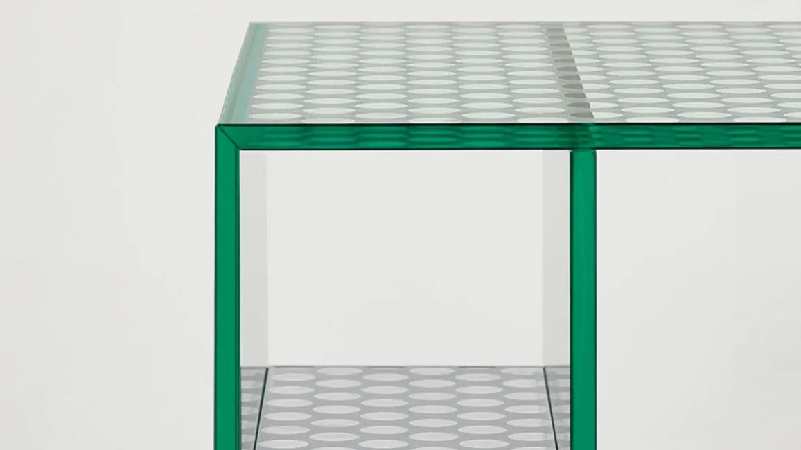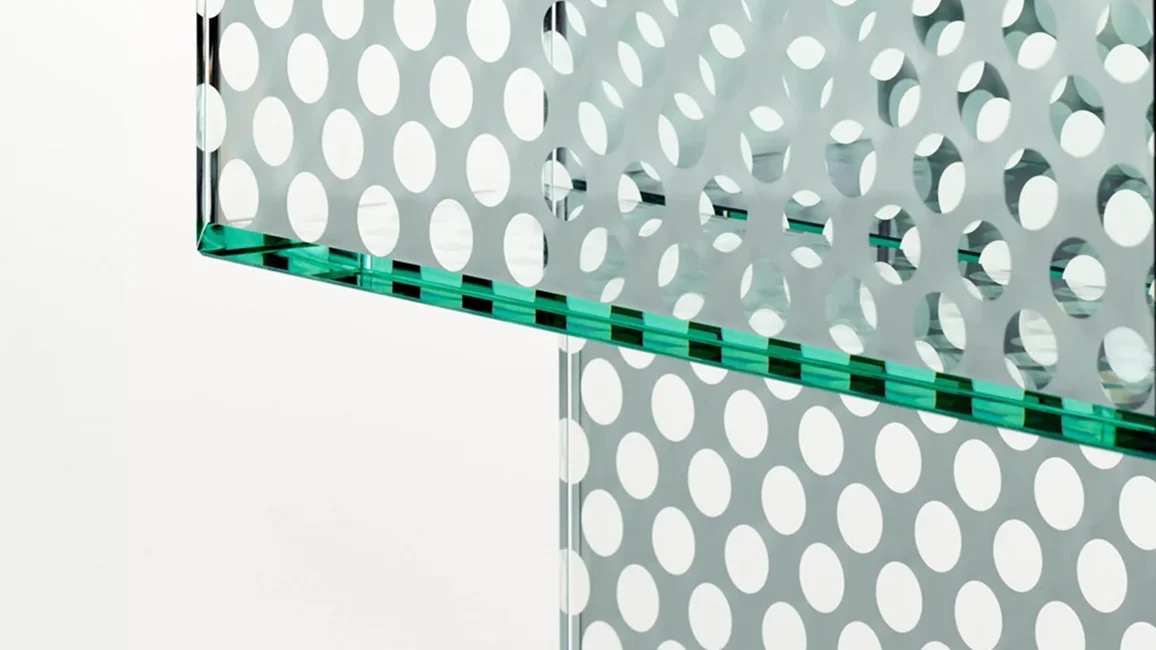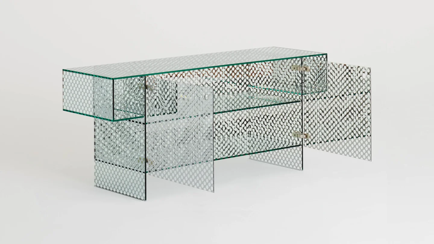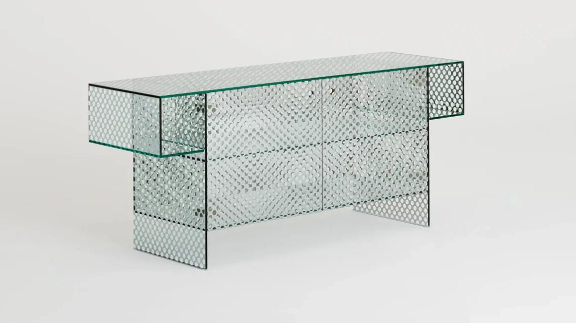 Collection of low tables, consoles and storage furniture, completely created from a special double-sided mirrored glass, with a decorative pattern made from round transparent marks, simulating a perforated metal sheet. All the glass is tempered and UV bonded. The two doors are opened and closed with a push-pull system.