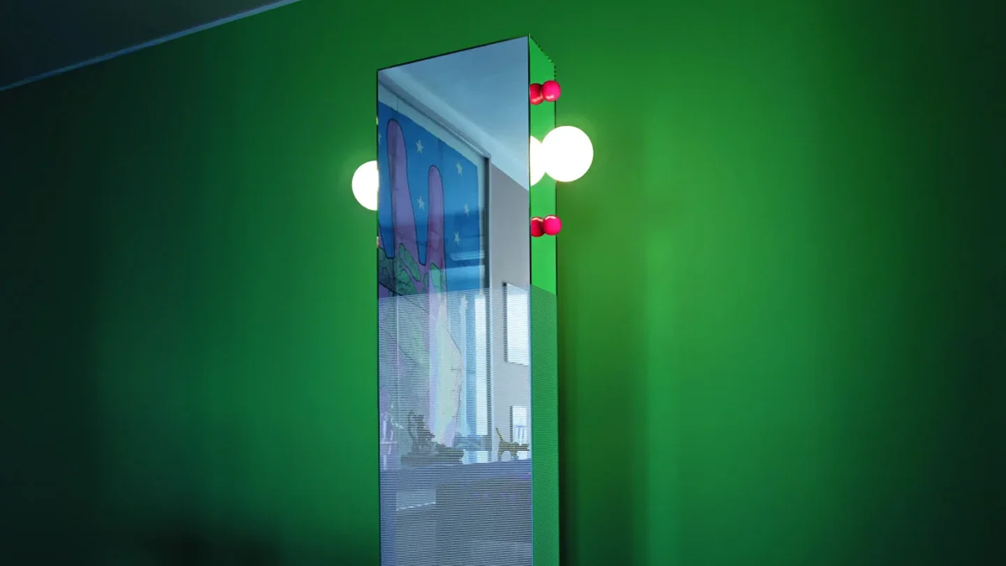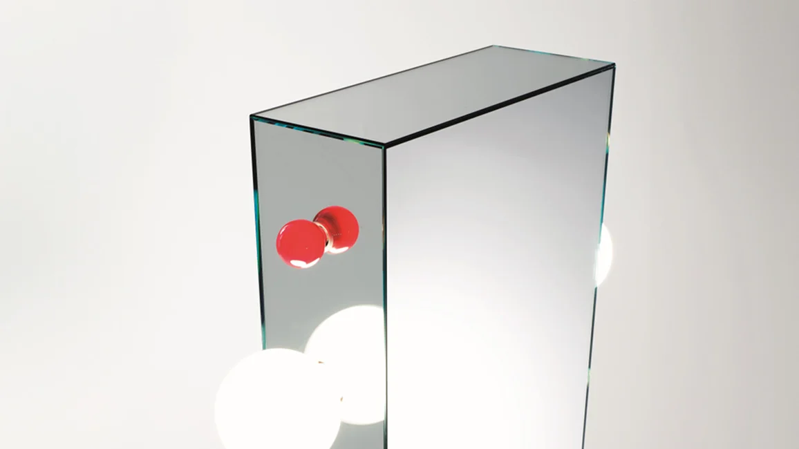 Totem mirror with red and white bulbs. The lateral and frontal sides are in mirror partially decorated with thin white engravings going around the whole perimeter. The base is in matt polished absolute black granite.