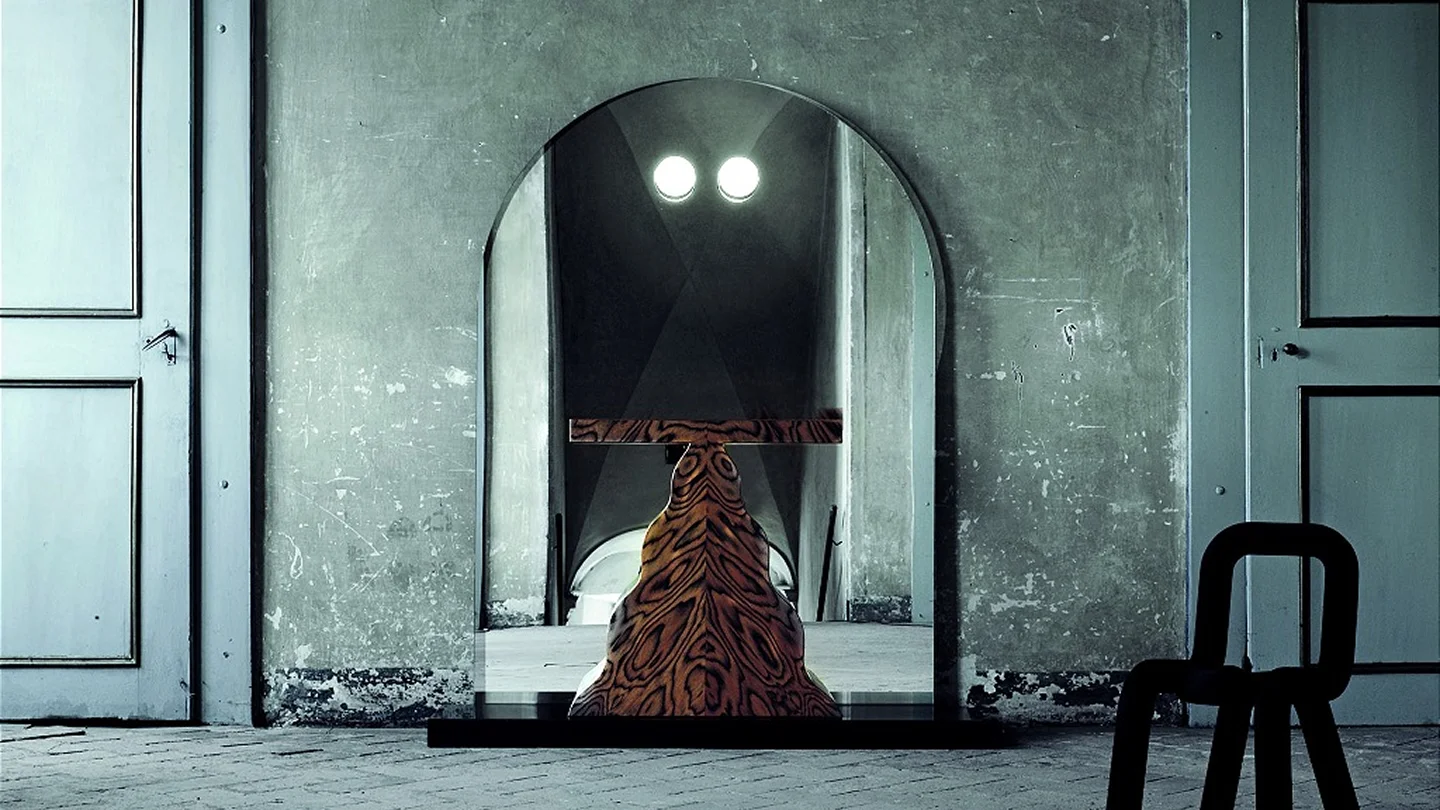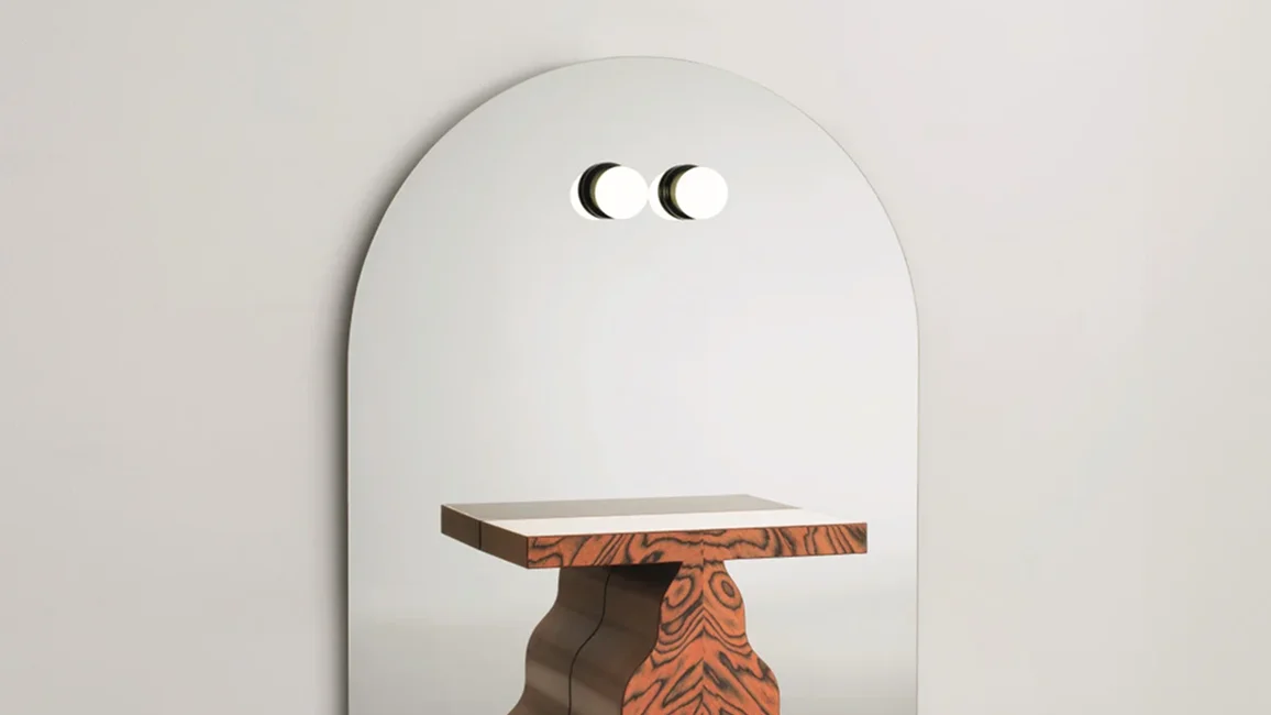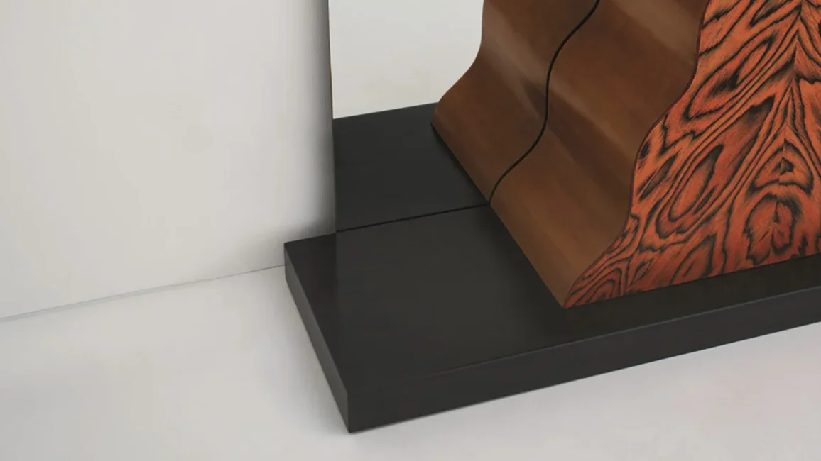 Mirror unit with crystal mirror, two laps and console table made of pearwood and Alpi veneer. The base is in aniline-varnished wood. Every piece is identified by a progressive numbering.