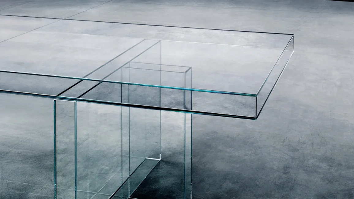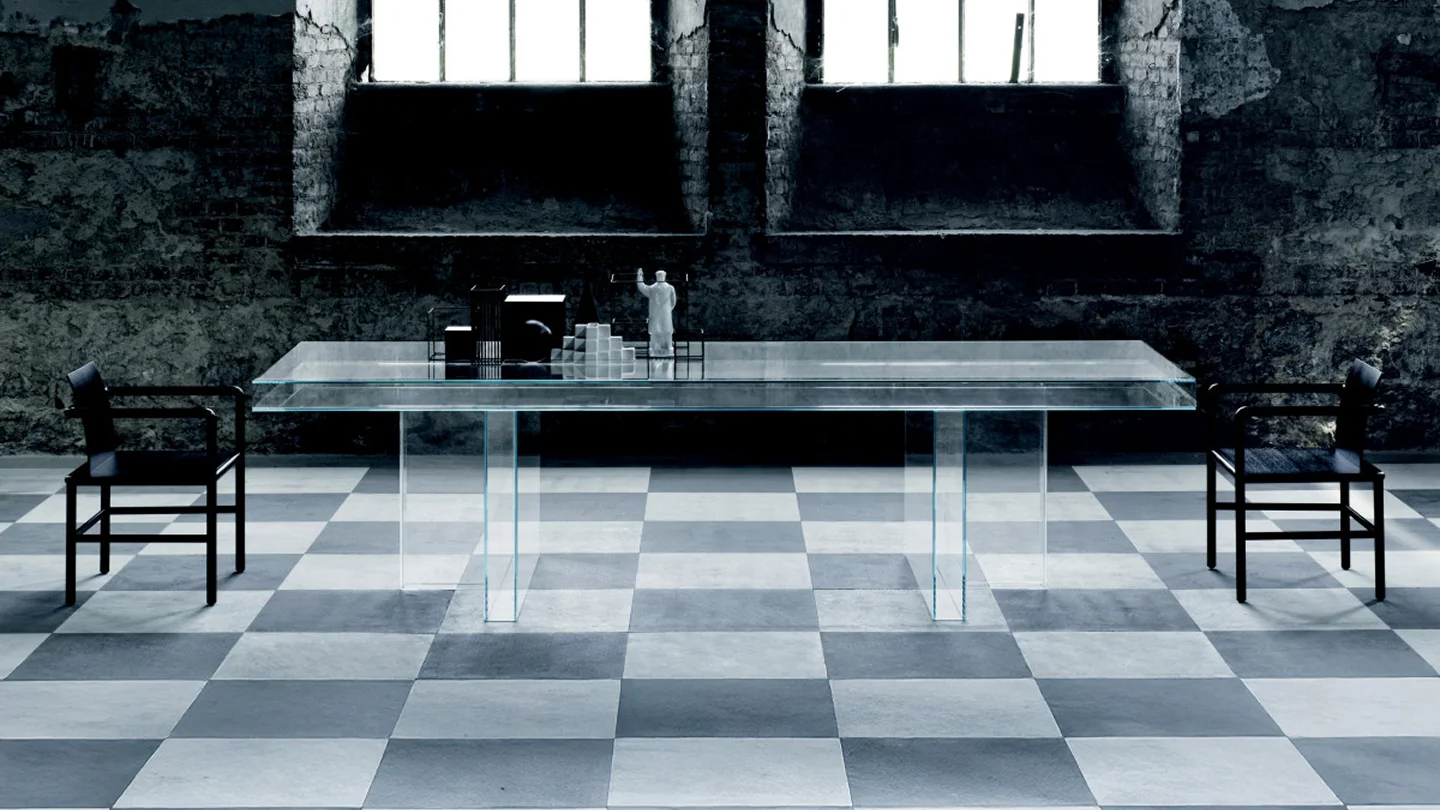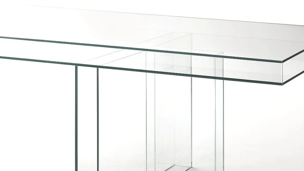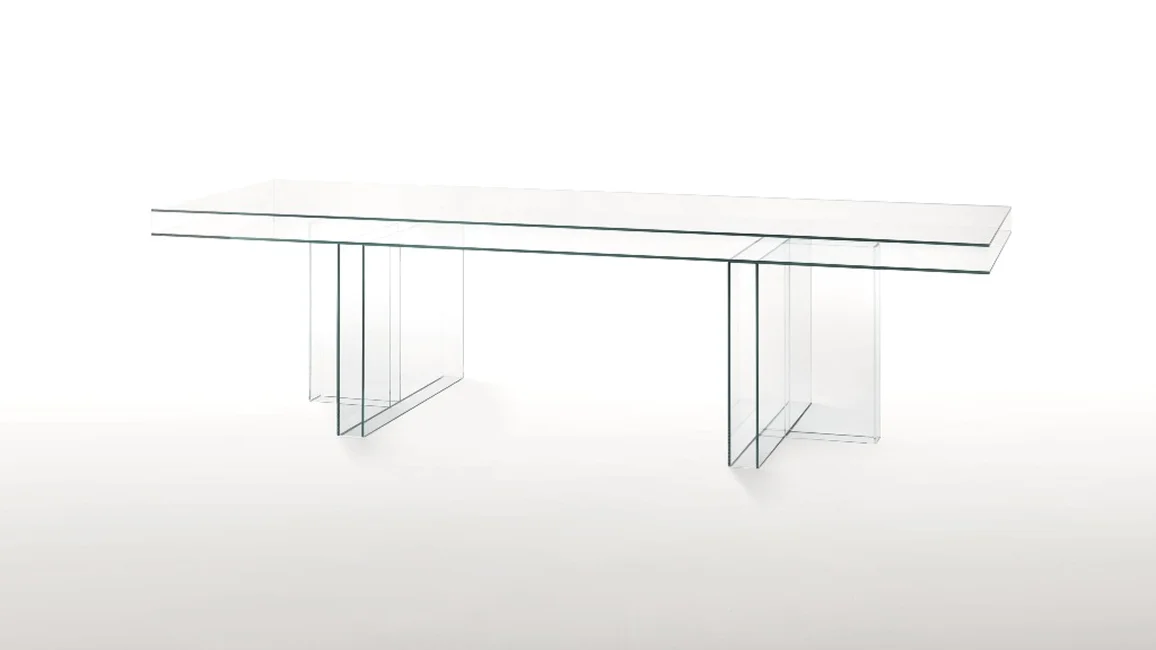 Table constructed from boxed volumes in 10 mm thick transparent extralight tempered glass, obtained thanks to complex gluing manufacturing. The top is supported by two “T” shaped bases and it has a parallelepiped shape opened on the two The result is a table of great strength and formal purity and at the same time characterized by the great volumetric presence.
