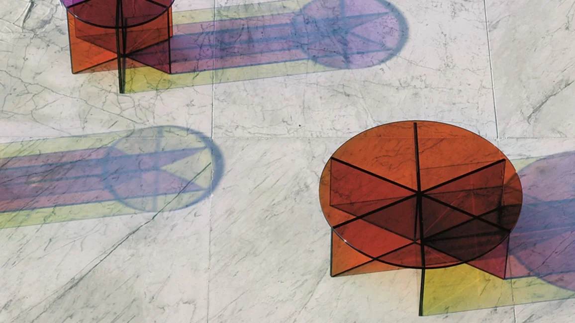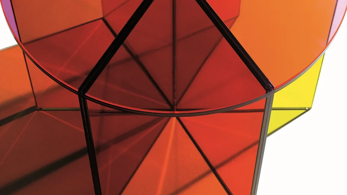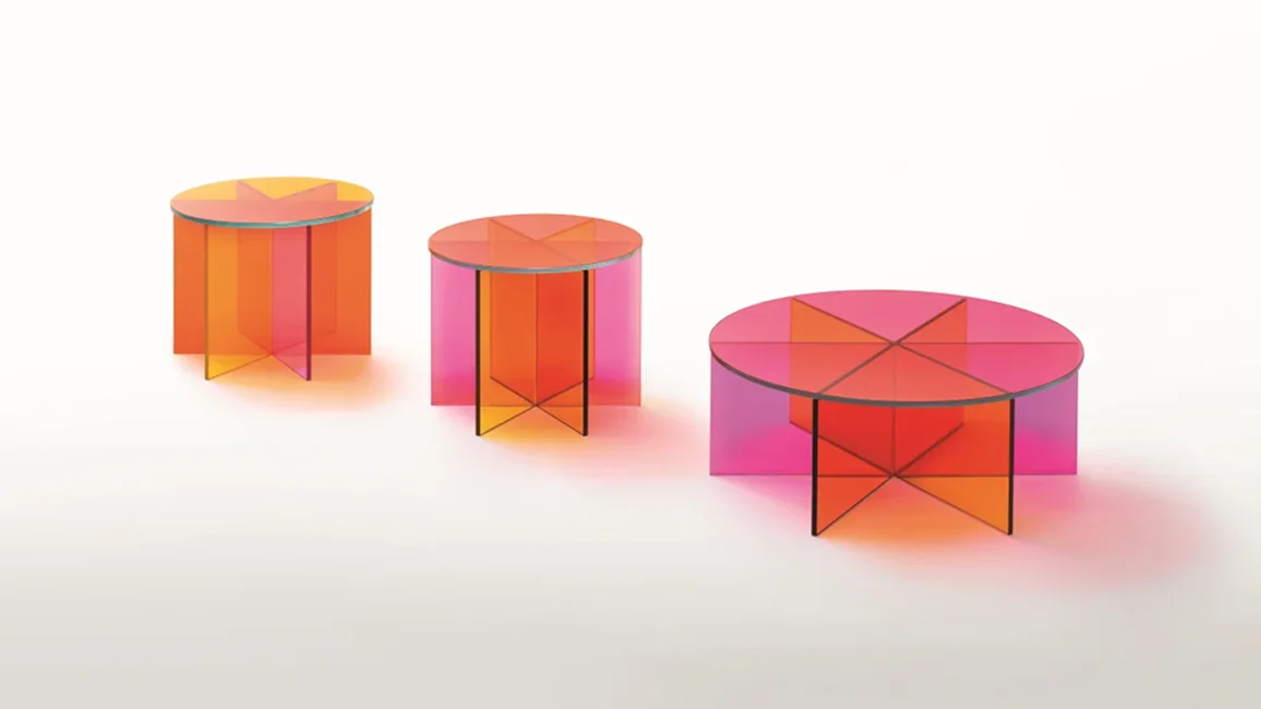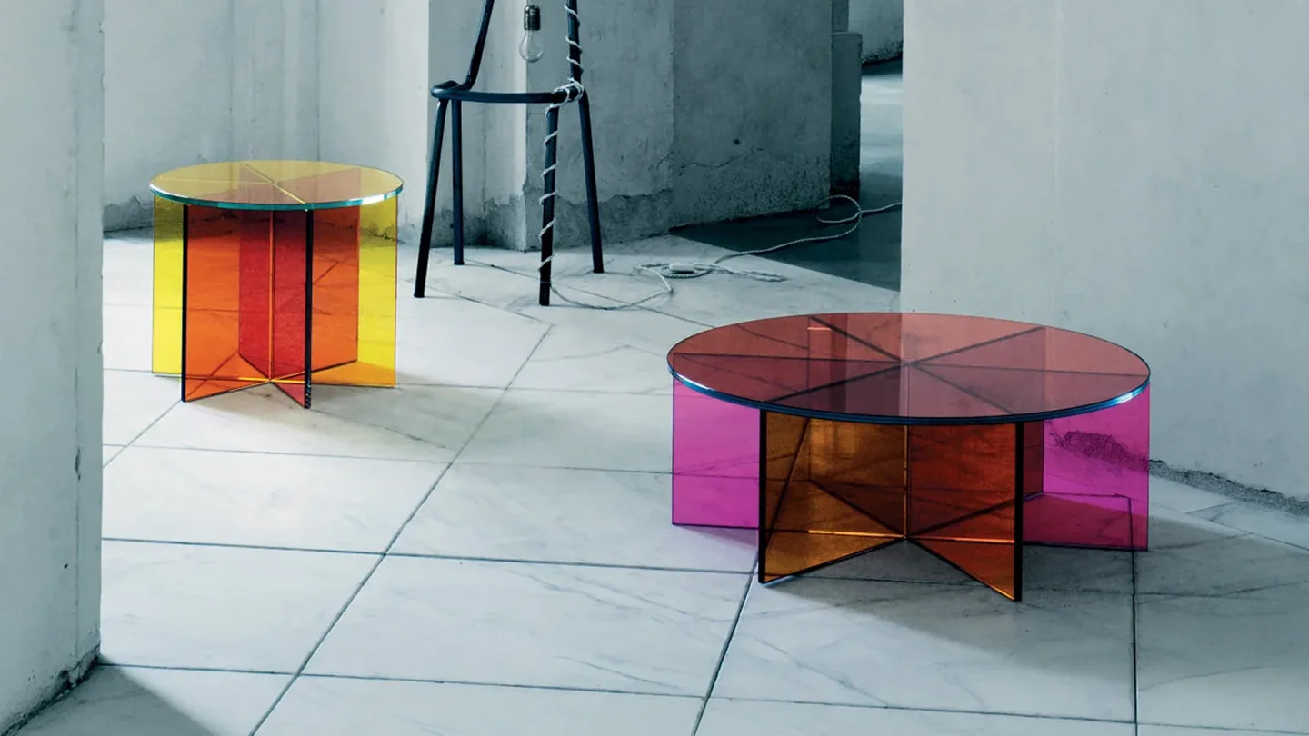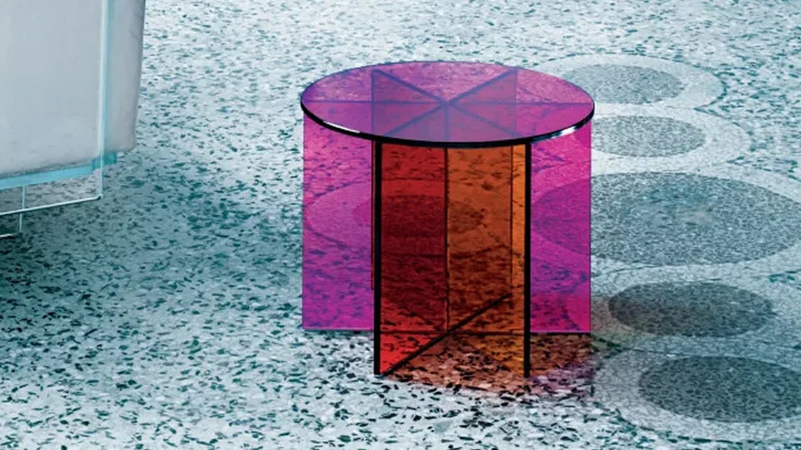 Low table realized in transparent pink, orange and yellow coloured glass. The base is obtained by gluing six laminated 6+6 mm thick glass plates with special chamfering. The top, in laminated 6+6 mm thick glass, leans on the base and is available in one of its three colours.