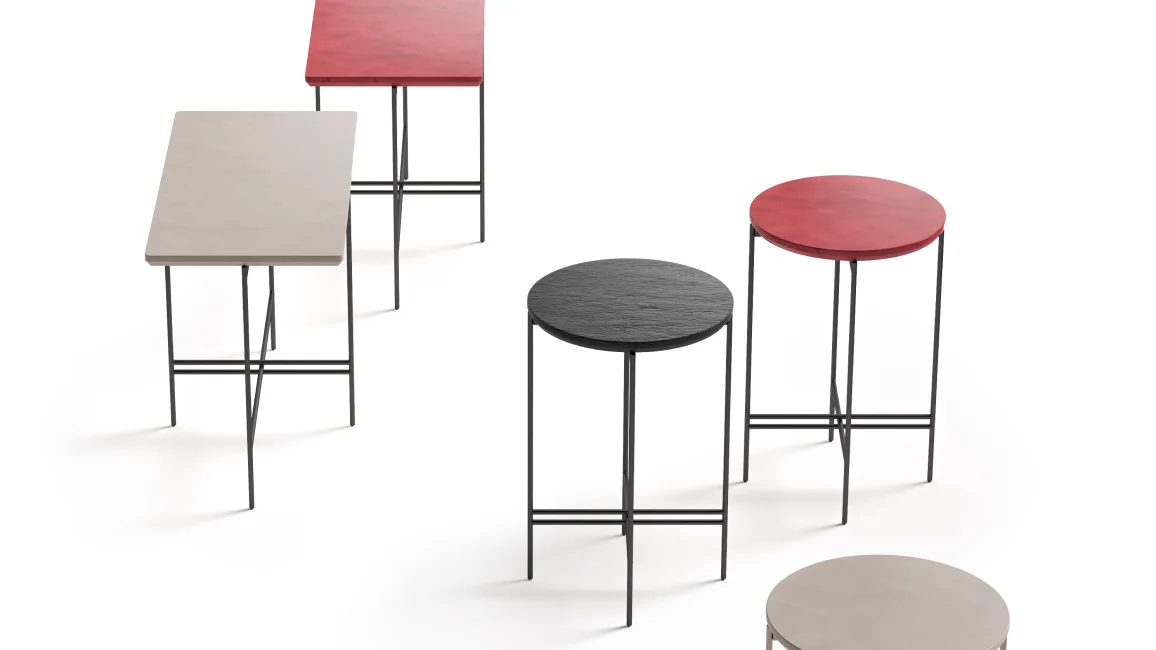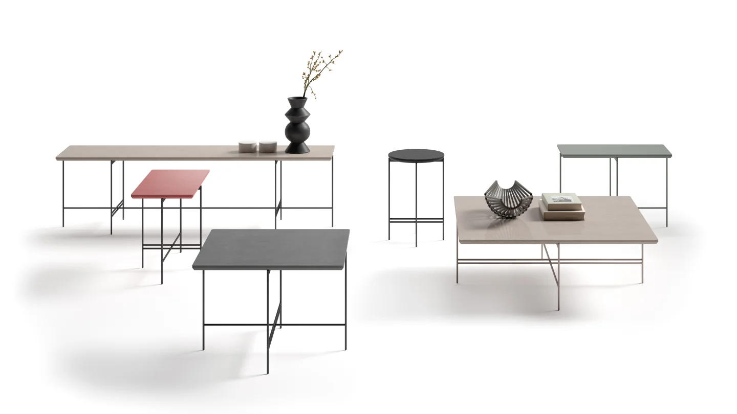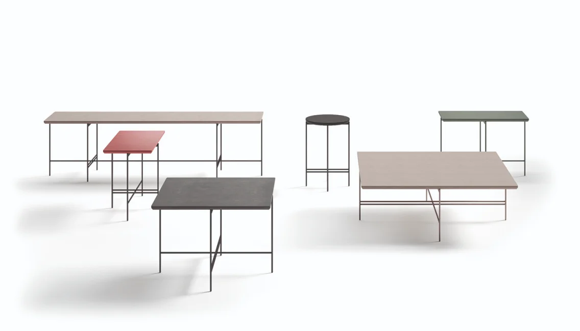 Coffee tables and consoles with base in Ø 10mm metal tubular and top in MDF with various finishes.