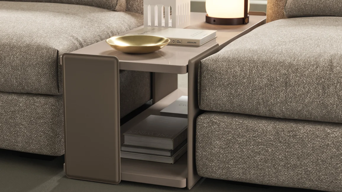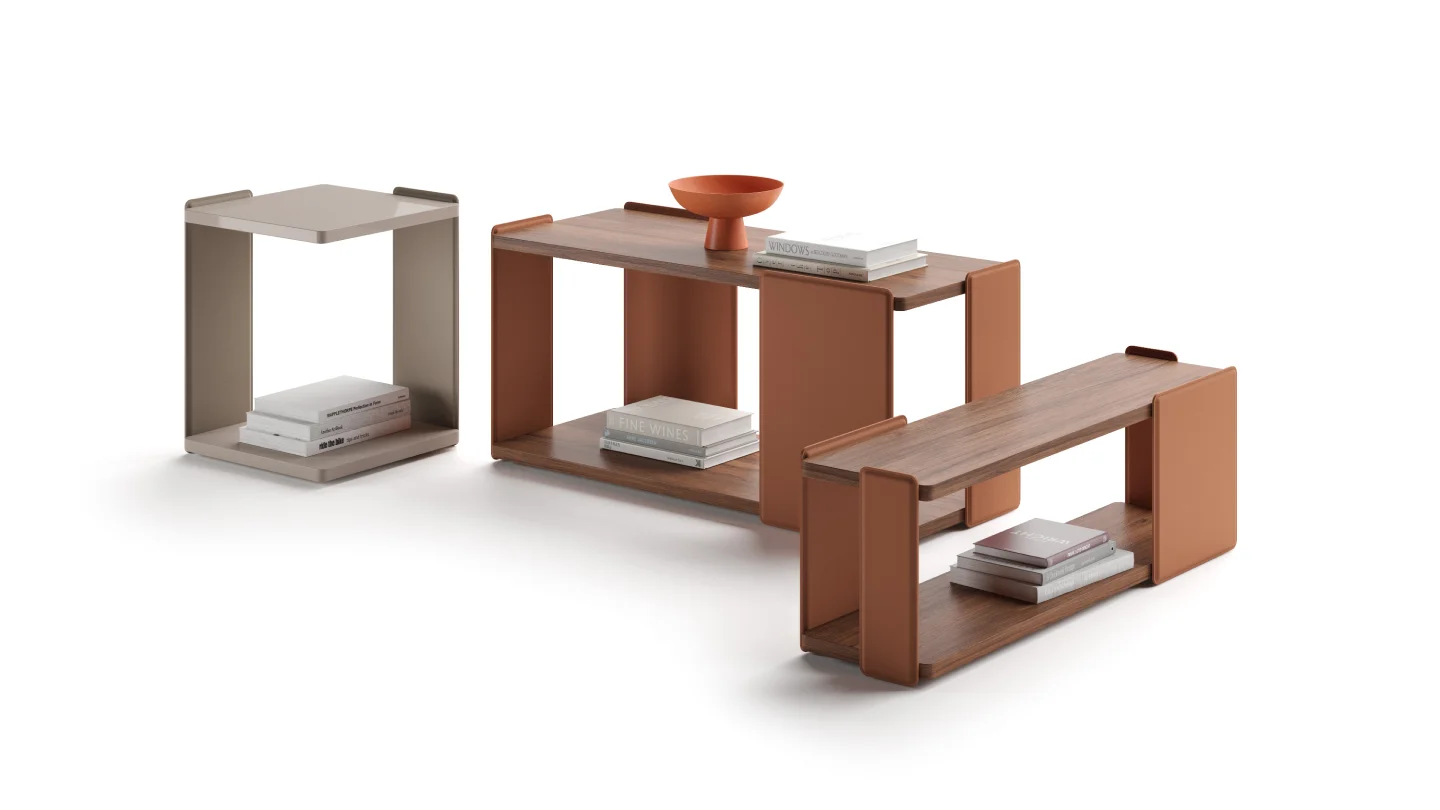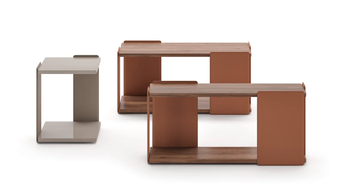 Coffee table with metal frame covered in leather in the colours Caramel, Graphite and Dove Grey. Tops veneered with canaletto walnut or oak, natural finish, or lacquered with matt or glossy finish in the colours from the sample book.