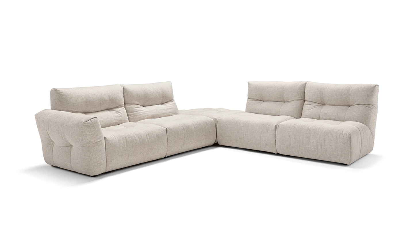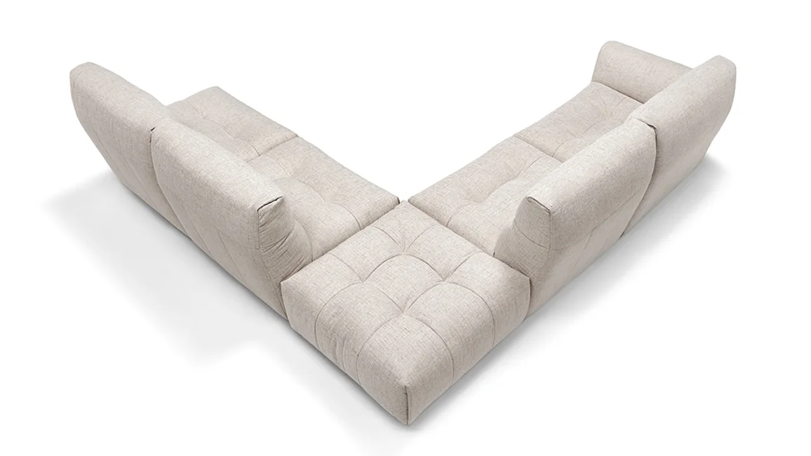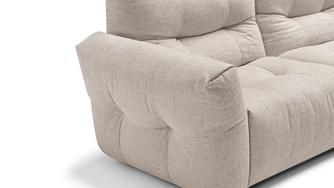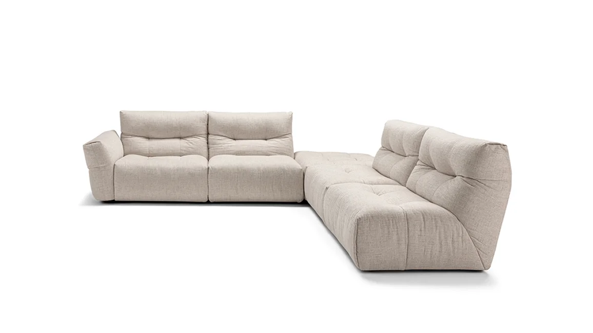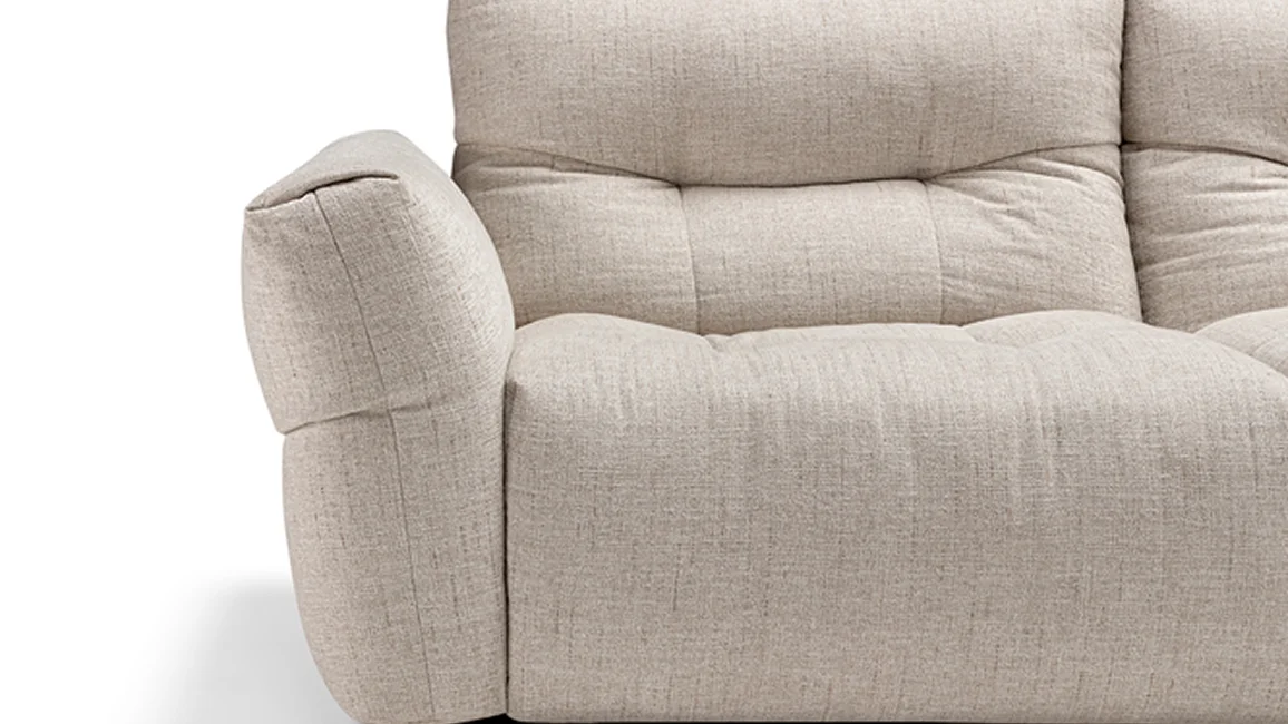 At the mere sight of it, with a cosy and comfortable mood, the Sorriso modular sofa proves to be the ideal size while having a relaxing break, thanks to its mix of feather and polyurethane foam padding. Thought with its ample and vaporous volumes, to dominate the living room, this model is offered in different configurations ranging from three-seater to a corner group, thanks to the insertion of a square pouff that acts as a connection. Upholstred with a linen-blend fabric in natural tones of iridescent white, but also available in leather, Sorriso is distinguished by its sartorial details, quilted areas but also by the special fabric flaps at the ends of the armrests and backrests.