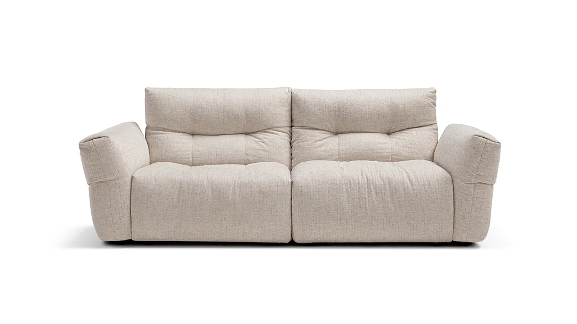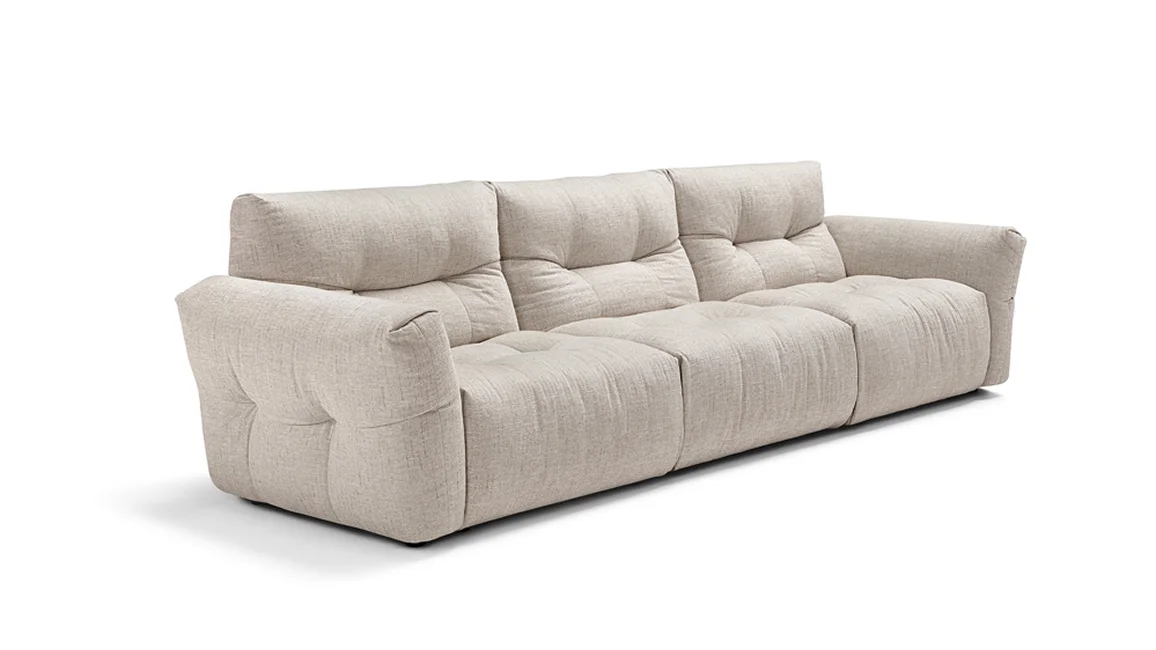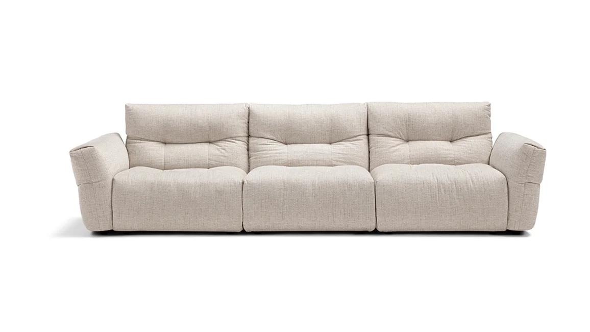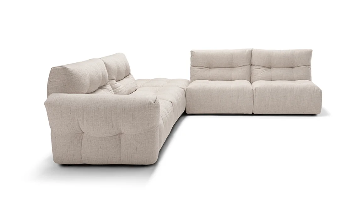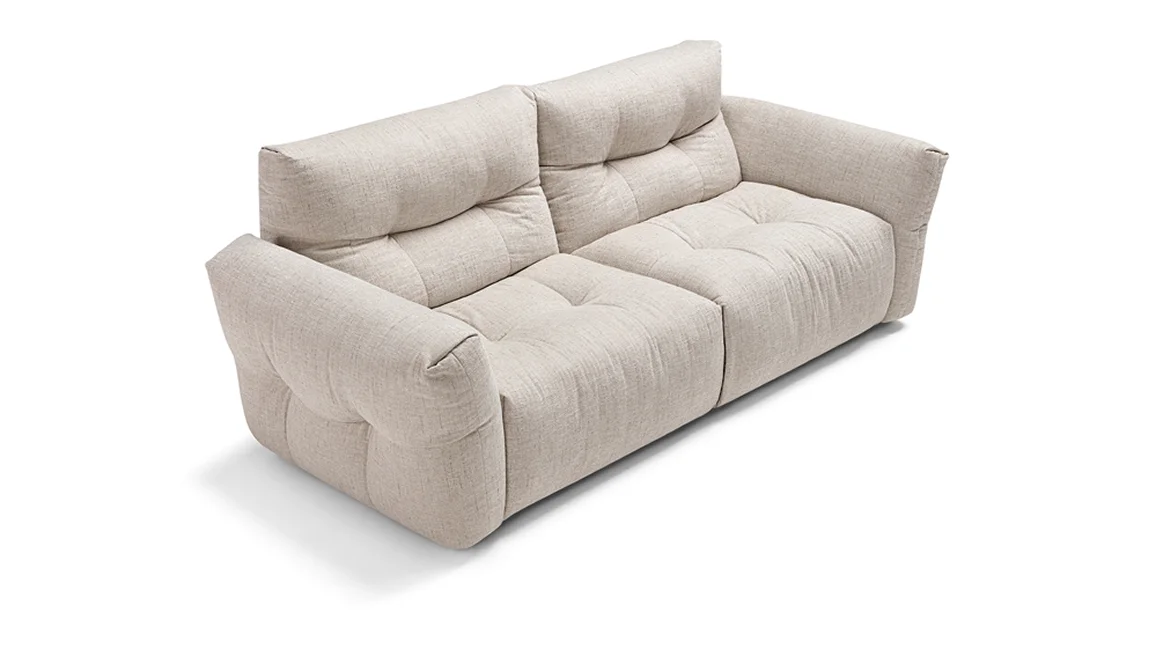 At the mere sight of it, with a cosy and comfortable mood, the Sorriso modular sofa proves to be the ideal size while having a relaxing break, thanks to its mix of feather and polyurethane foam padding. Thought with its ample and vaporous volumes, to dominate the living room, this model is offered in different configurations ranging from three-seater to a corner group, thanks to the insertion of a square pouff that acts as a connection. Upholstred with a linen-blend fabric in natural tones of iridescent white, but also available in leather, Sorriso is distinguished by its sartorial details, quilted areas but also by the special fabric flaps at the ends of the armrests and backrests.