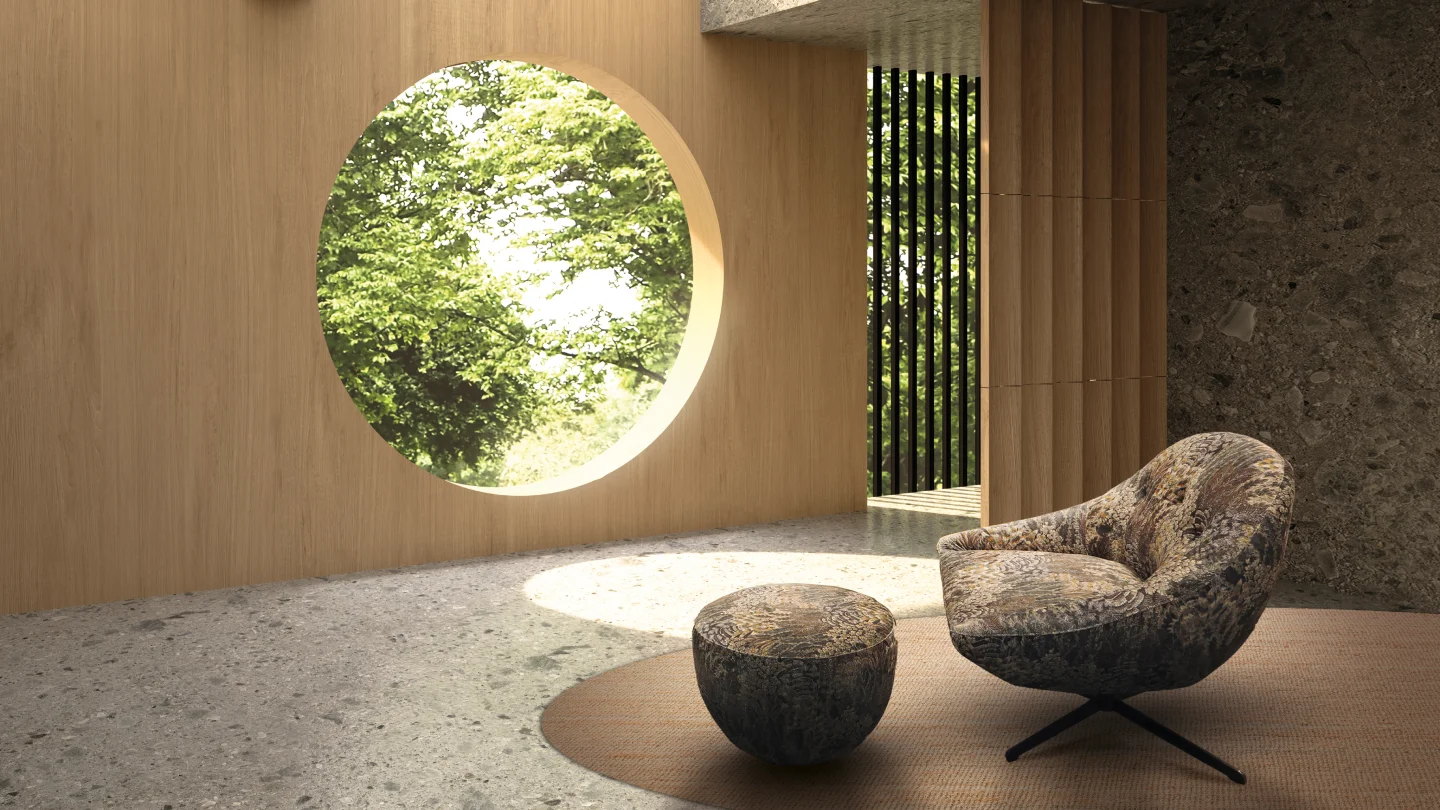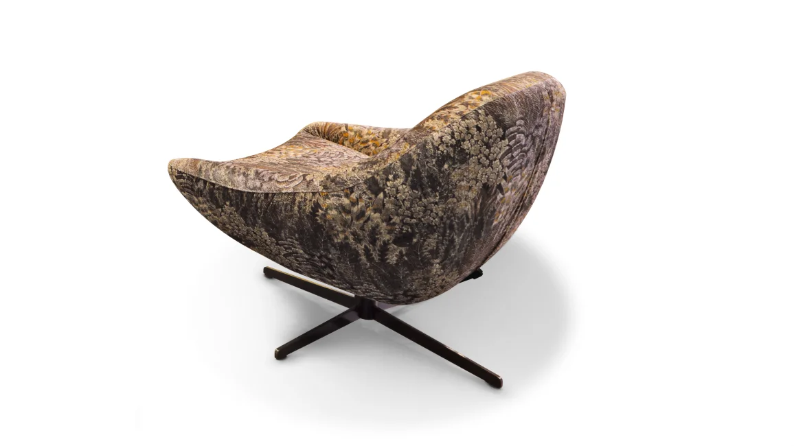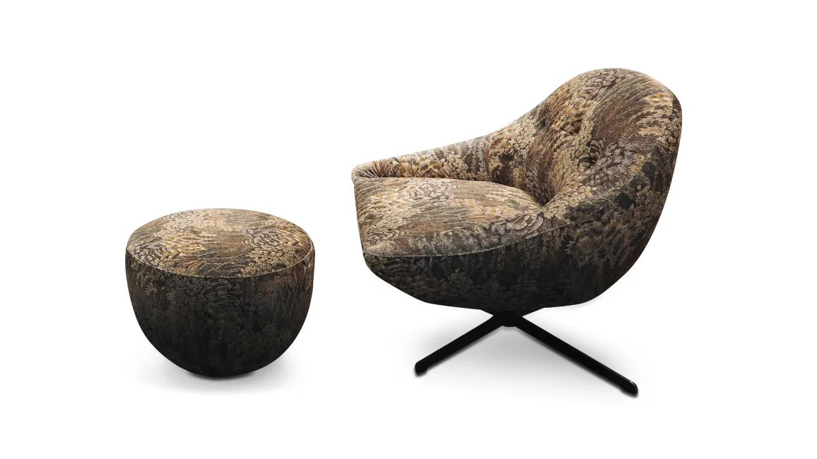 Diva, the language of comfort: The Curve swivel armchair has a strong personality, a new way of living everyday life in total relaxation and well-being; combined with the pouf, it becomes even more welcoming.