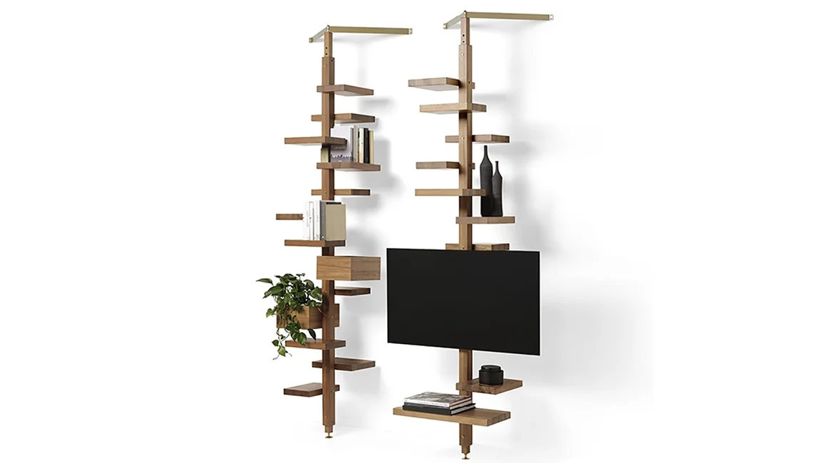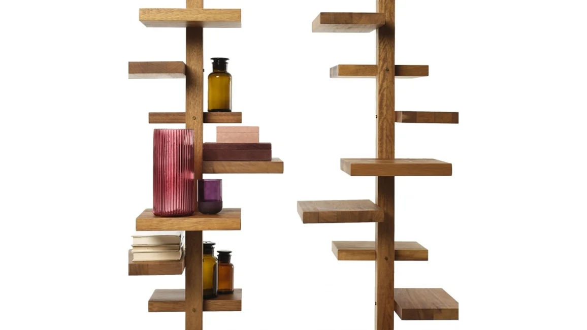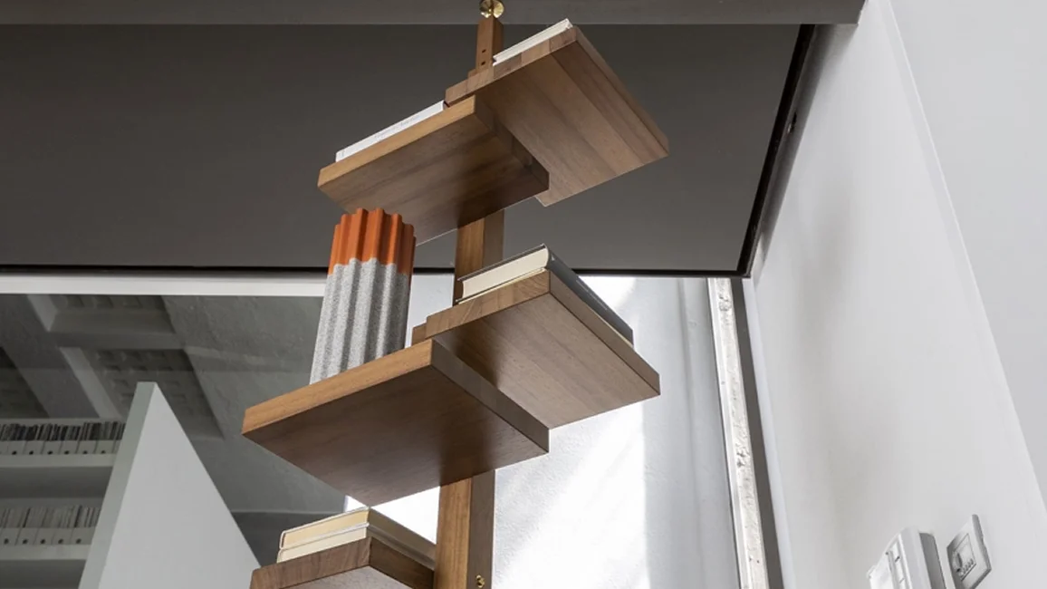Adelaide is an etagere with structure in solid Ash wood died Iroko. It is complete with 13 shelves, designed for ceiling fixing (ceiling height from 236 cm to 344 cm). It is an elegant, floor to ceiling bookcase with a square-based revolving column to which the shelves of two different sizes (20x30 cm, 25x30 cm) are fixed asymmetrically on 4 sides.