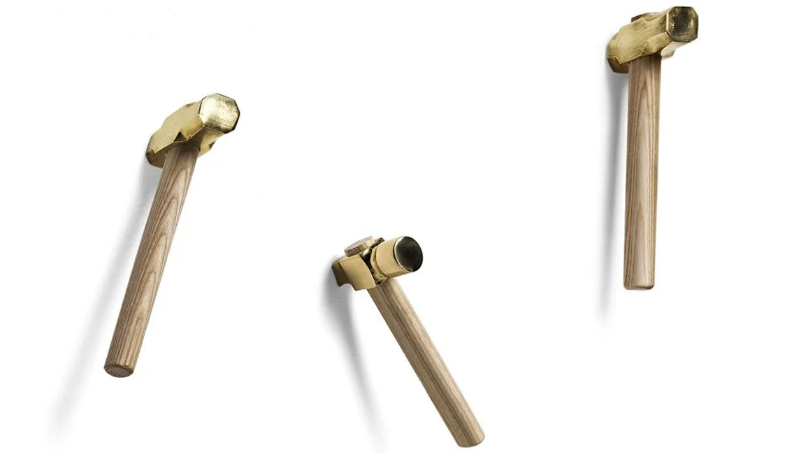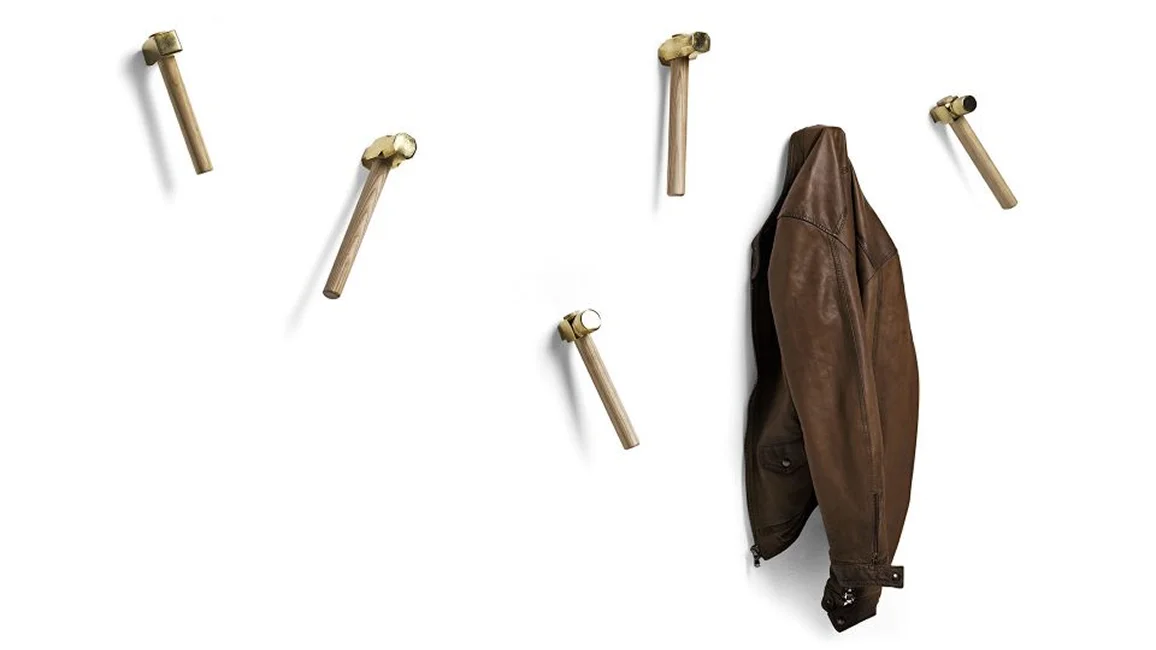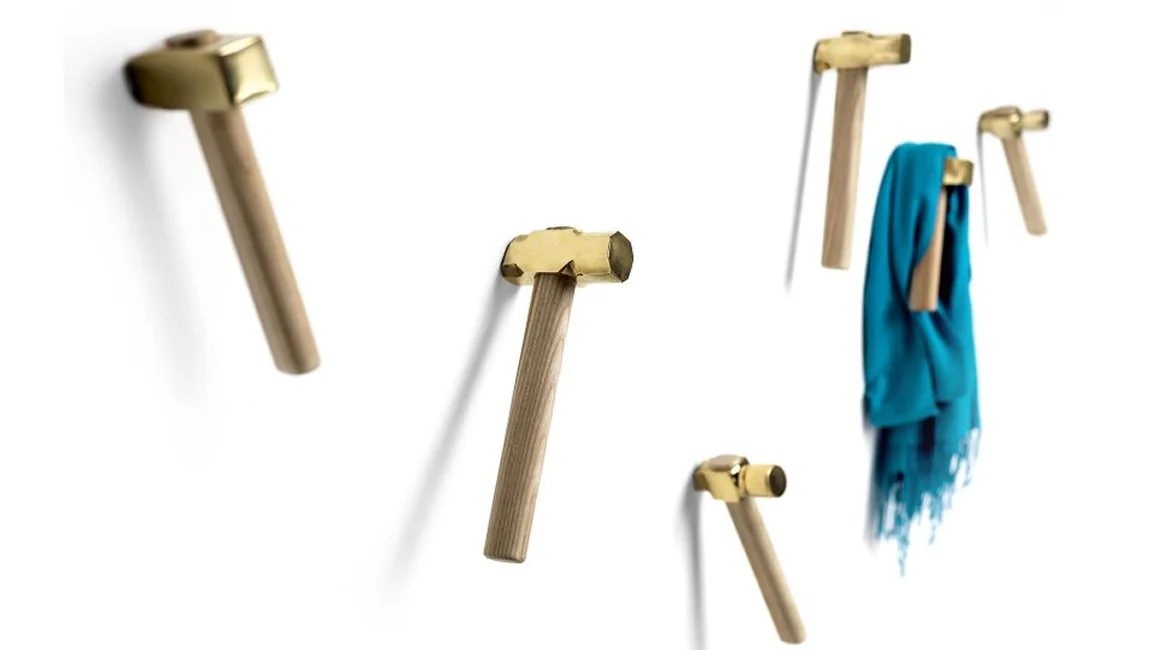 Bastaaa is a coat hanger with olive natural ash handle and top in cast brass polished finish. Bastaaa is a tool attached to a gesture: linked to a precise gesture, to hammer, to nail, to break a piggy bank or to hit anything that we want to break, and when we are angry we would like to own a hammer to destroy the printer that doesn’t work! A hanger ironic that decorate your wall with playful style. Also available the mirror with hammers coat hanger.
