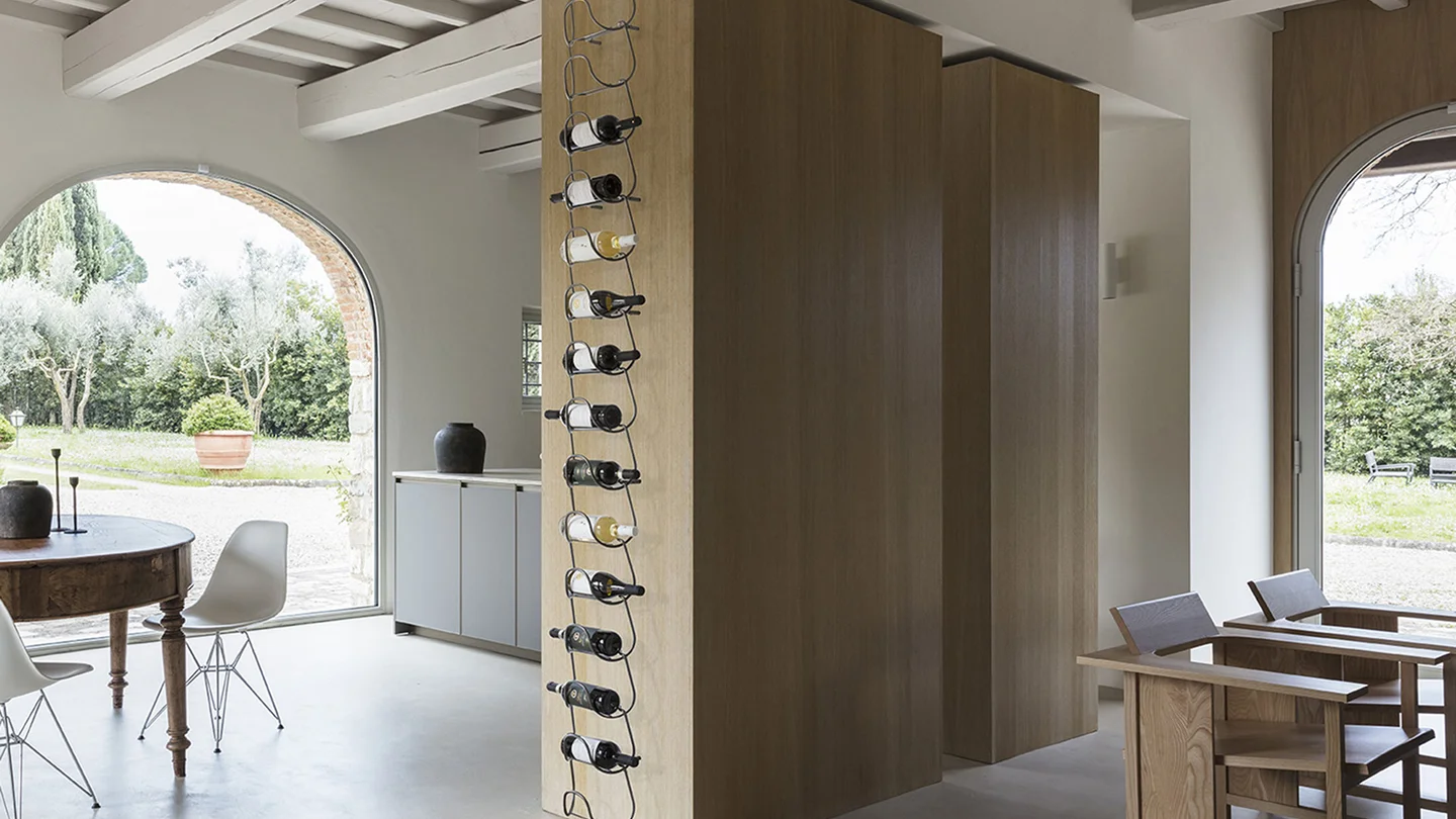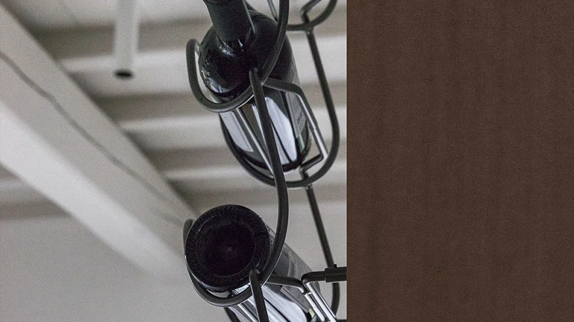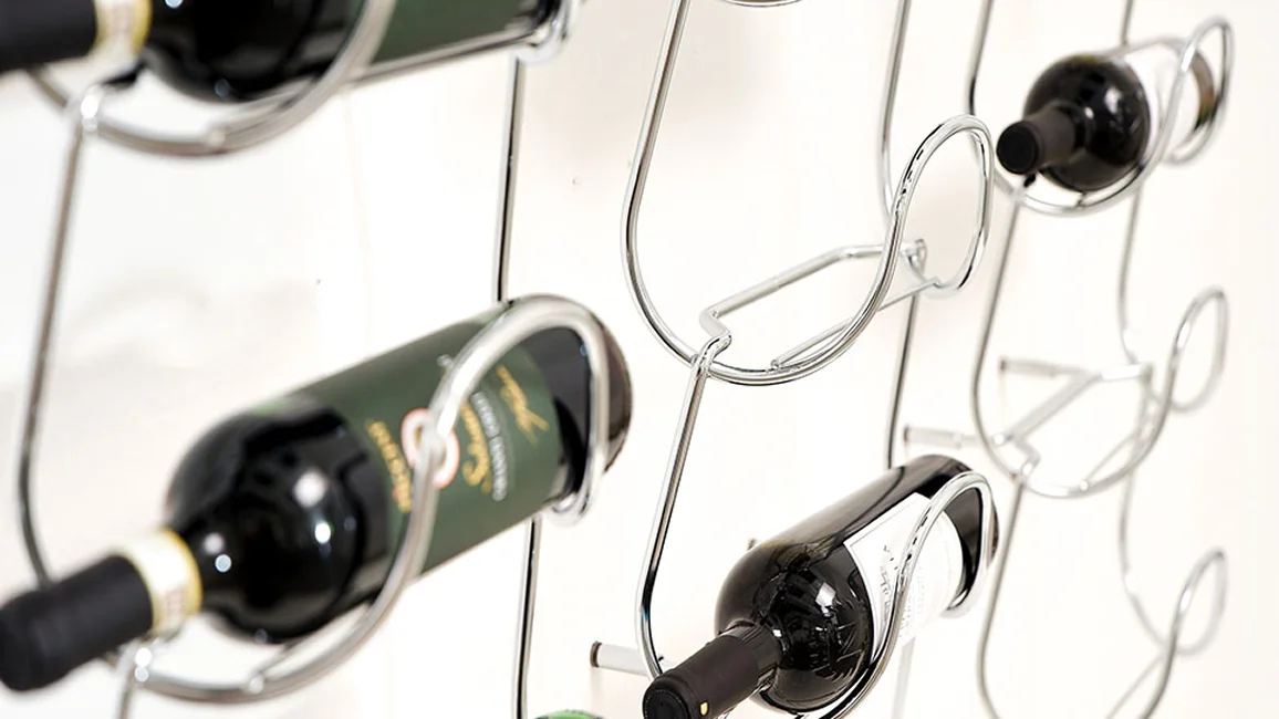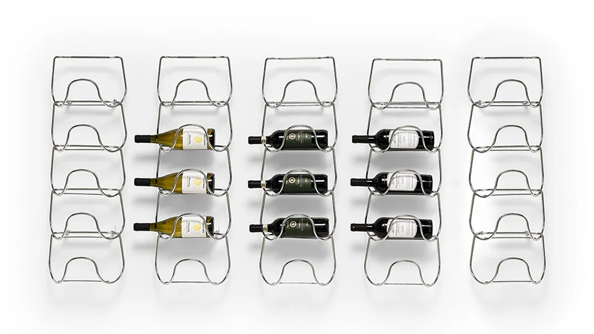Metal bottle holder that comes from a single element and its repetition. An innovative and versatile solution, capable of accommodating bottles of different shapes and sizes, from the most common to the less conventional. Available in the finishes: burnished and chrome.