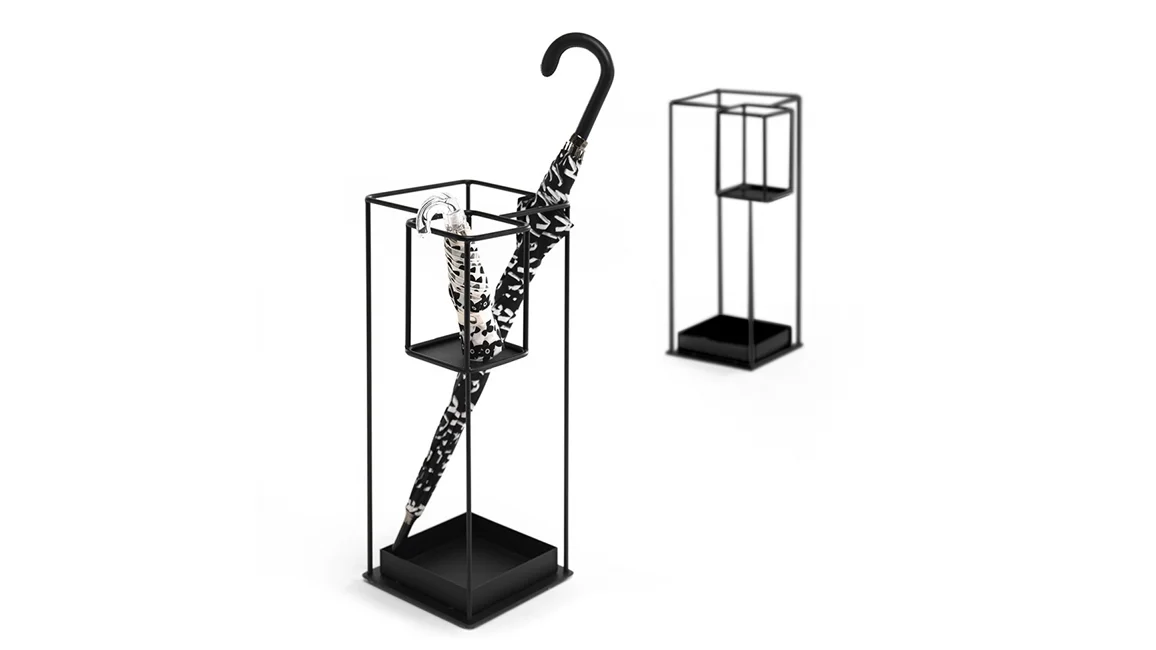Duo is an umbrella stand made of black painted metal. It is a useful accessory with simple lines where you can place both the classic umbrella and the folding one.