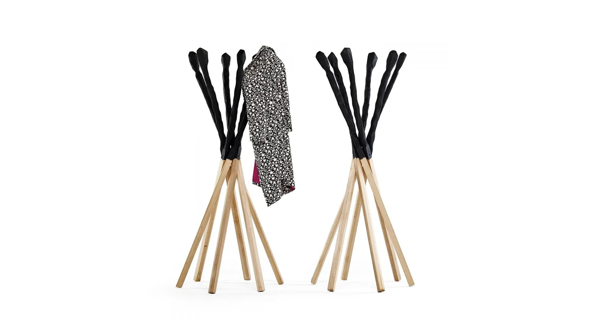 Match is a coat hanger in solid beech in black stained finish and natural oil. Match wants to remember the match consumed by the flame. Six wooden sticks joined together to compose a practical and ironic coat stand.