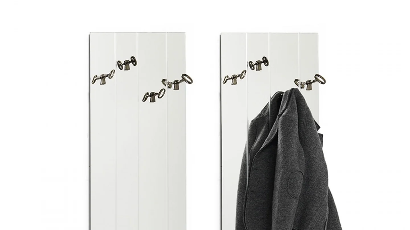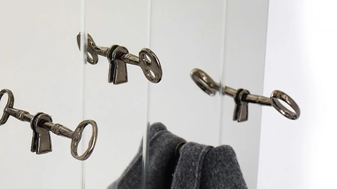 Memorie is a set of 4 clothes hanger keys in cast brass with black nickel finish. Old-style keys with a renewed and surprising way of use, can be fixed to the wall freely at will. Also available on a mirror.