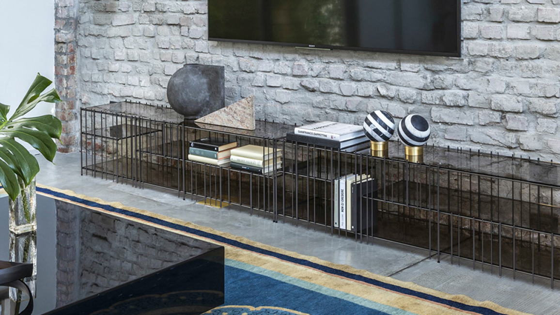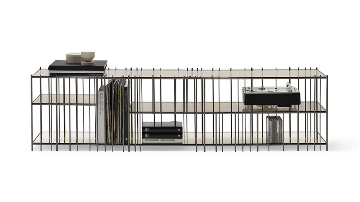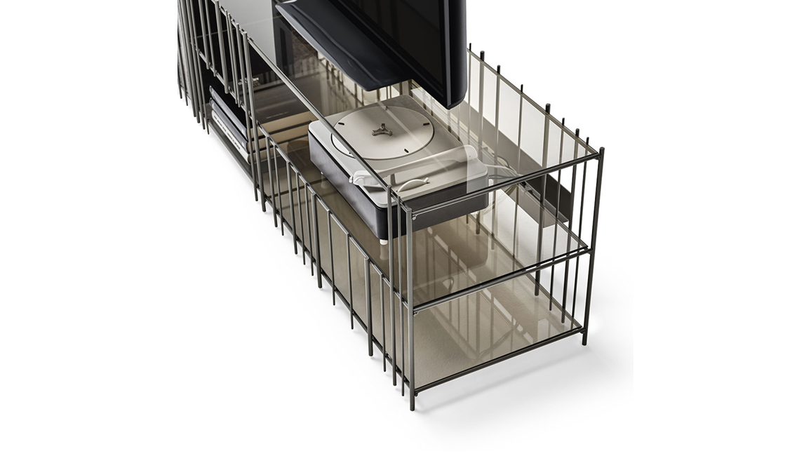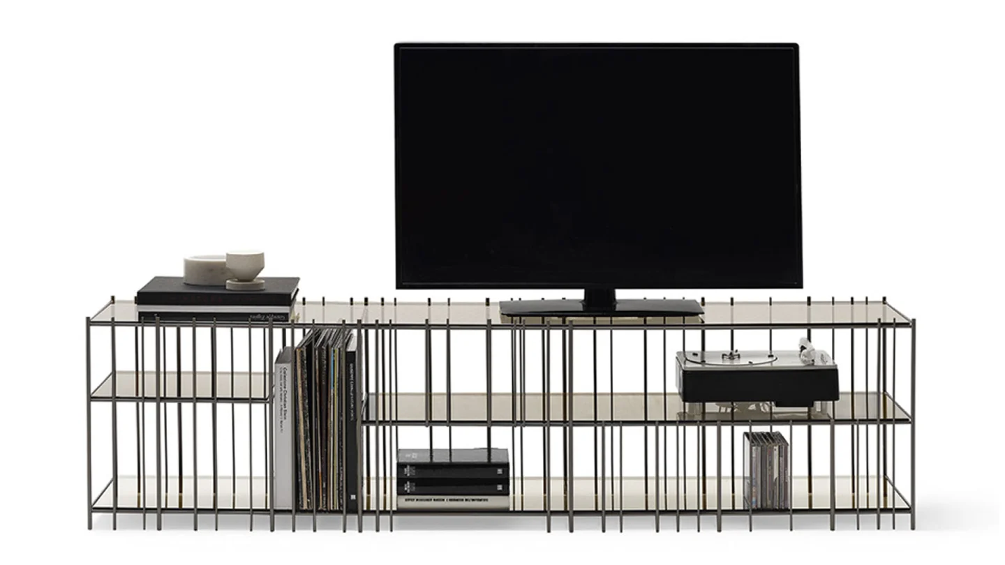 Metrica TV unit in metal with a simple structure whose the rhythm is marked by iron rods fixed at different intervals where the objects complete the shape writing new compositions from time to time.