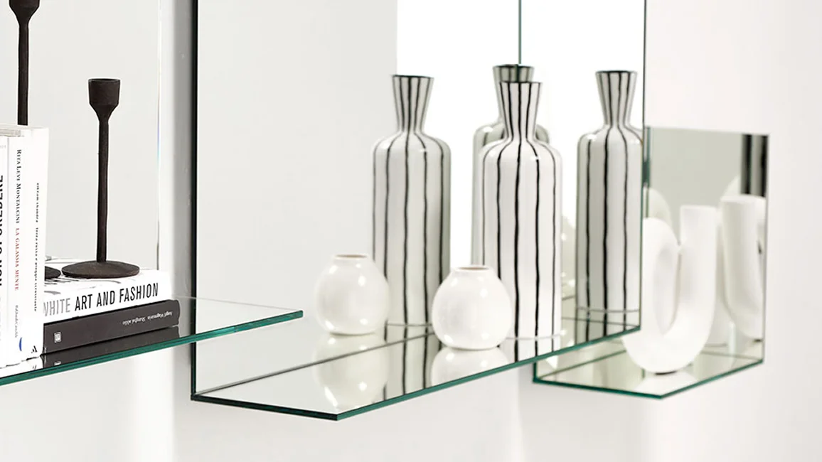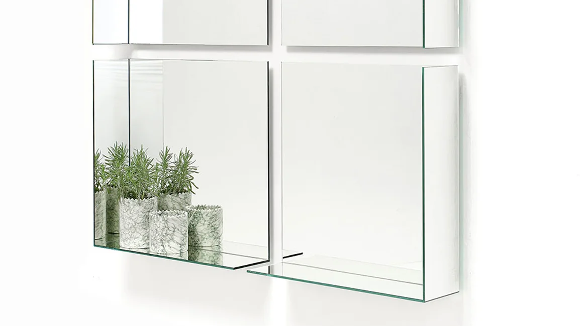 Narciso is a square mirror composed of simple reflective surfaces and real spatial volumes. Completely mirrored, it captures the surrounding space, multiplies it infinitely and creates unexpected perspective games where reality merges with illusion. Designed to accommodate objects, they transform the mirror into a practical and versatile furnishing element.