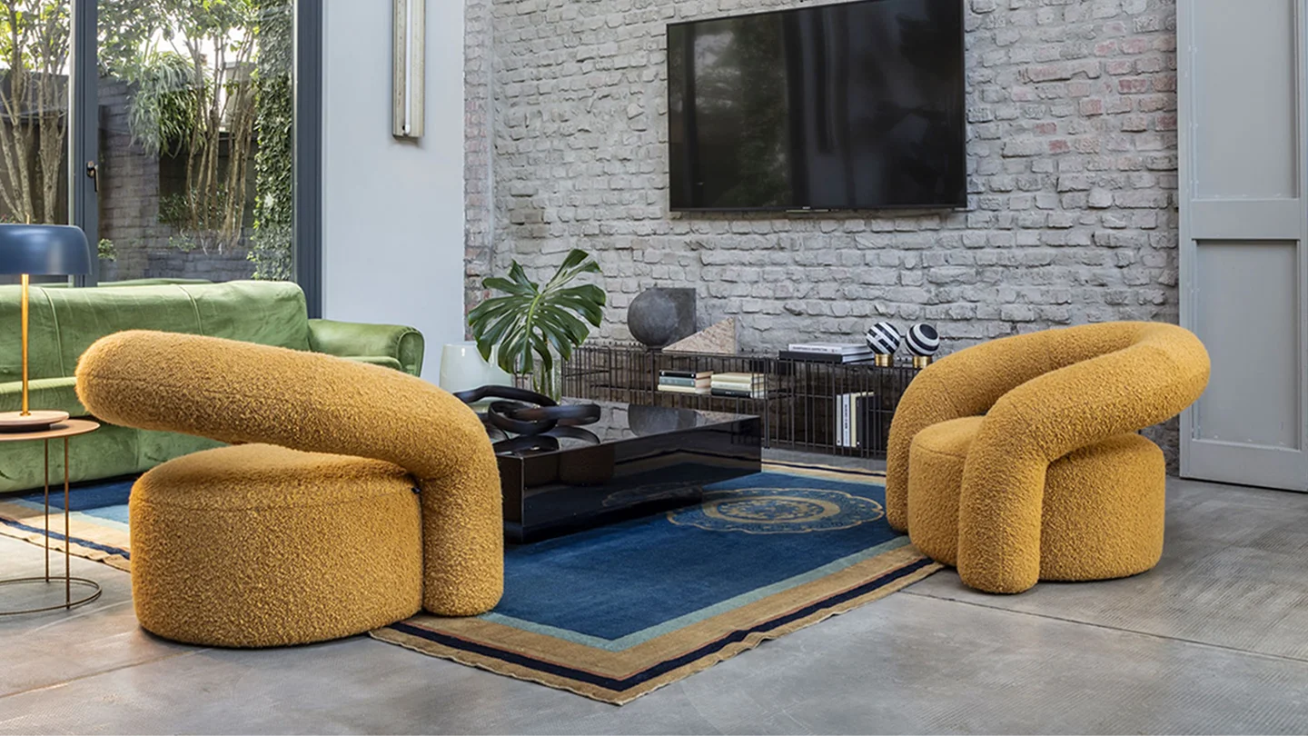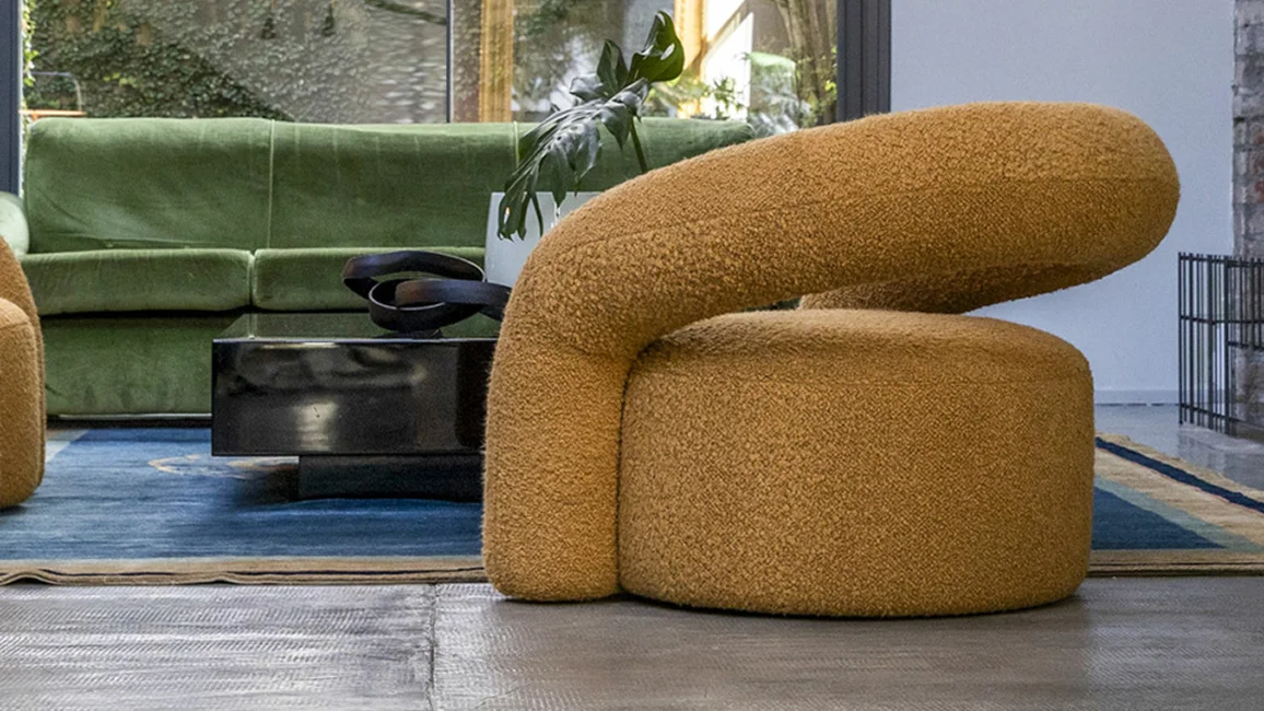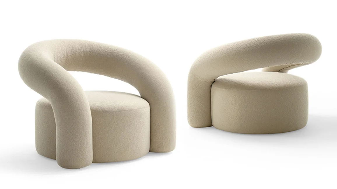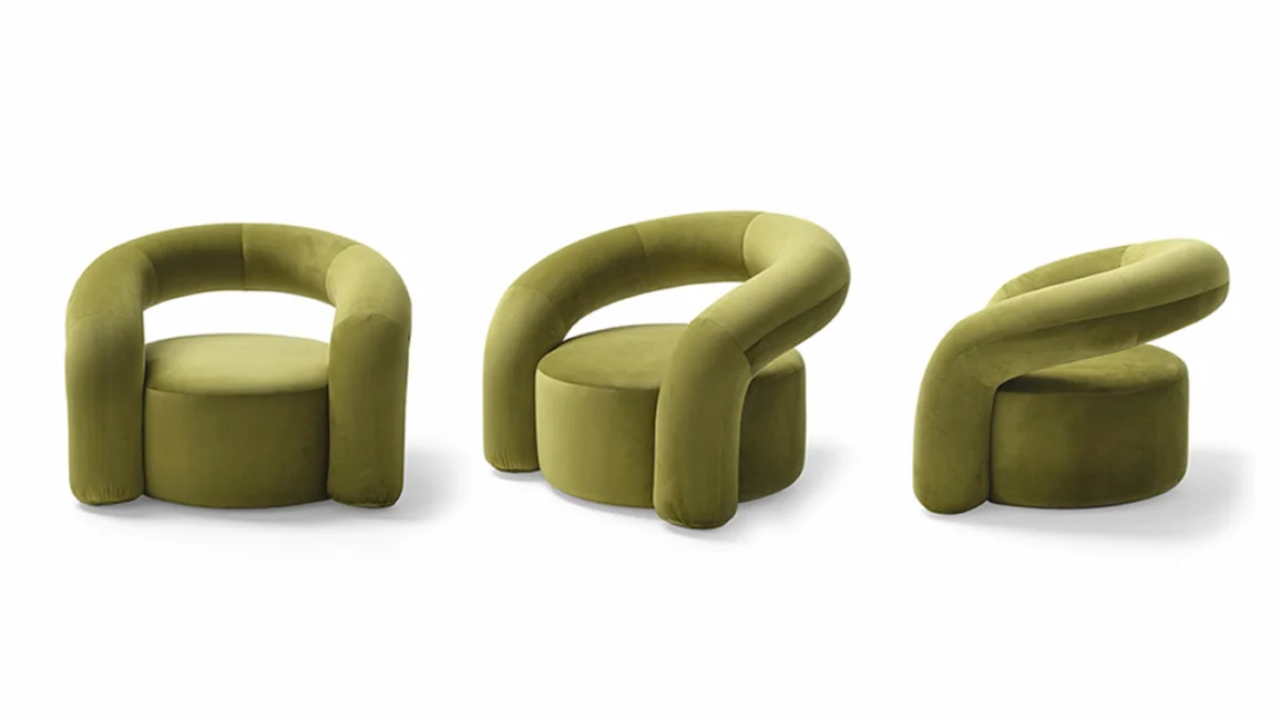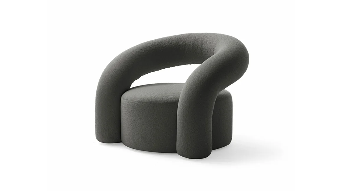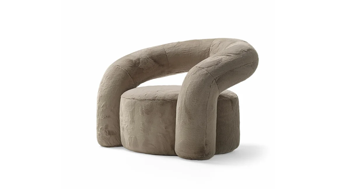 Nora is a padded armchair with a curved plywood structure with soft and welcoming shapes that recall an abstract and utopian, almost fairy-tale world. Its appearance is reassuring and sturdy.