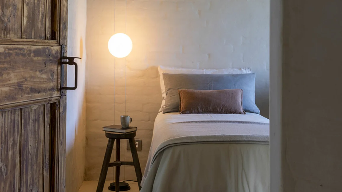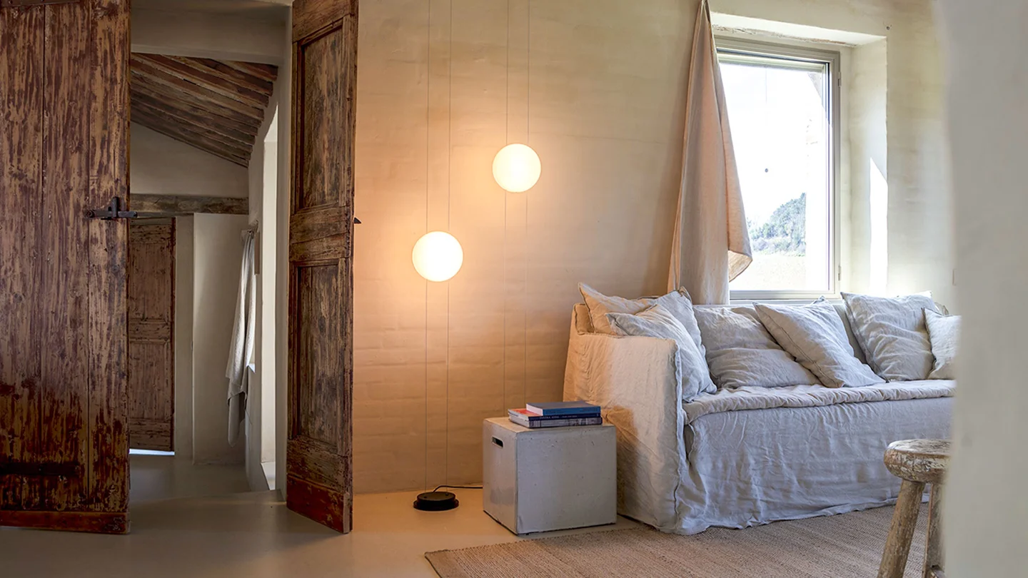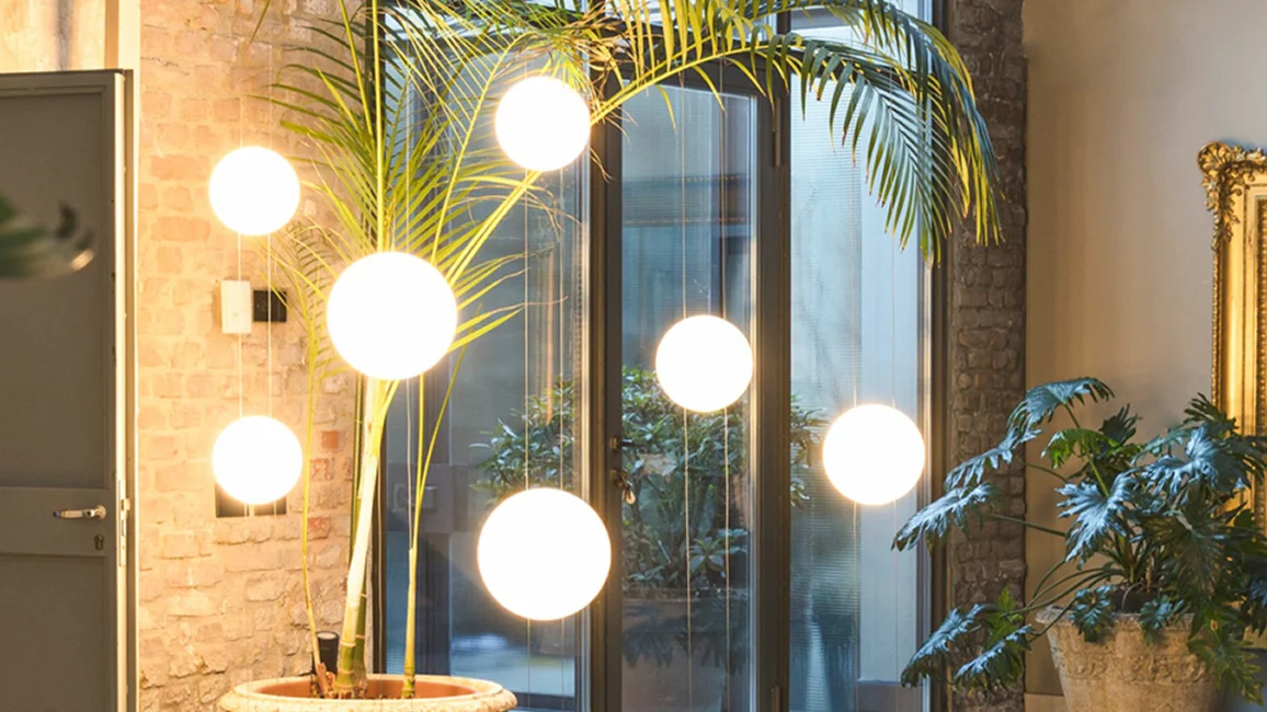 Ceiling floor lamp with diffused light. The spherical diffuser slides on parallel cables that cross it like tracks connected from the ground to the ceiling. The absence of a power cable makes Orbita's design extremely clean and essential. Like the sun rising and setting, the Orbita lamp can be adjusted in height and light intensity to create different lighting scenarios.