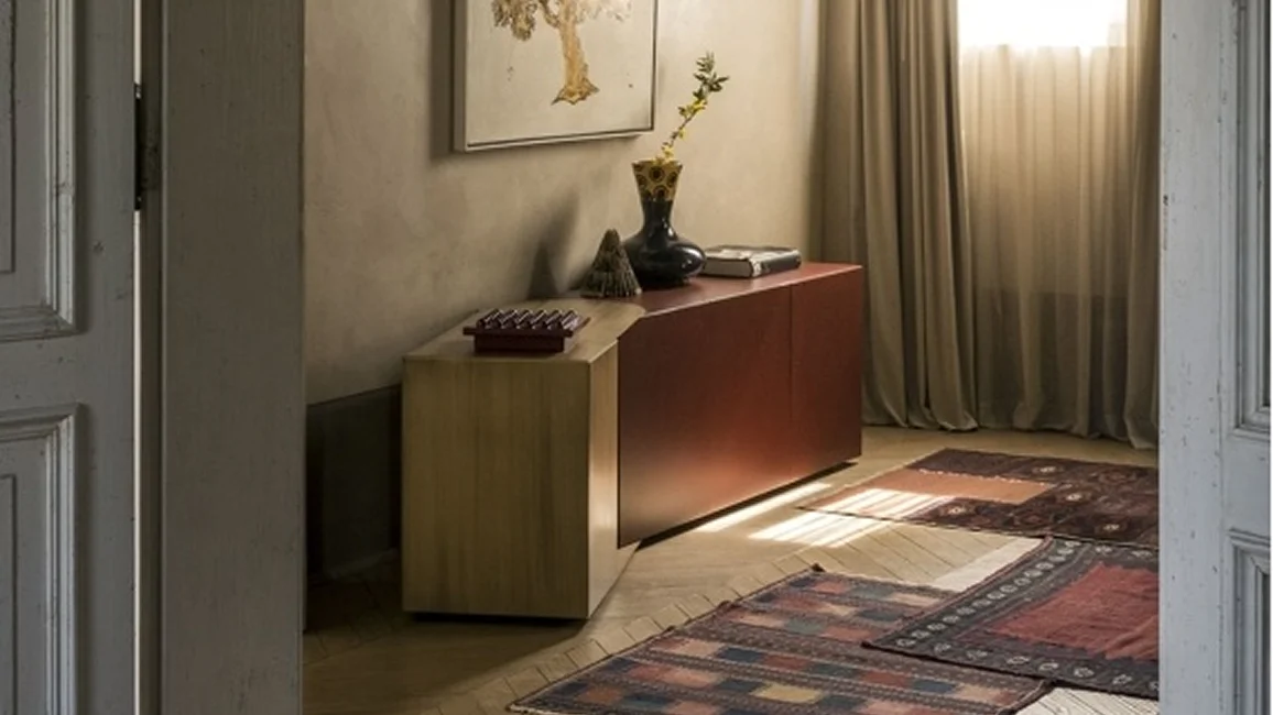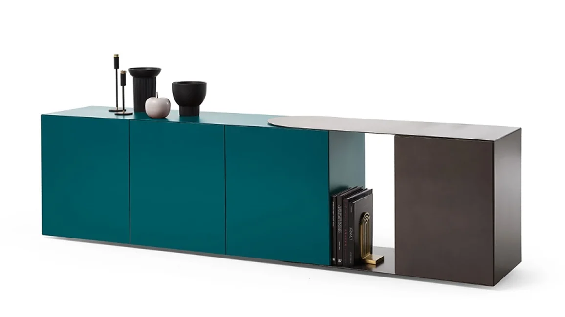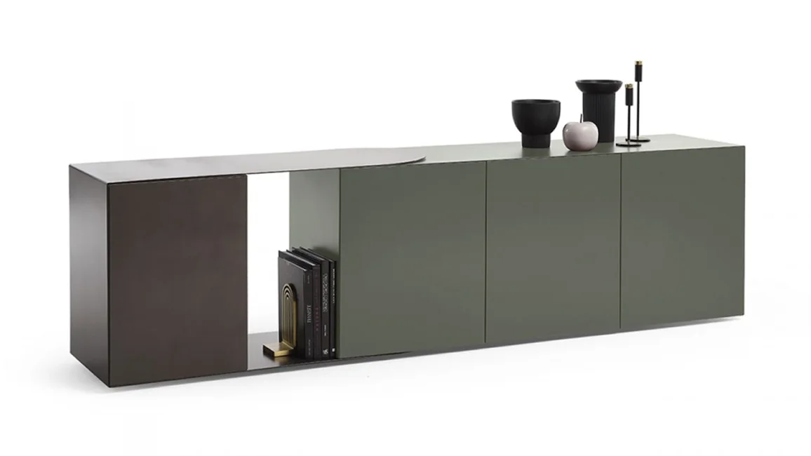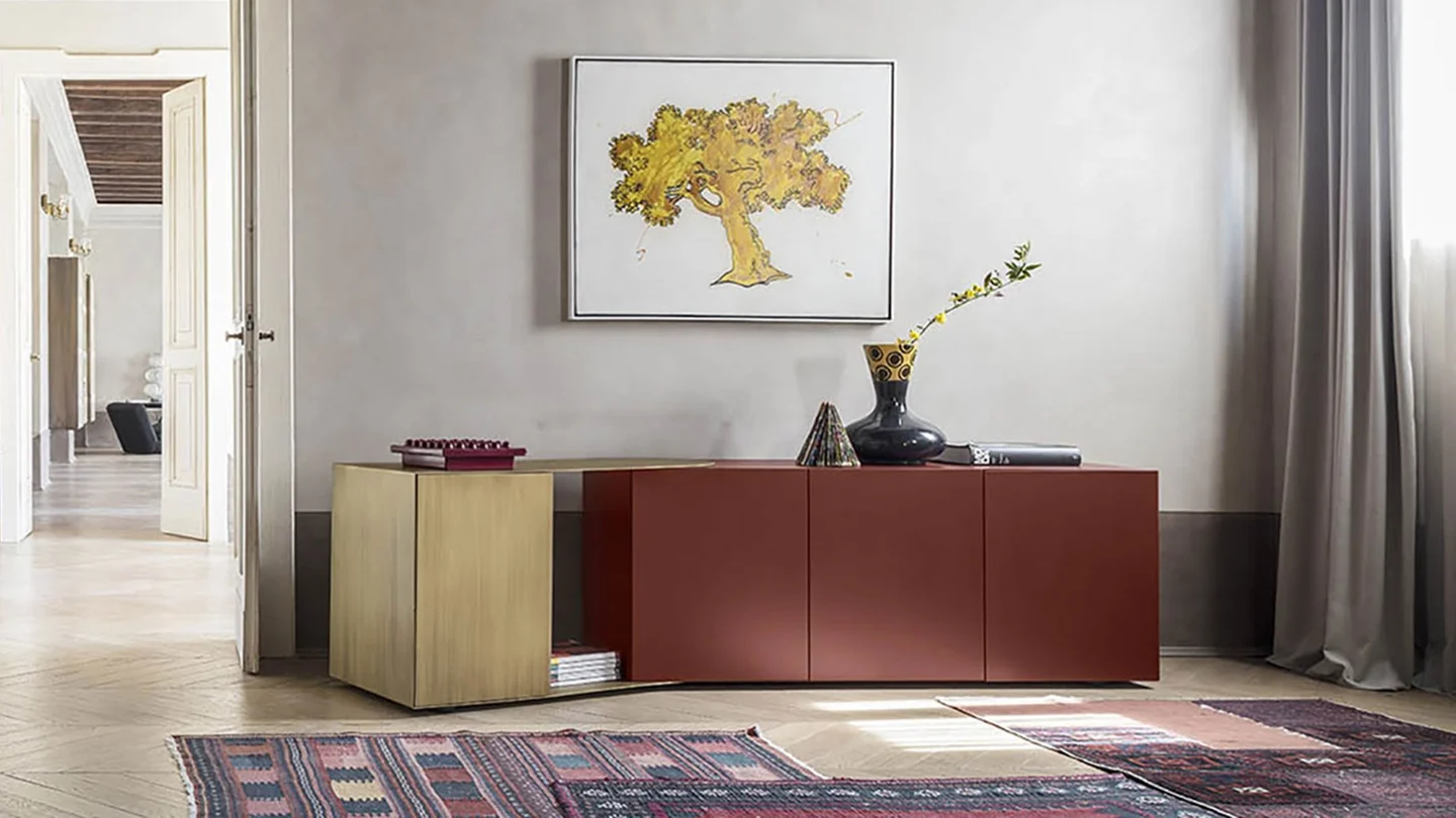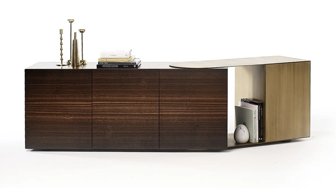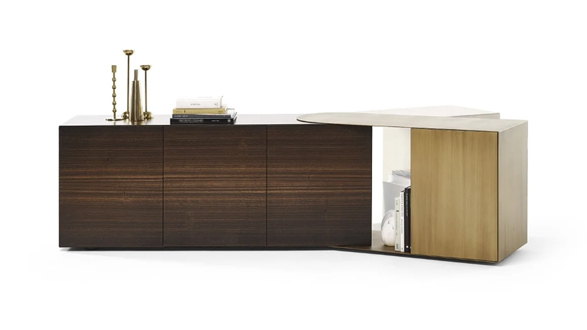 Partout wall unit and Partout sideboard, are storage units with the structure in mdf lacquered in all colors as per sample card or plated with smoked Eucalyptus wood and adjustable metal element in burnished finish or patinated bronze. Both storage units with a linear and geometric design with open and closed volumes. can give rise to both rectilinear shapes and corner solutions. In fact, thanks to the adjustable metal element Partout can follow open and closed corners creating continuity on the walls.