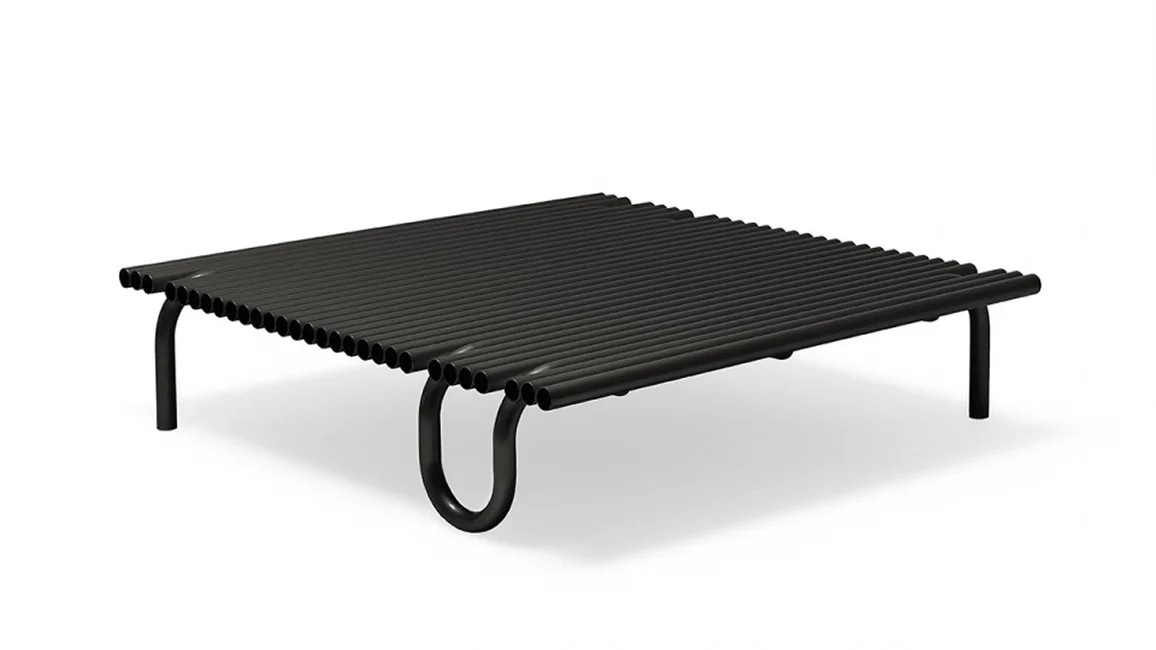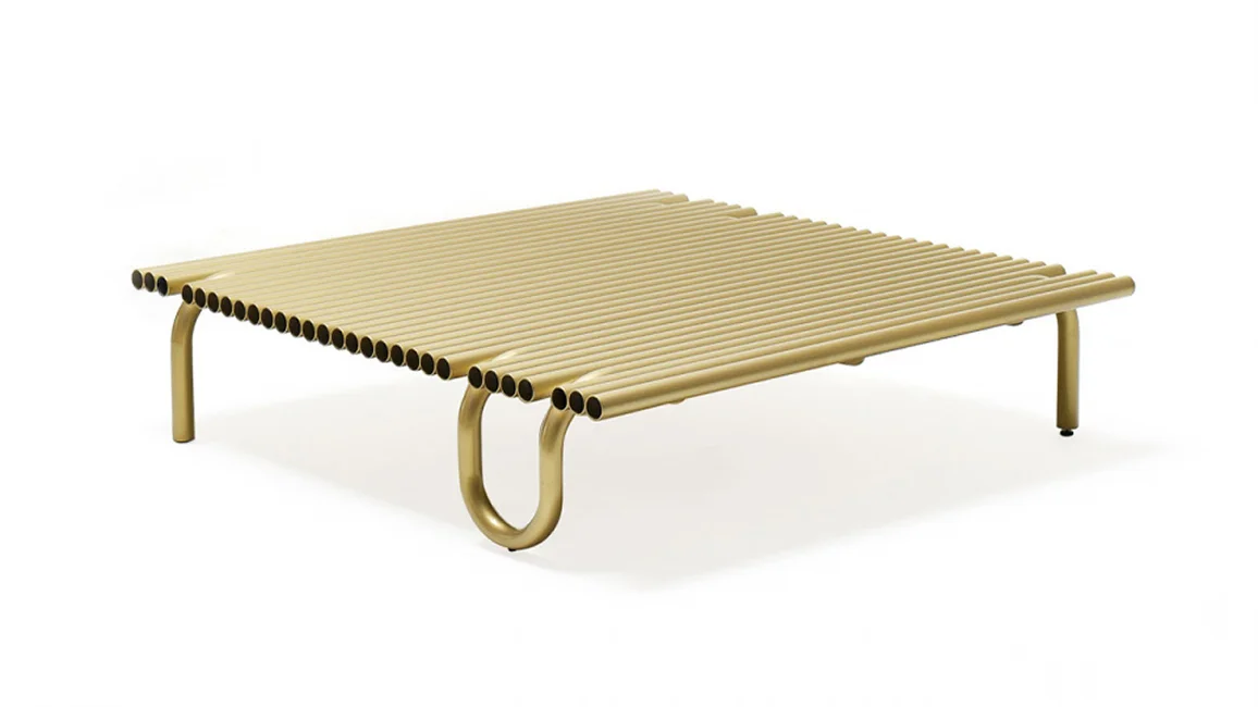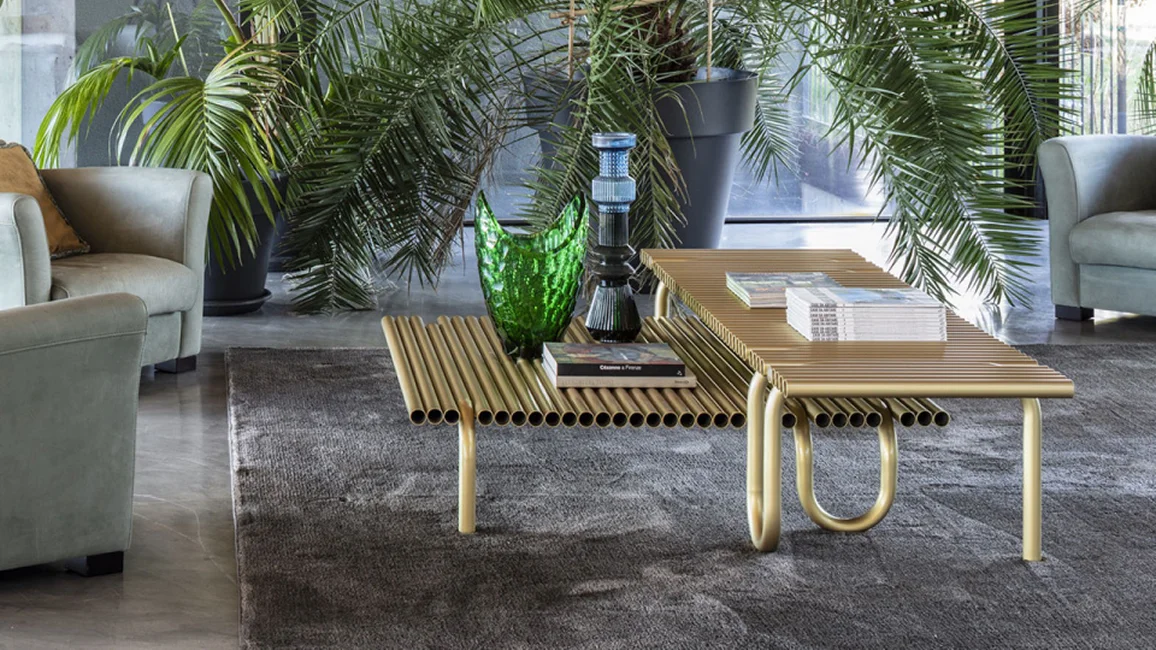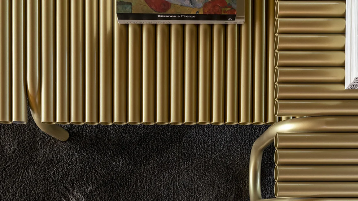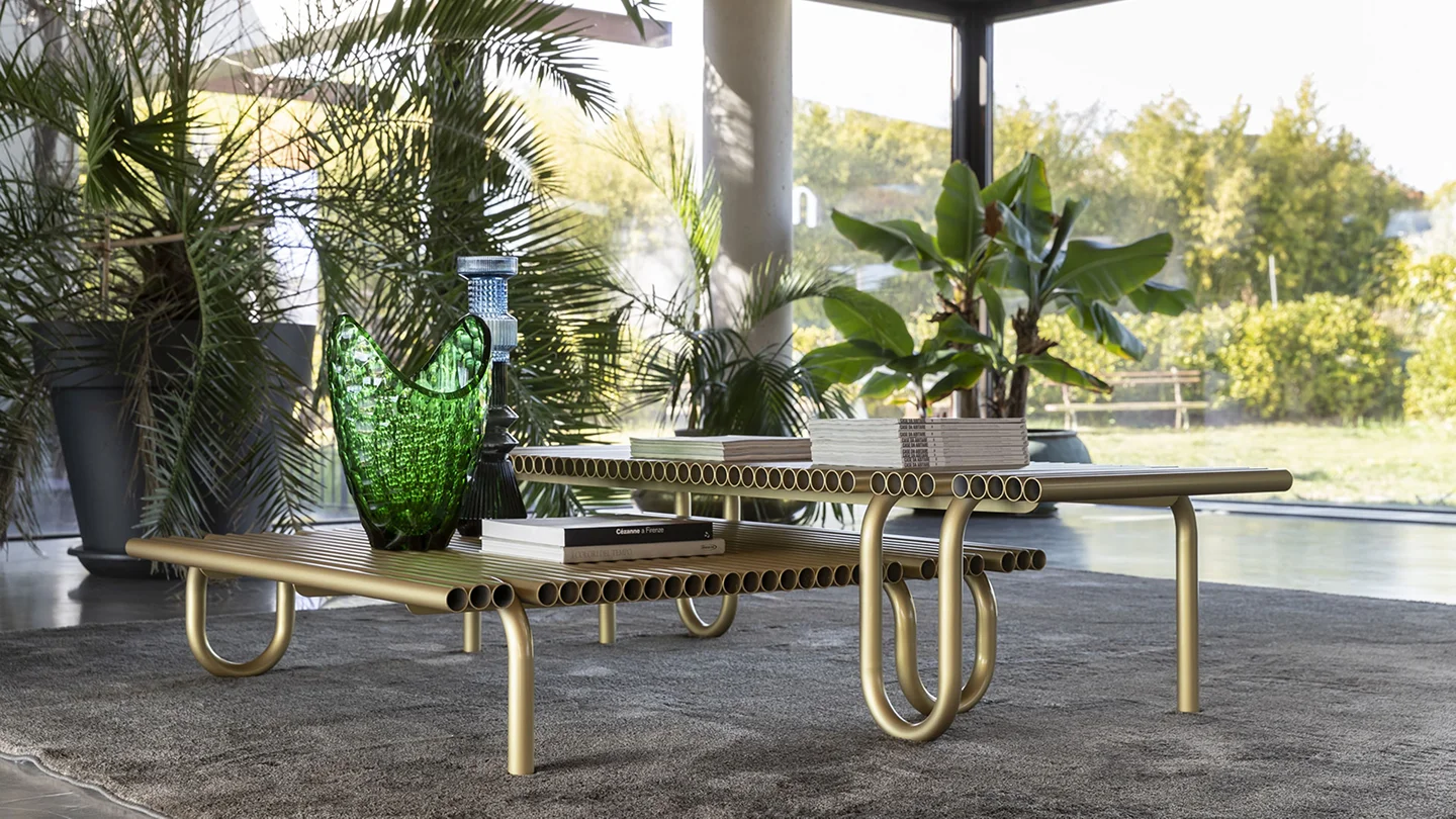 Metal coffee tables and consoles characterized by a strong graphic sign and a strong personality. Essential lines and well-known geometries. The surfaces created through the repetitive rhythm of the metal tubes create lightness and solidity at the same time. Together with the console to be fixed to the wall, the square and rectangular coffee tables furnish with elegance.