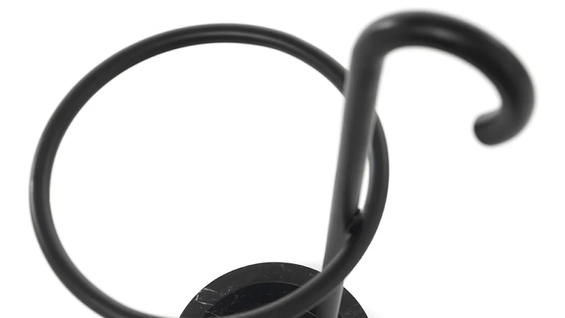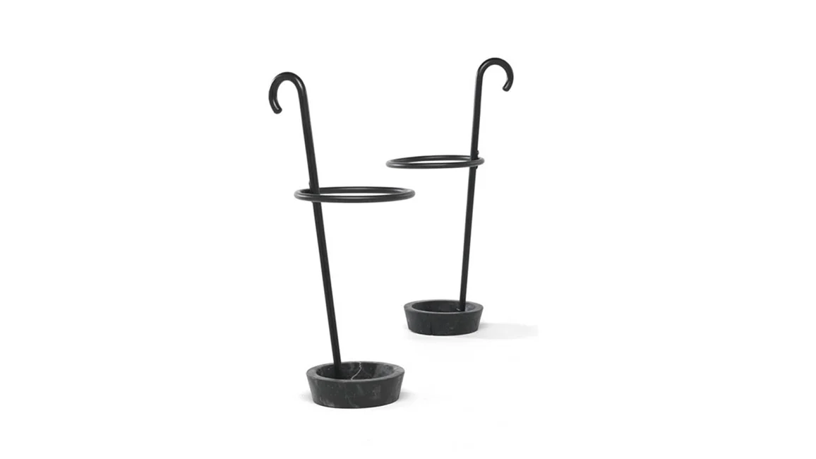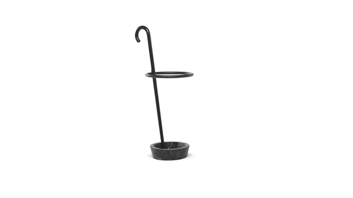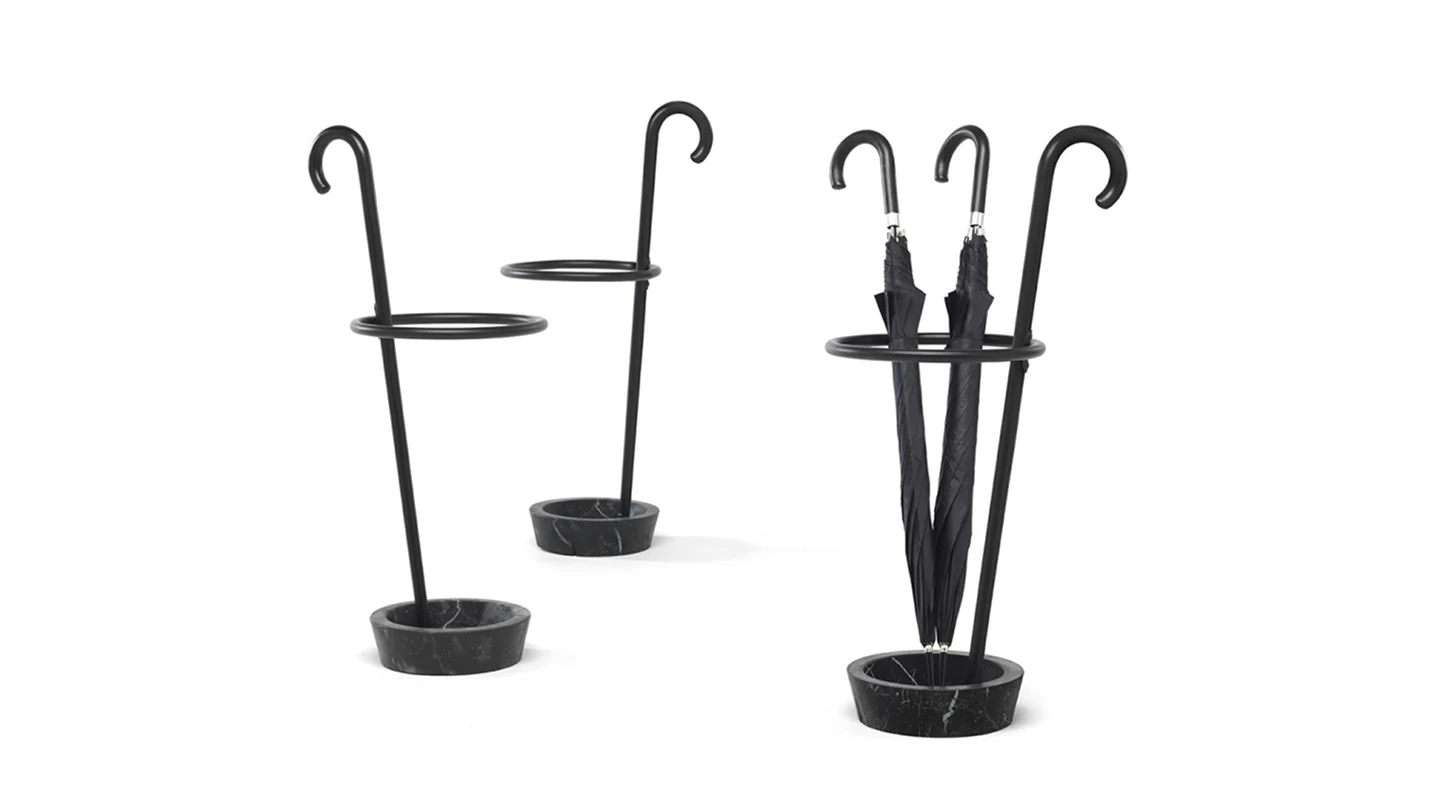 Renè is an umbrella stand in curved beech wood, available with a base in black Marquina marble or in gray resin. The stick is available in mud or black stained wood. Renè is an umbrella stand with a hint of magic: a central stick inspired by Magritte, the circle that recalls those used in the circus world or by dancers as hula hoops, elements that refer to a well-known world and reassuring images. Renè has a strong identity: an object that tells a story, and does it with irony.