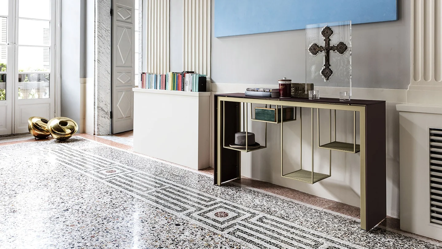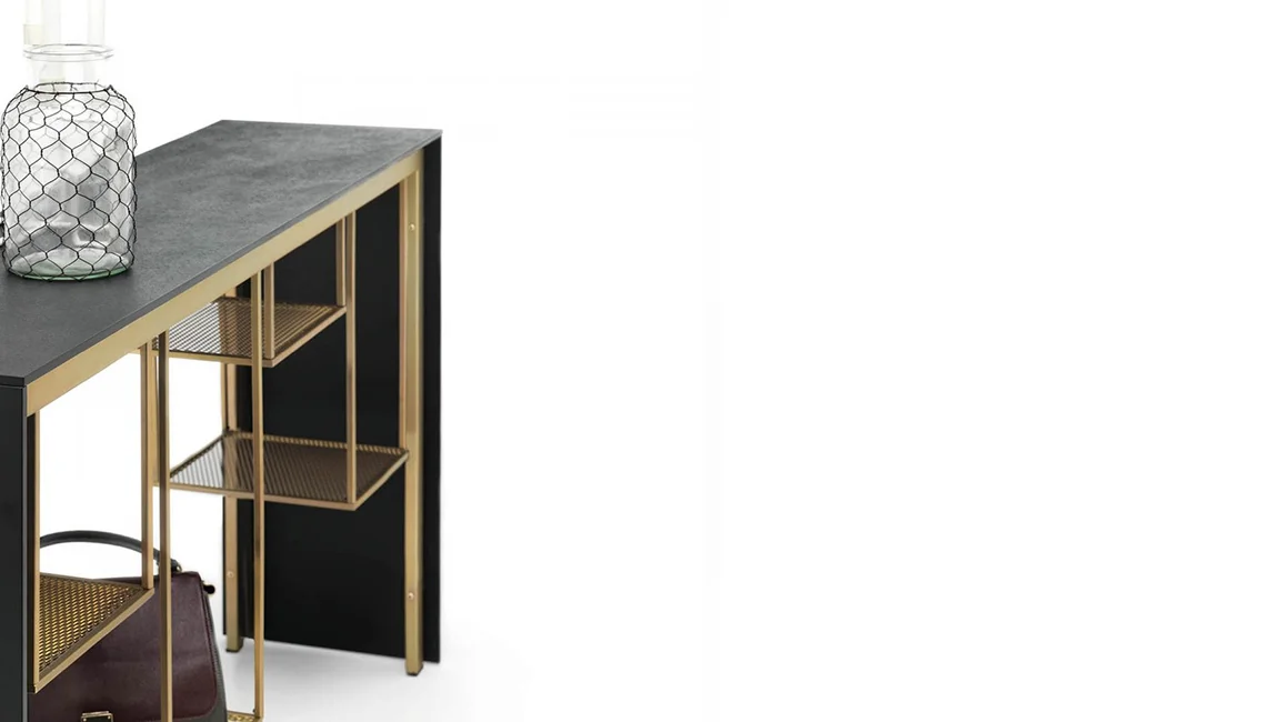 Tokyo is a console and also a bench. Metal structure and shelves in expanded metal painted matt gold, top and sides in black Valcromat. Practical element, equipped with usable support surfaces hung under the top, minimal and rigorous.